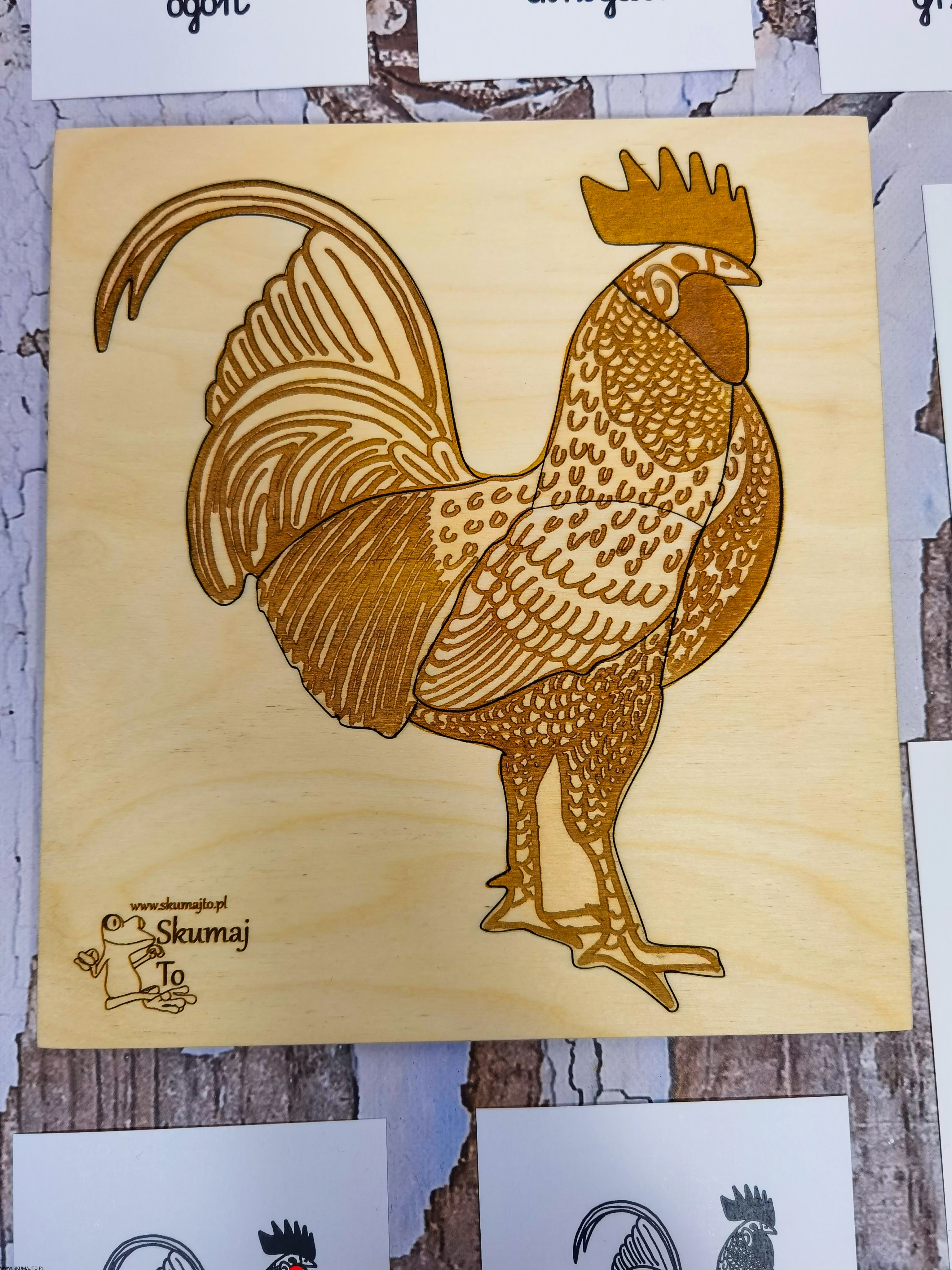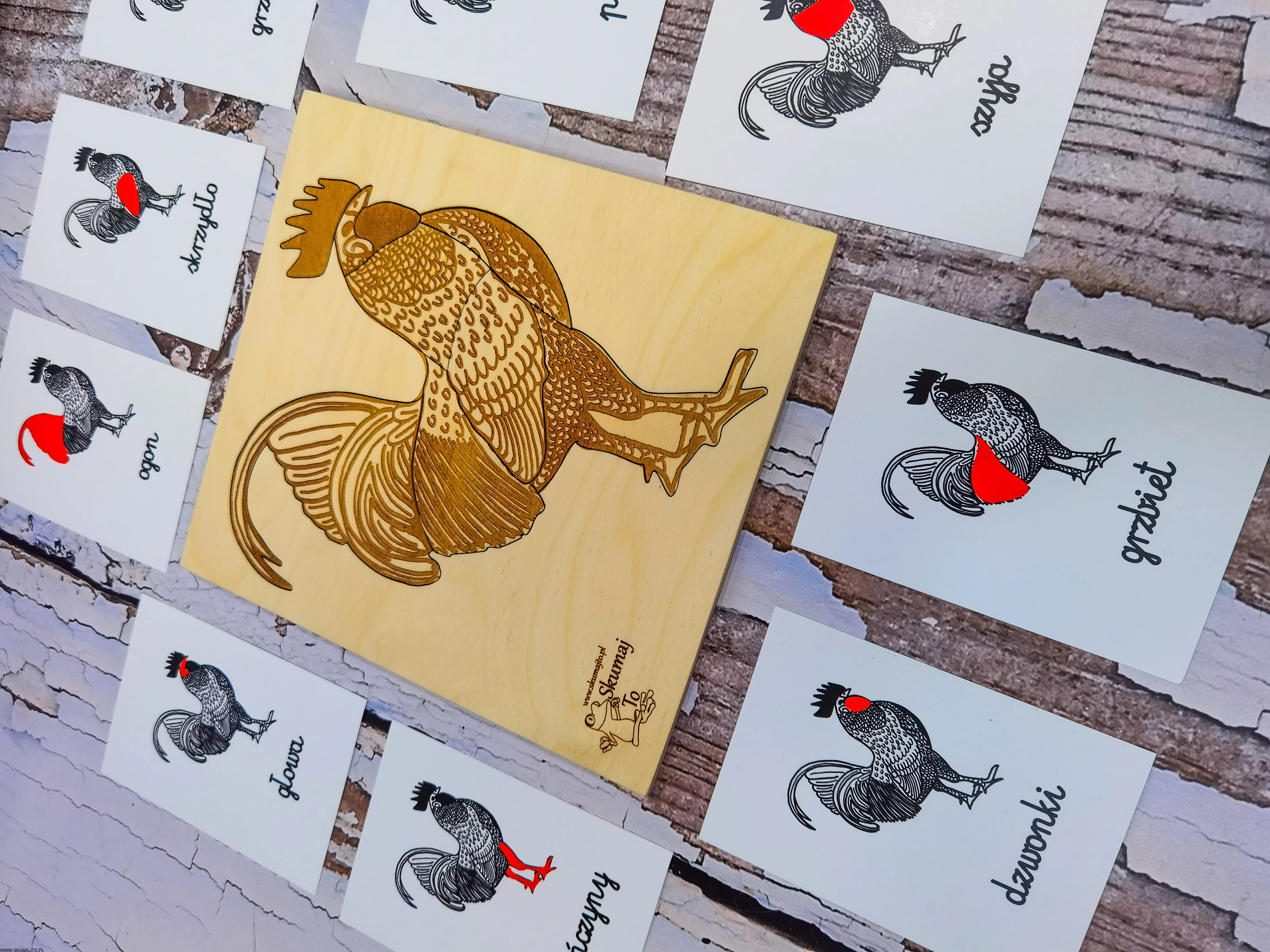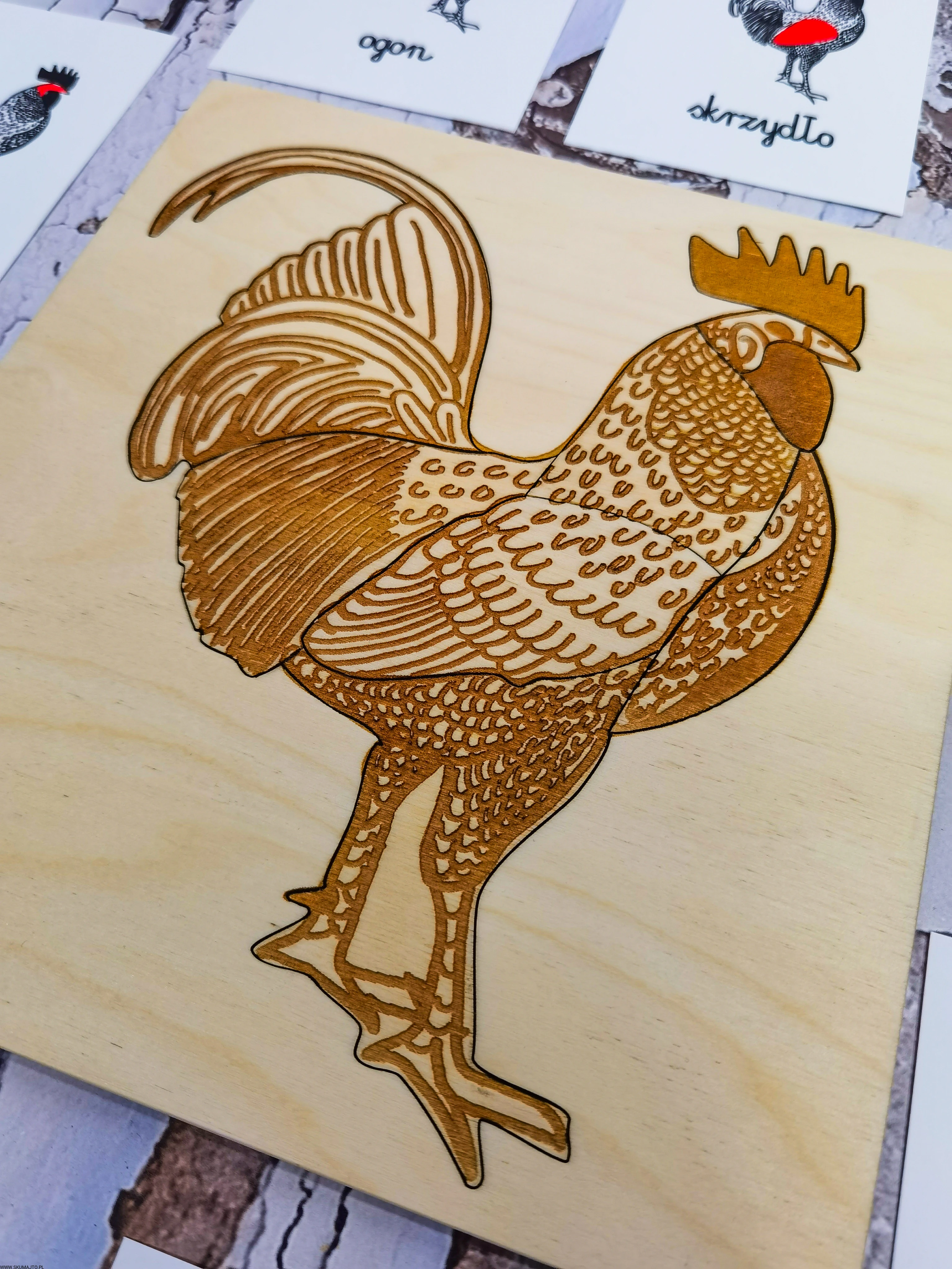 - Podstawa: Wymiary 24x26x1 cm, ze szkieletem koguta do układania elementów.