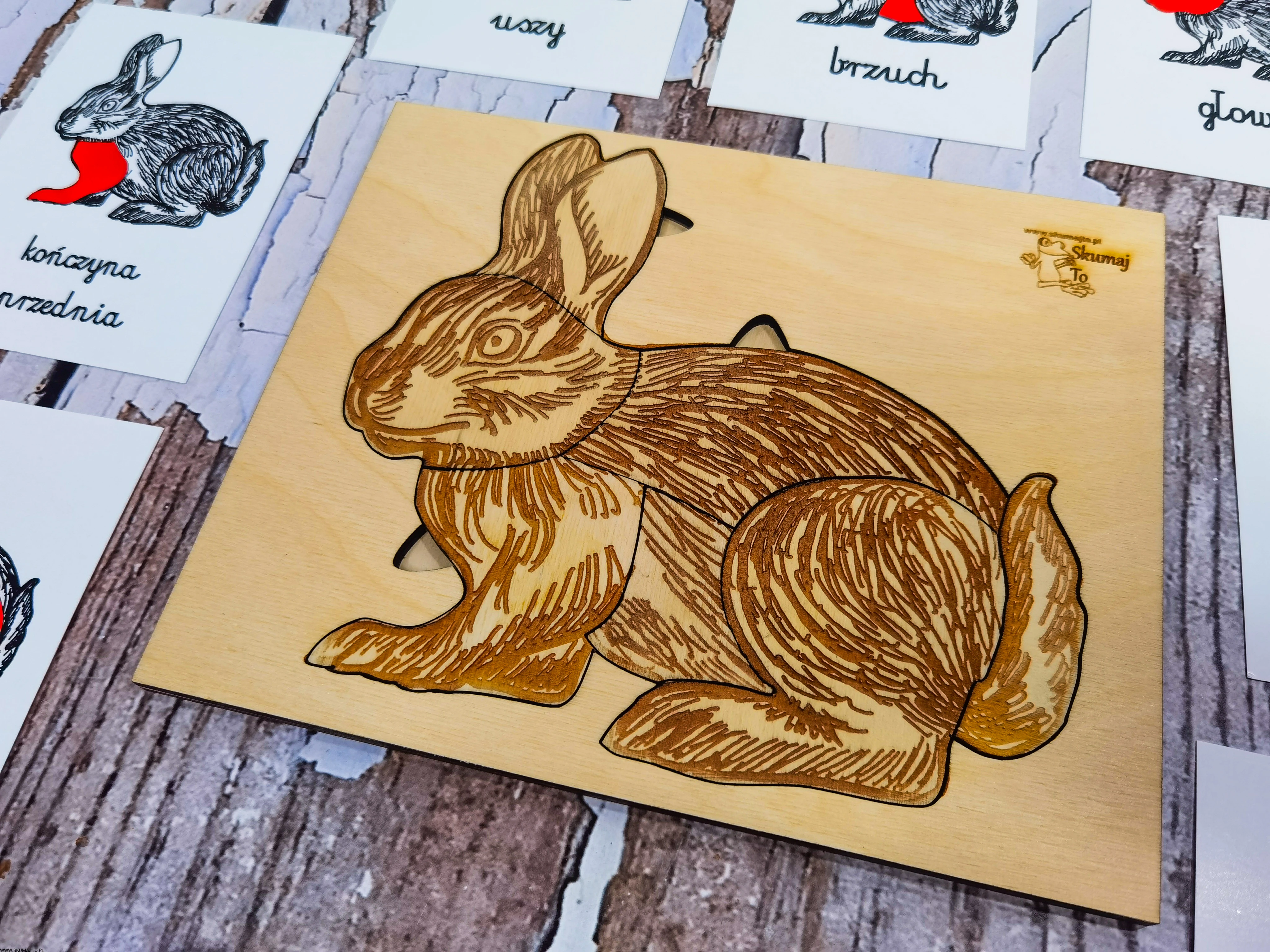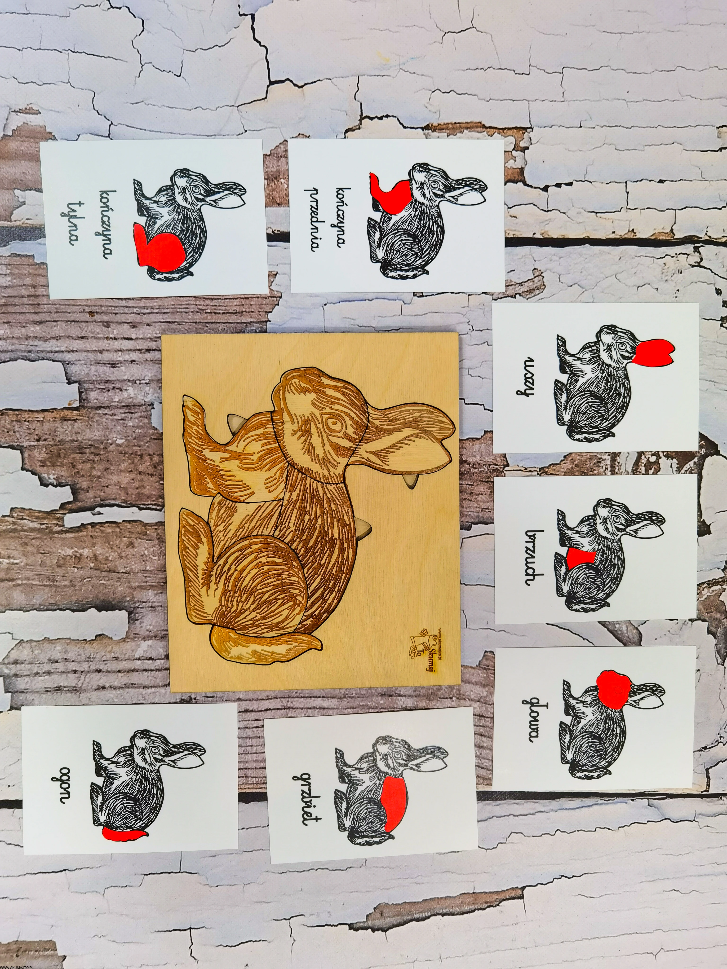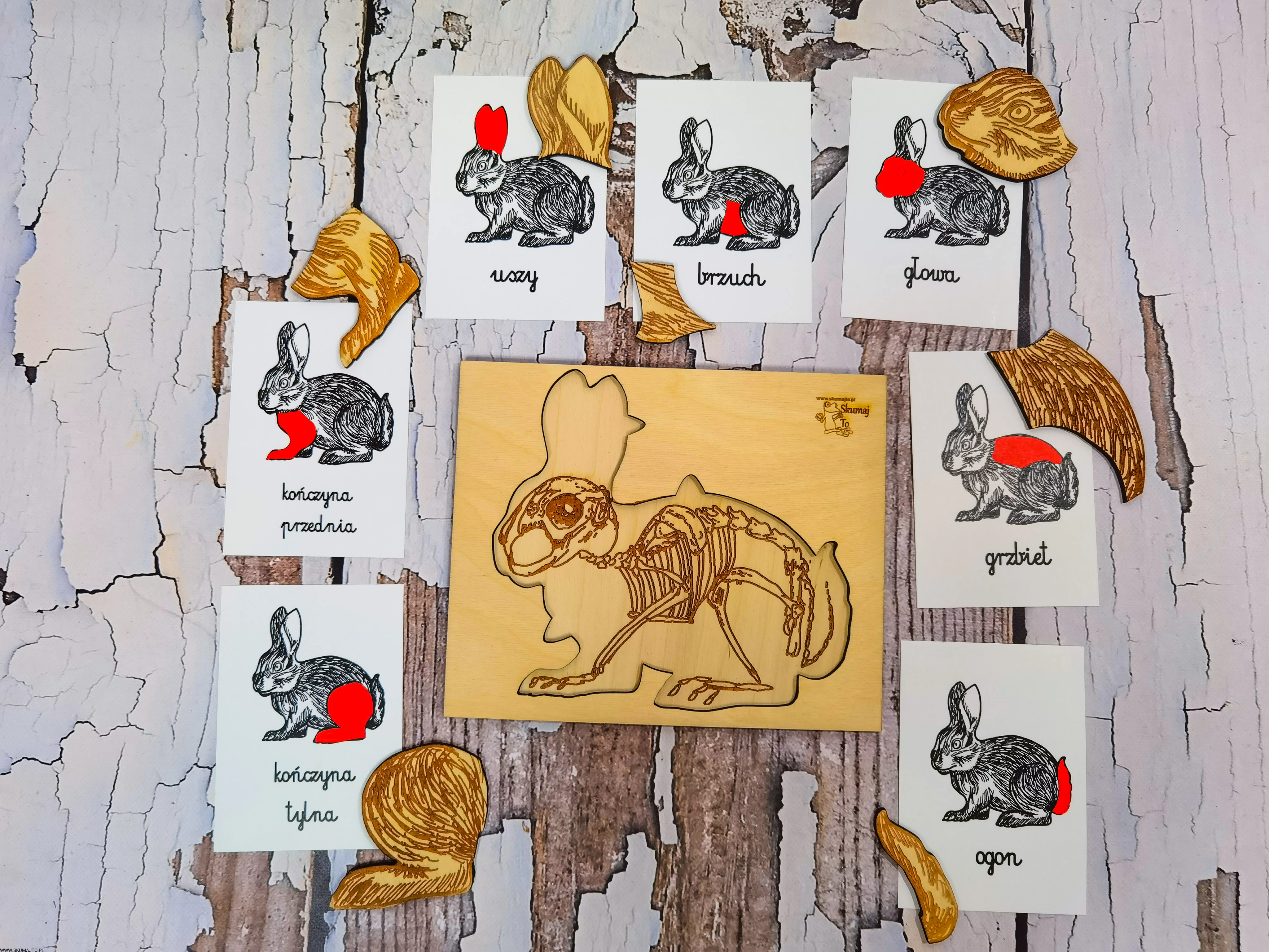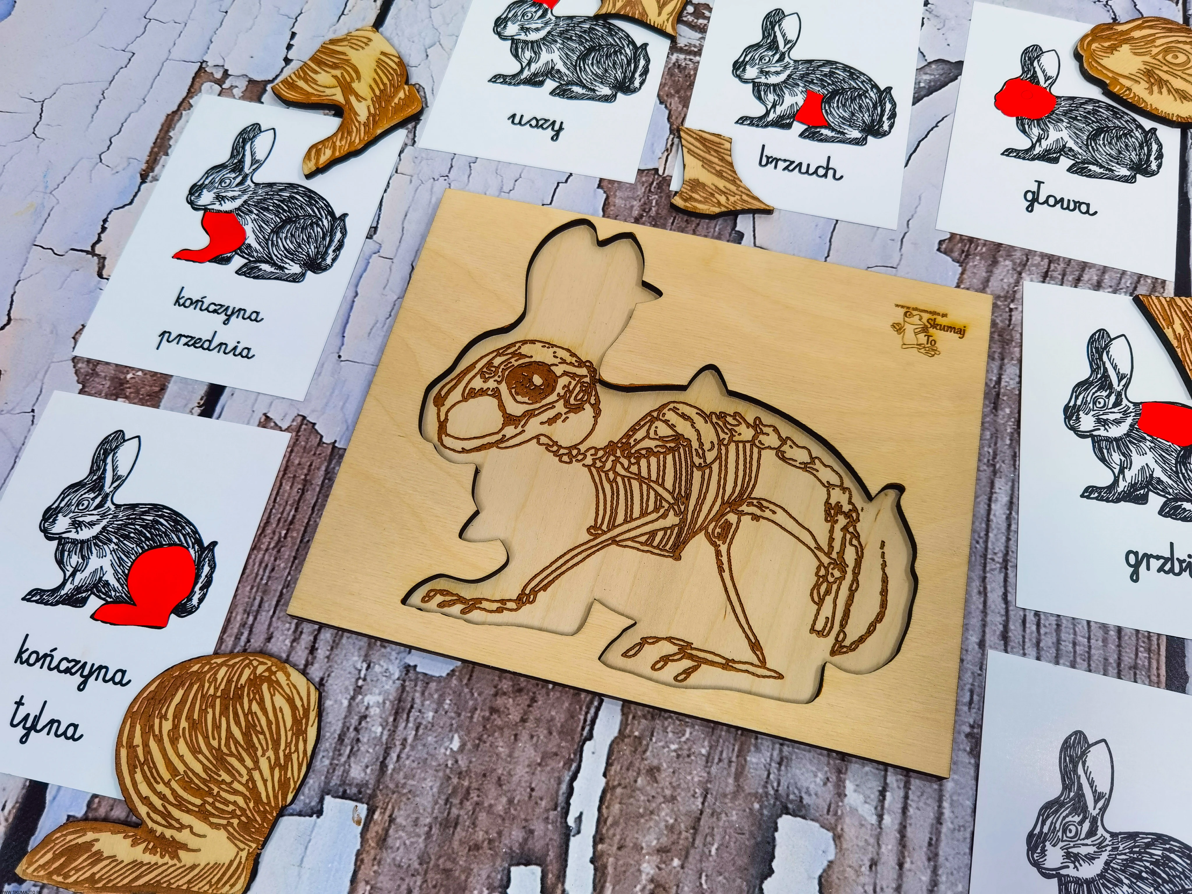 - Podstawa: Wymiary 24x23x1 cm, ze szkieletem królika do układania elementów.