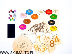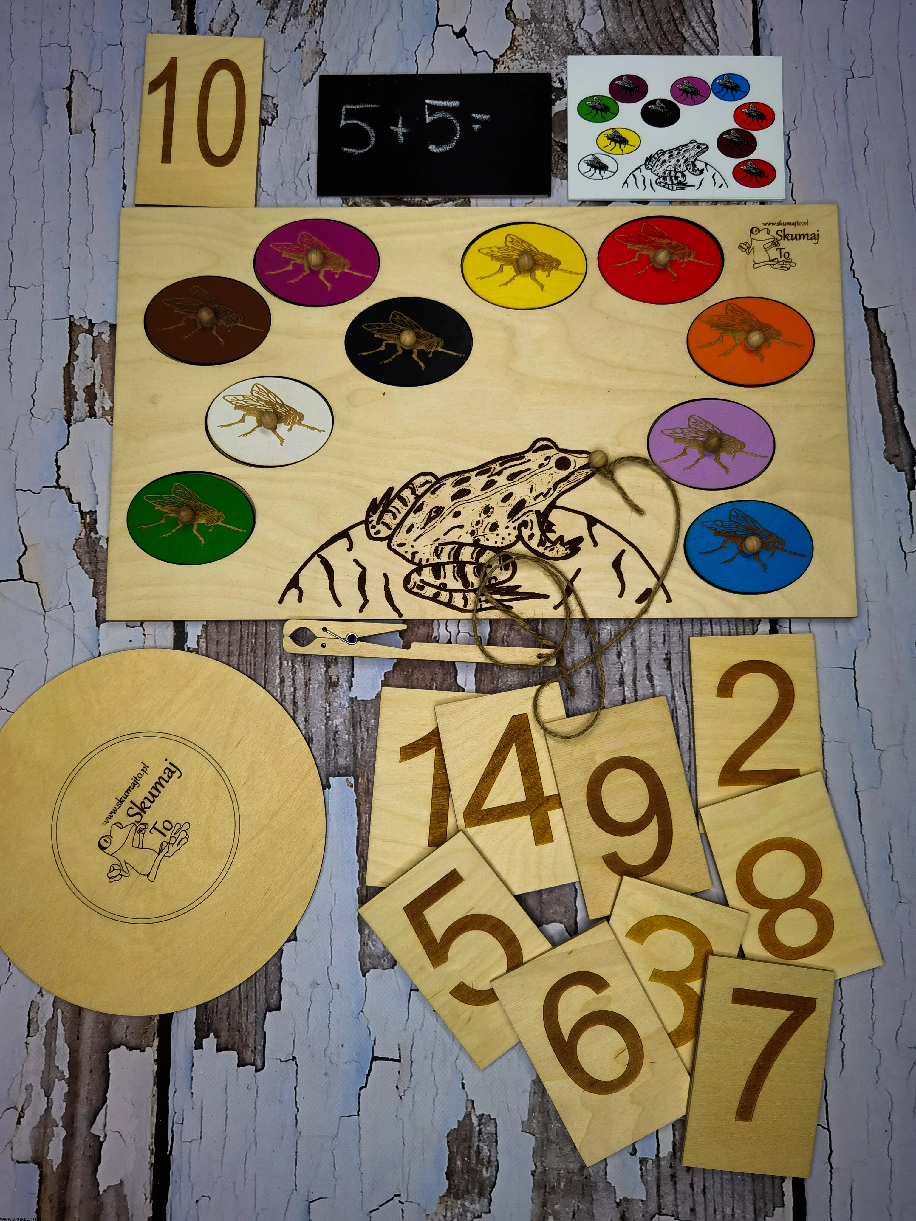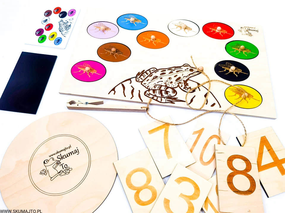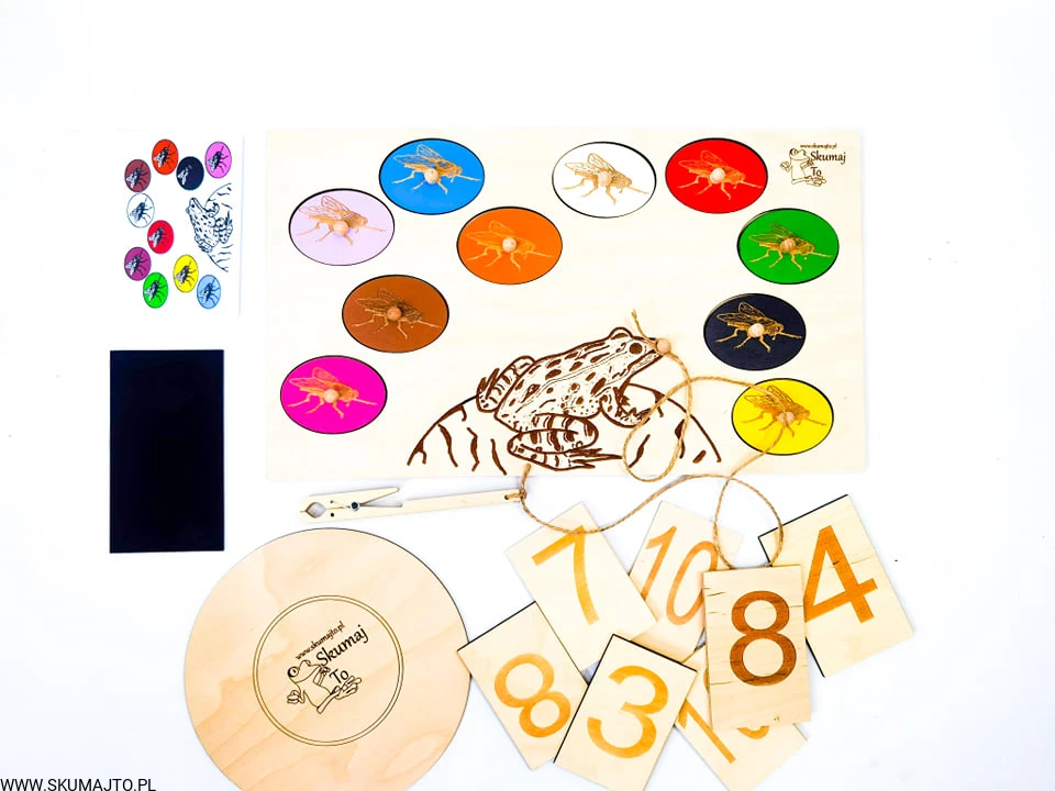 Układanka Żaba i muchy, rzeczywiste obrazki, matematyka, liczenie, kolory, odwzorowywanie