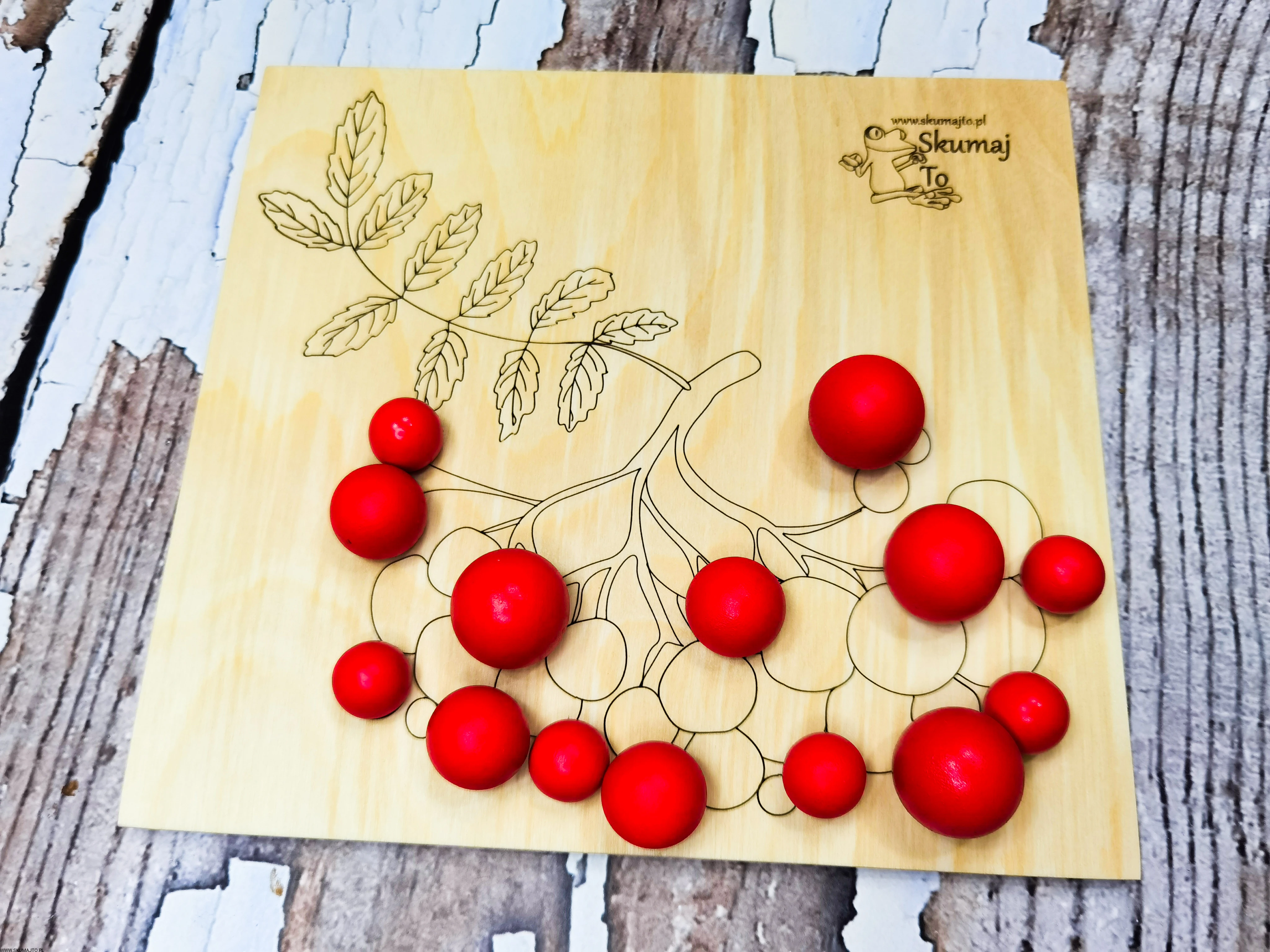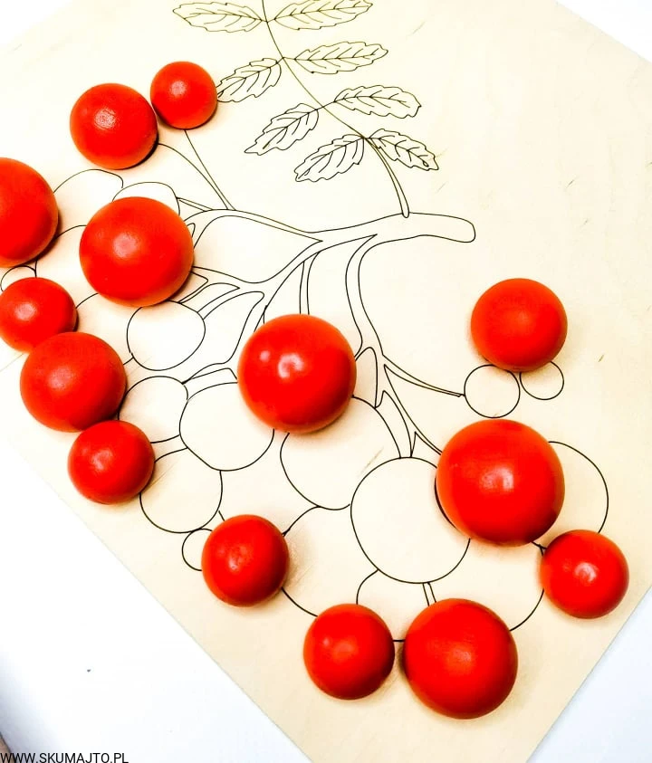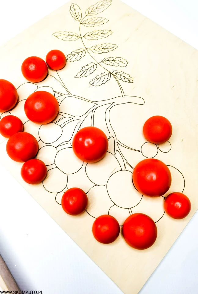 Układanka drewniana, Czerwone korale, jesień, jarzębina, odwzorowywanie, kulki, szczypce
