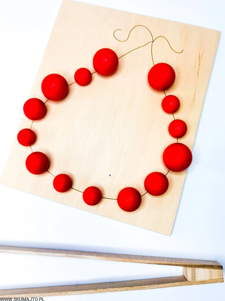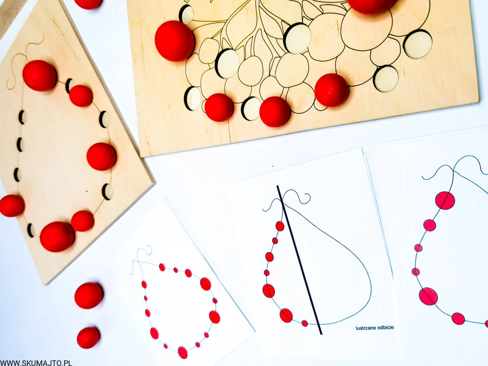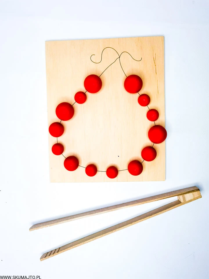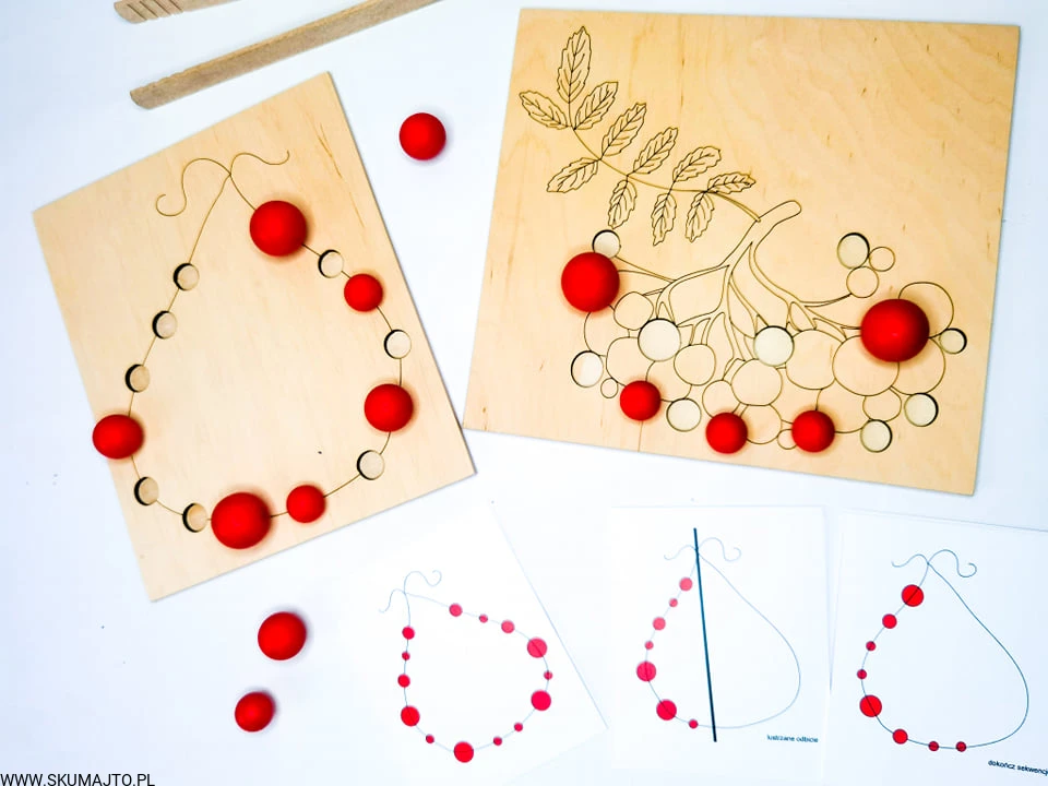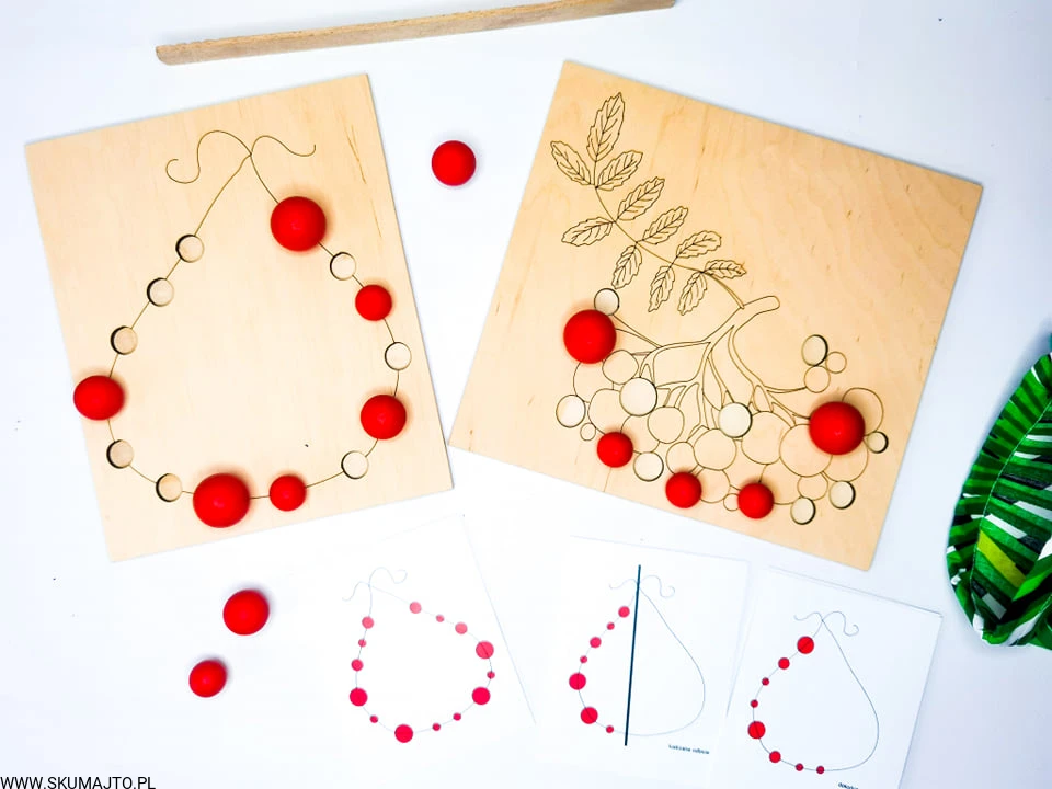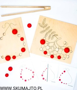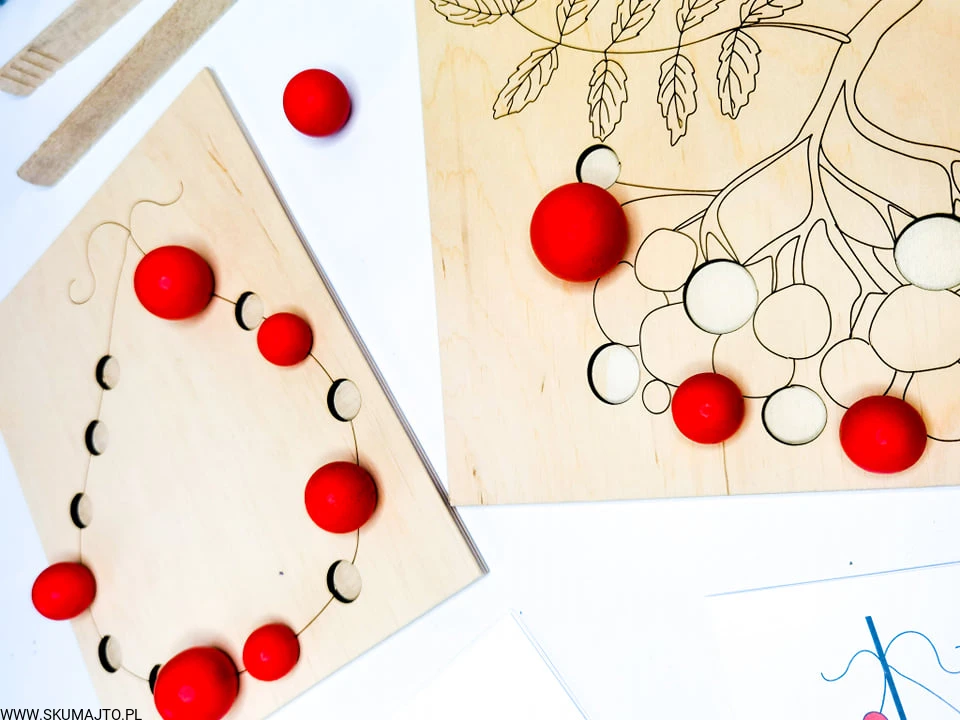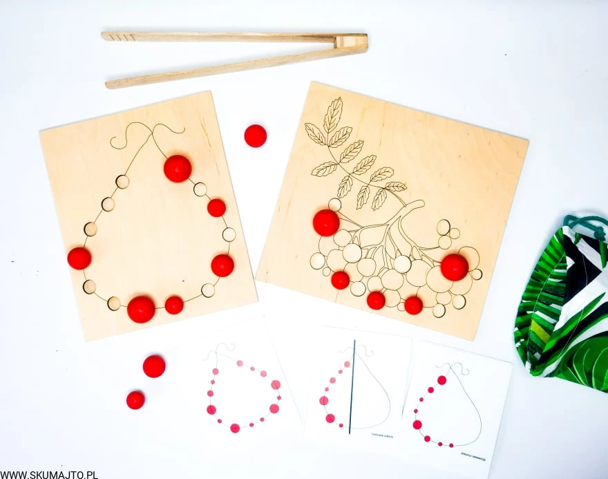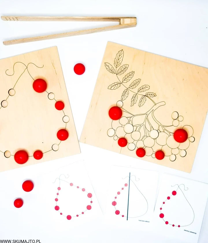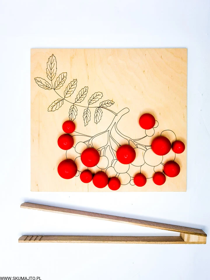 - Układanie Jarzębiny: Dziecko układa drewniane kulki jarzębiny na gałązce, a następnie zrywa je za pomocą szczypiec.