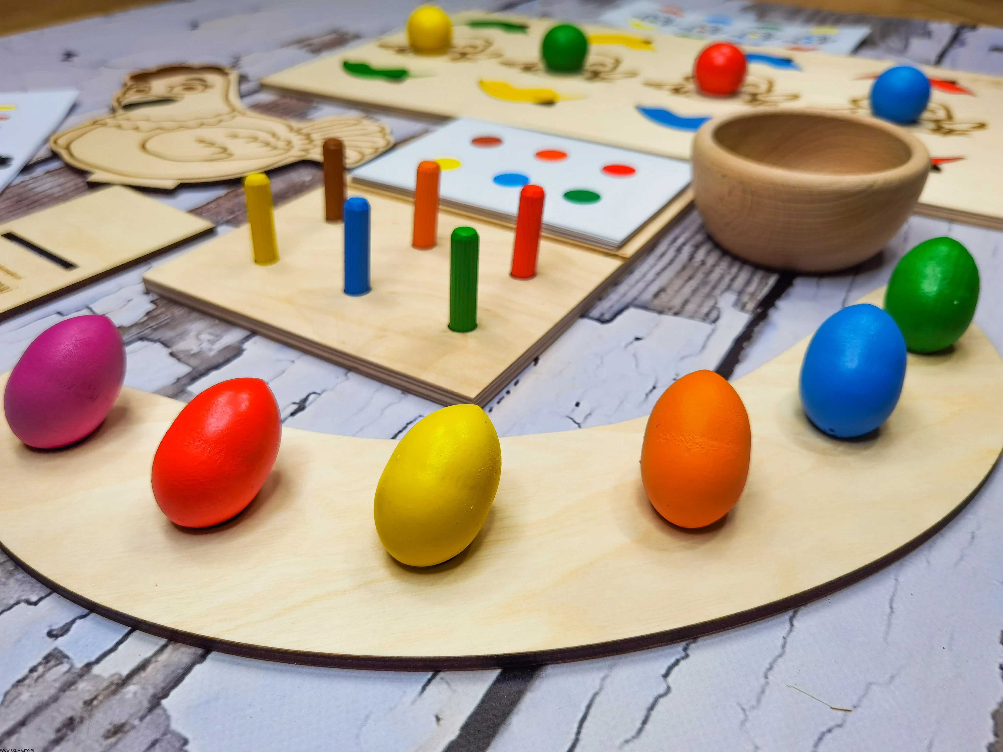 - Układanie Jajeczek: Po nakarmieniu kurki, dziecko układa jajeczka w gniazdku w odpowiedniej kolejności.