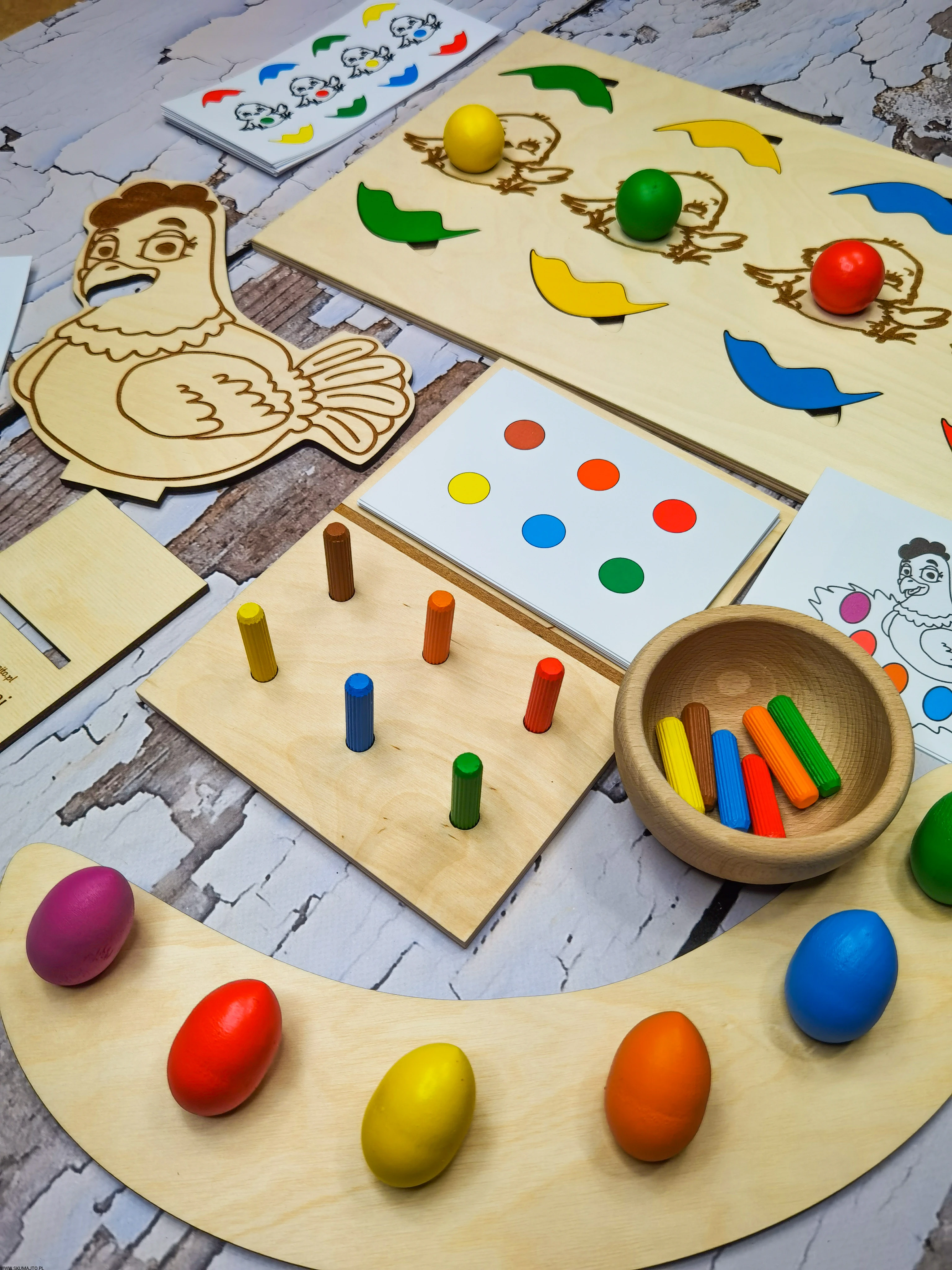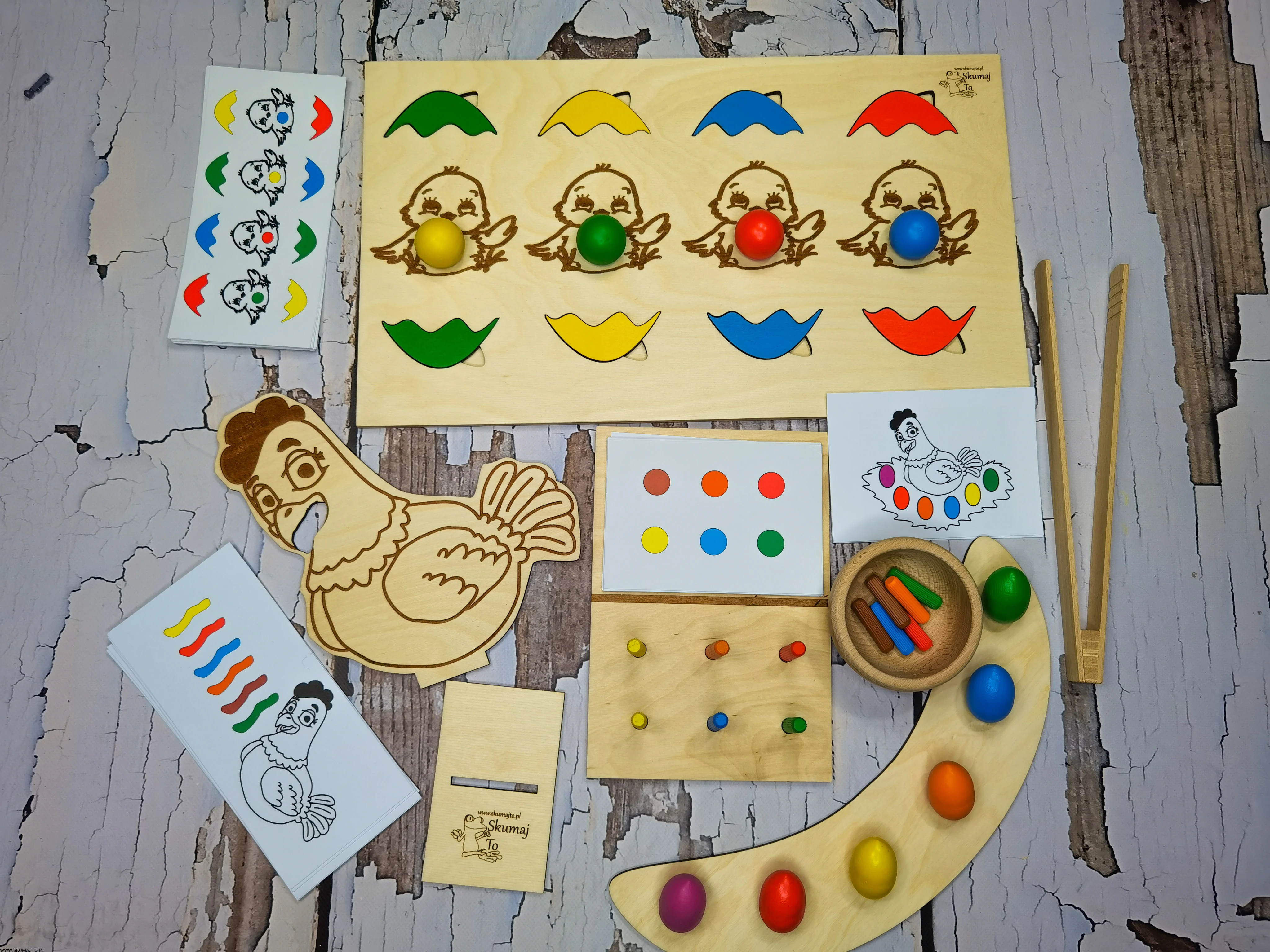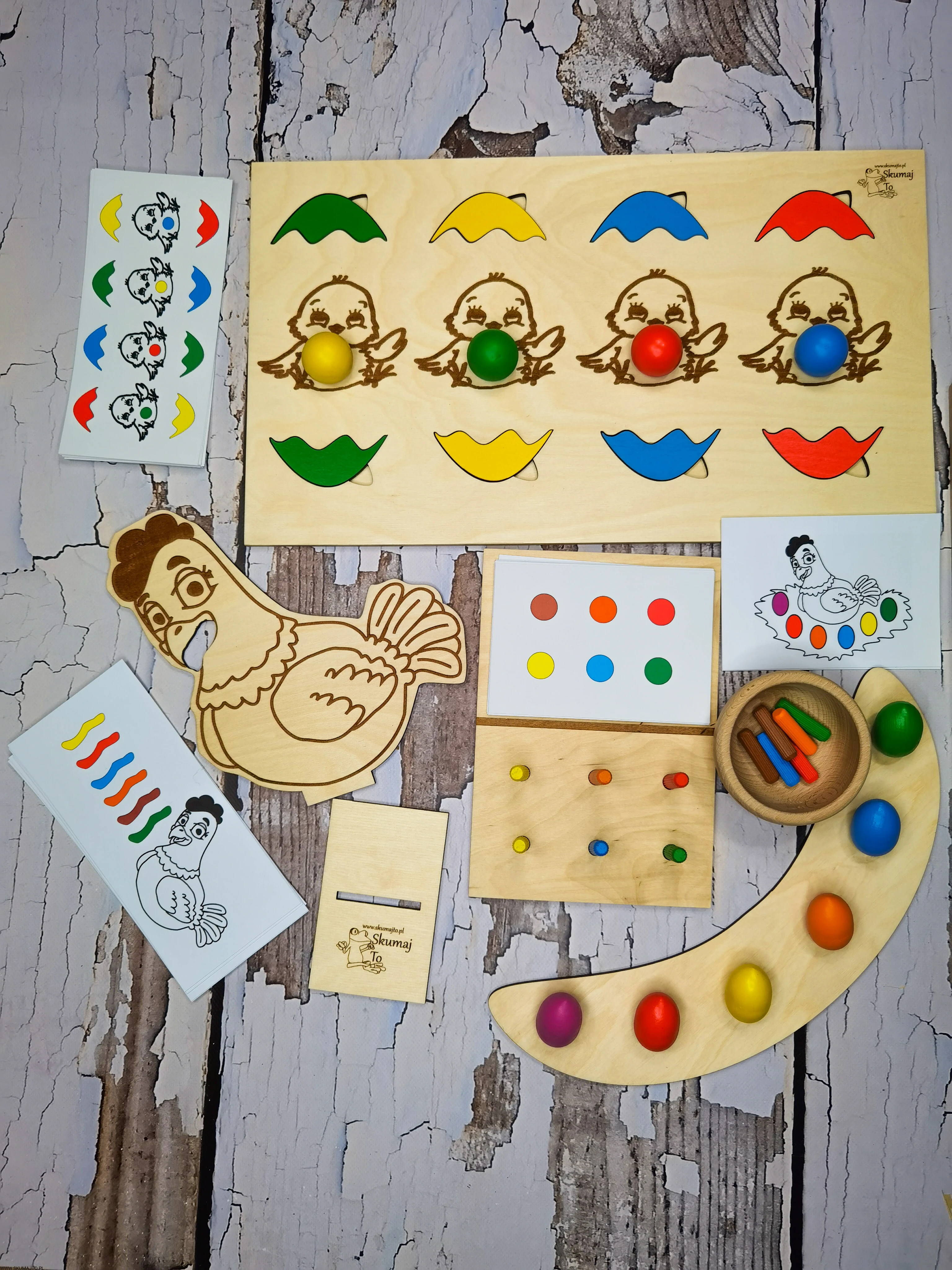 Kura, kurczaki, odwzorowywanie, karmienie kury, nauka kolorów, motoryka, zestaw