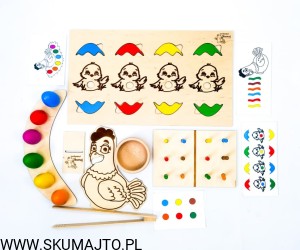 Nasza układanka "Kokoszka Smakoszka" to wspaniałe narzędzie edukacyjne, które rozwija zdolności manualne, koncentrację oraz koordynację ręka-oko. Twoje dziecko pomoże głodnej kurce znaleźć pożywienie, a następnie ułoży jajeczka i opiekować się kurczakami, ćwicząc przy tym precyzję i logiczne myślenie.