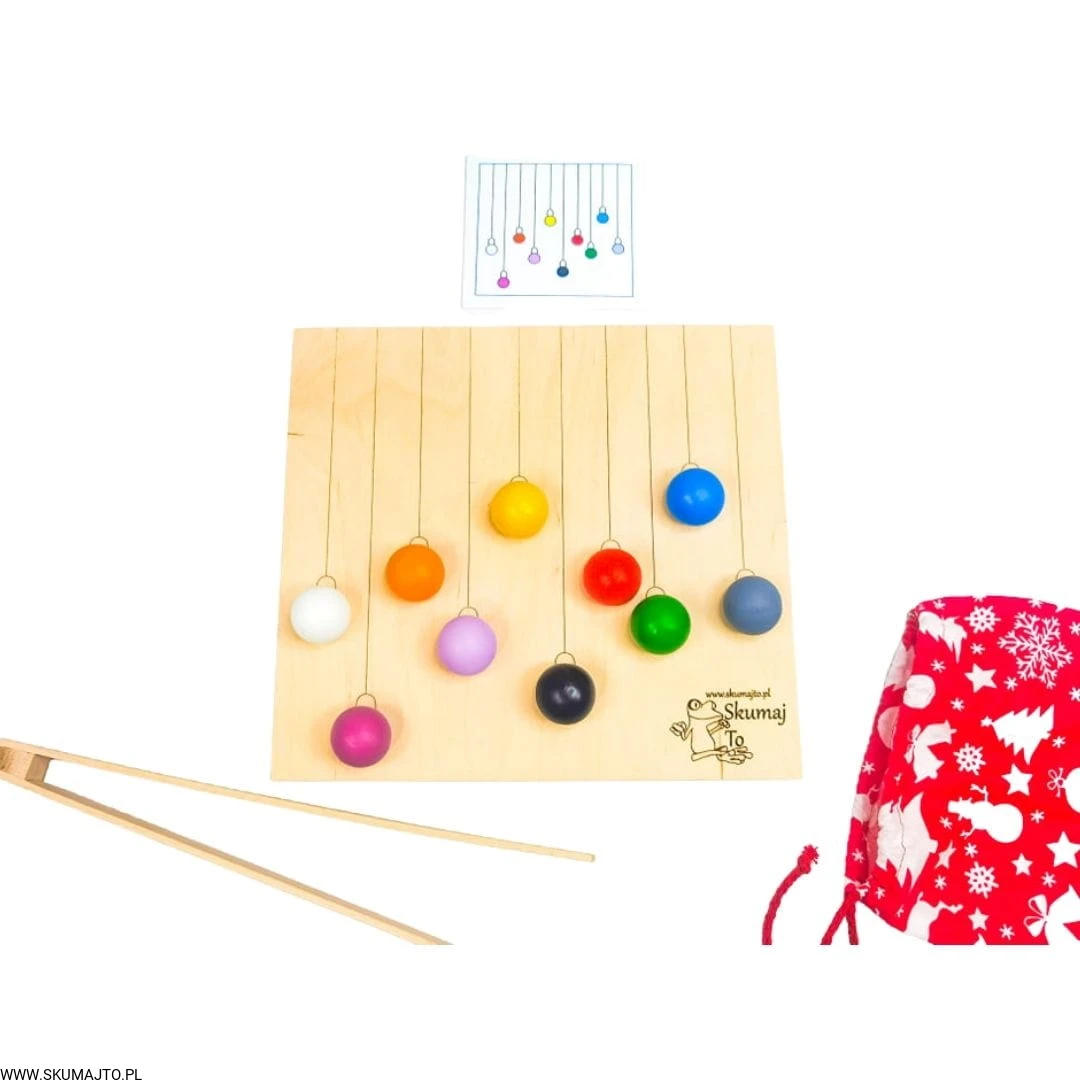 - Ćwiczenie Precyzji: Dziecko rozwija swoje umiejętności manualne, starannie układając bombki przy pomocy drewnianych szczypiec.