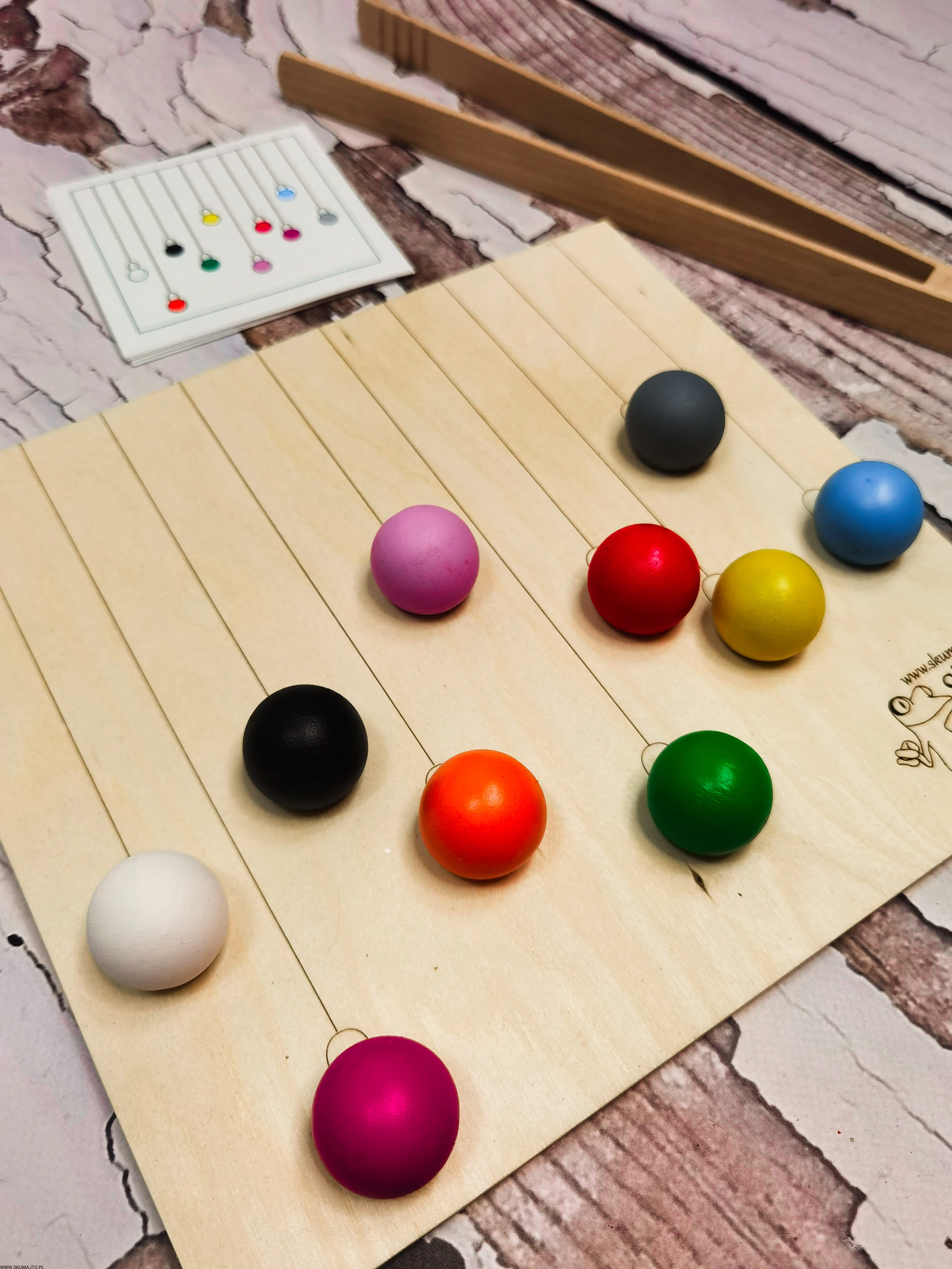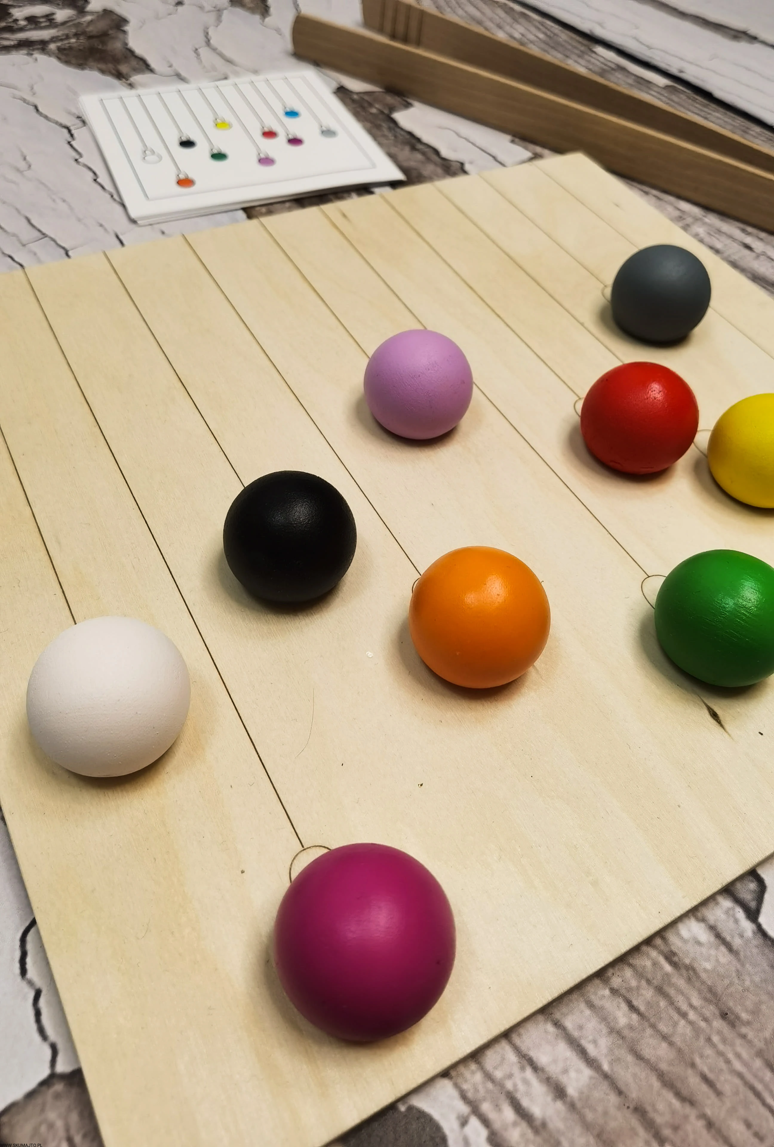 - Kolorowe Drewniane Kulki: 10 sztuk o średnicy 25 mm.