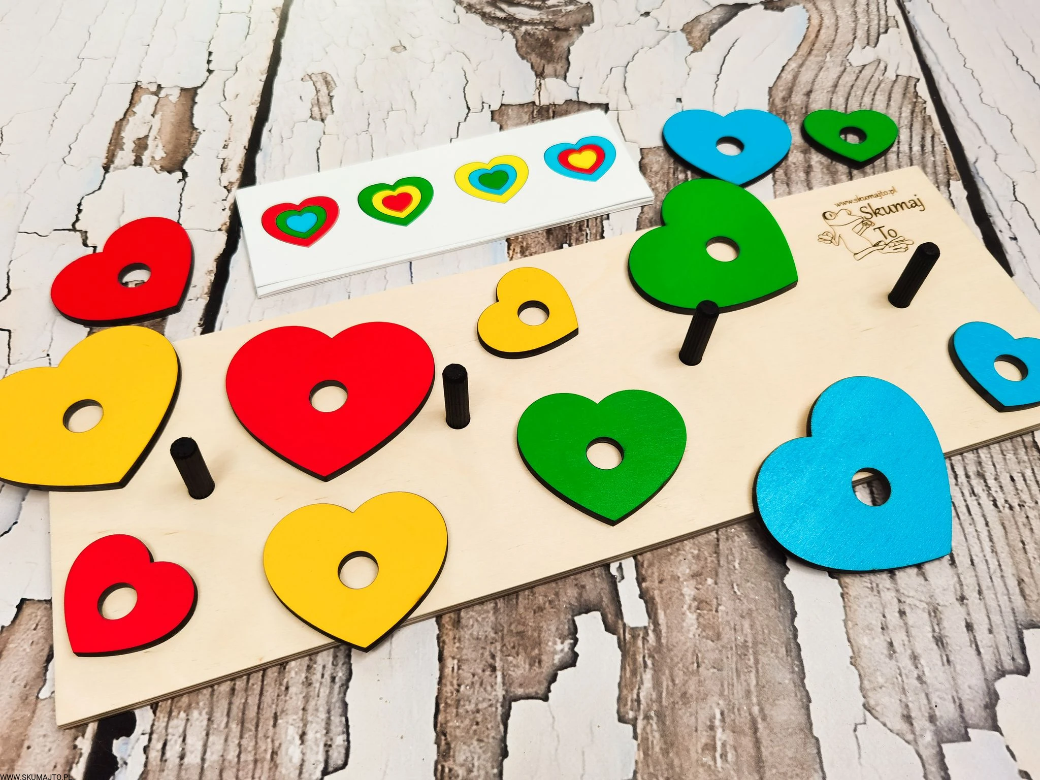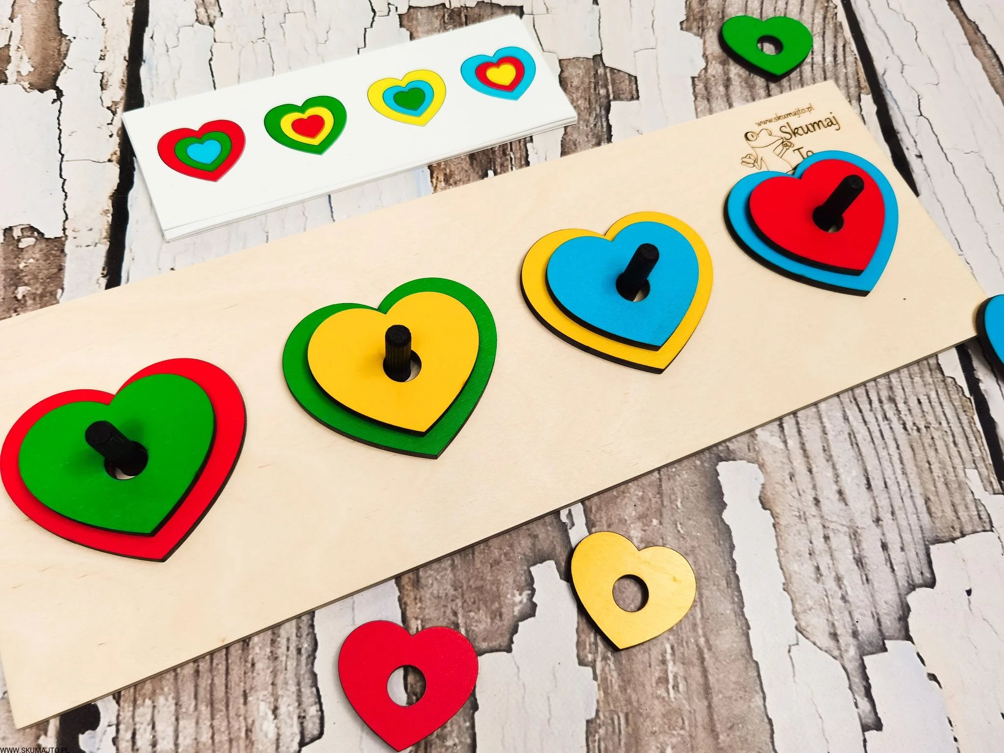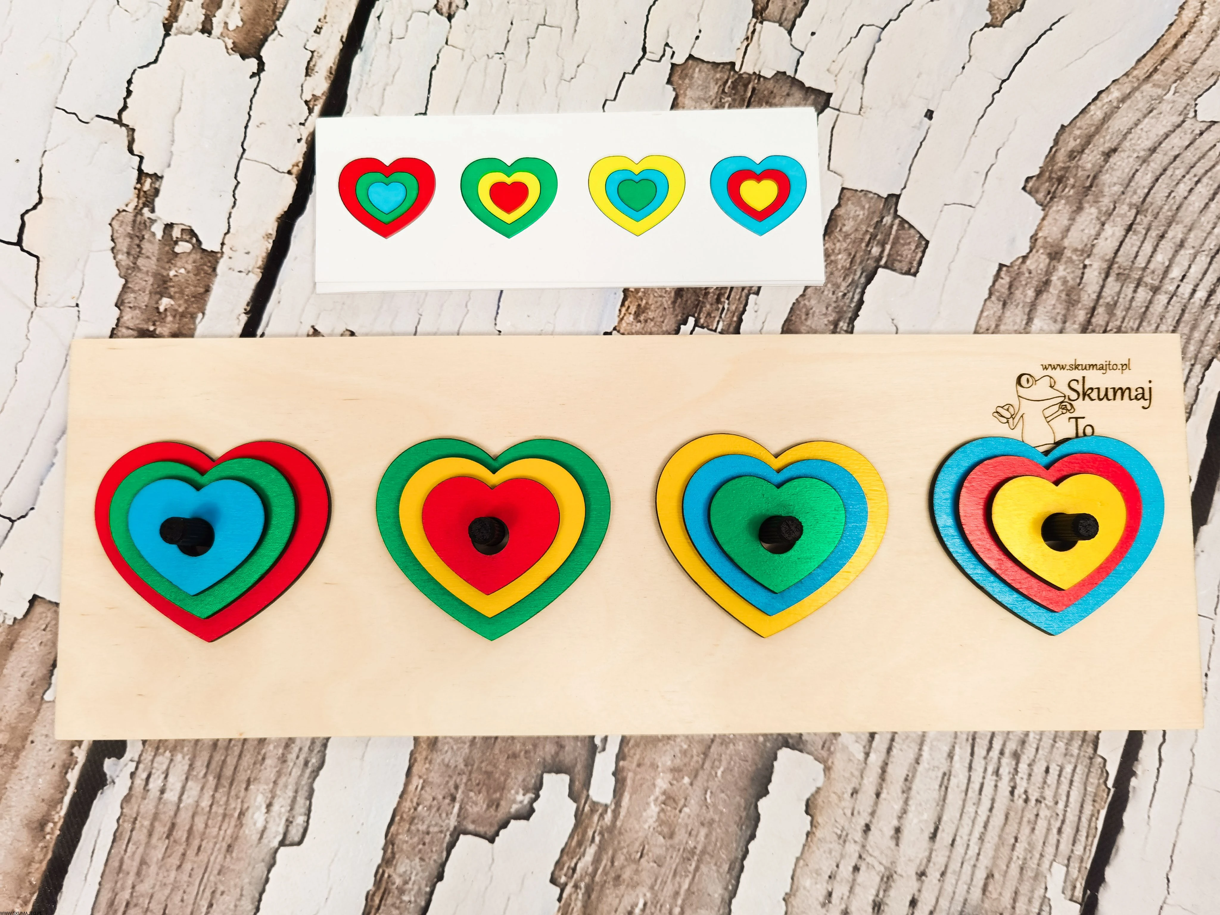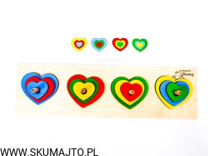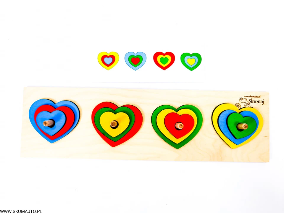Układanka do odwzorowywania, Kolorowe serduszka, nauka kolorów, odwzorowywanie, drewniane serca