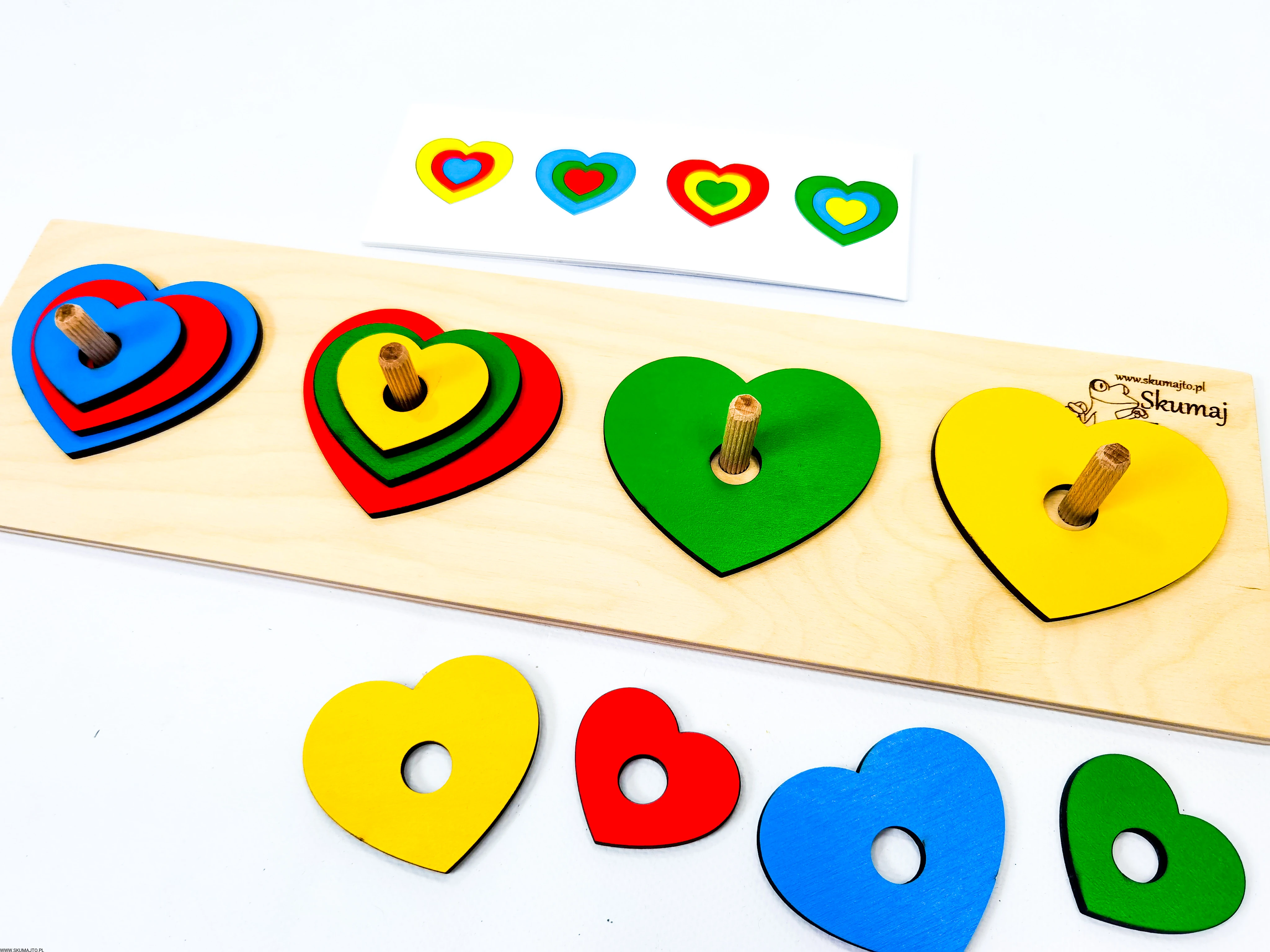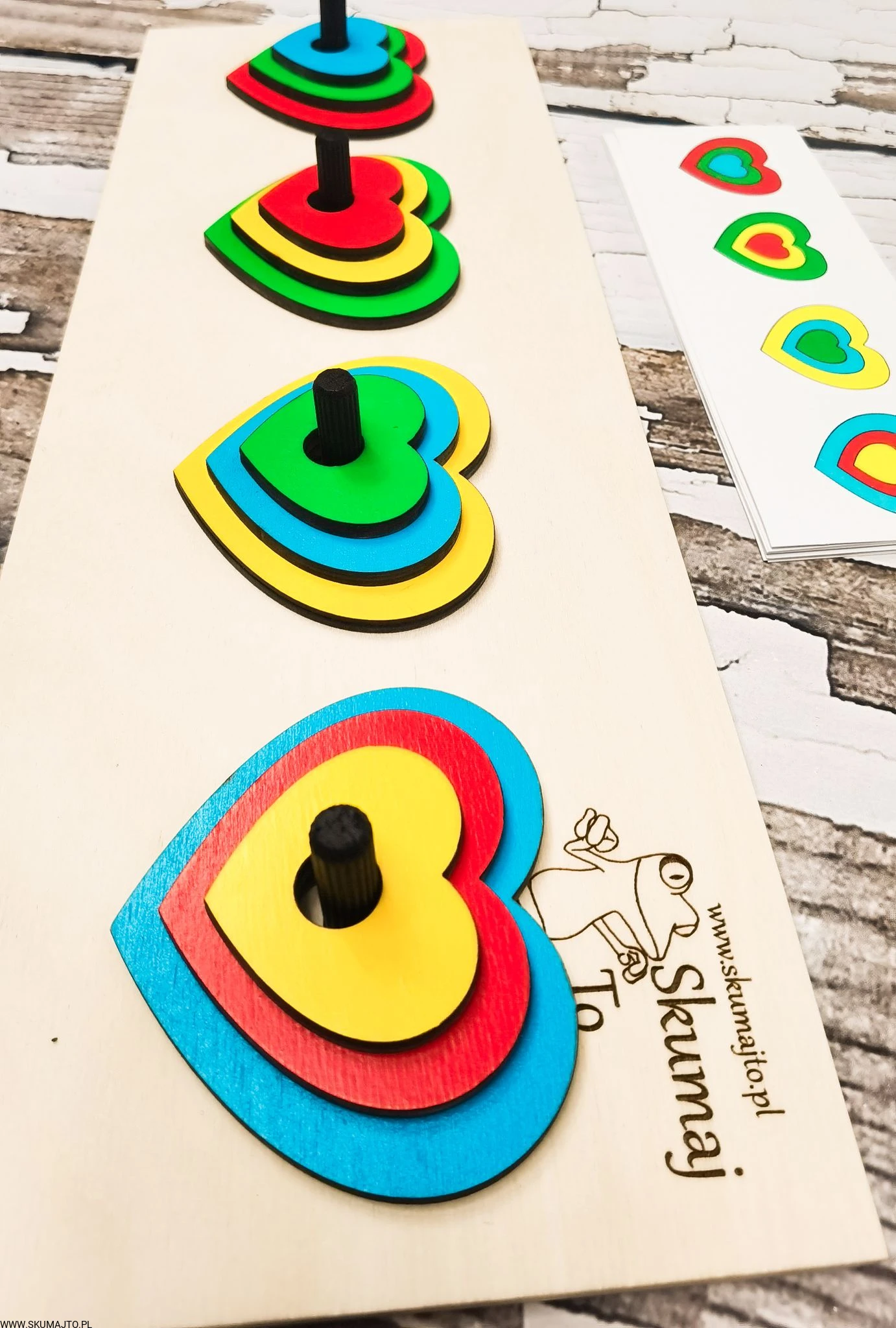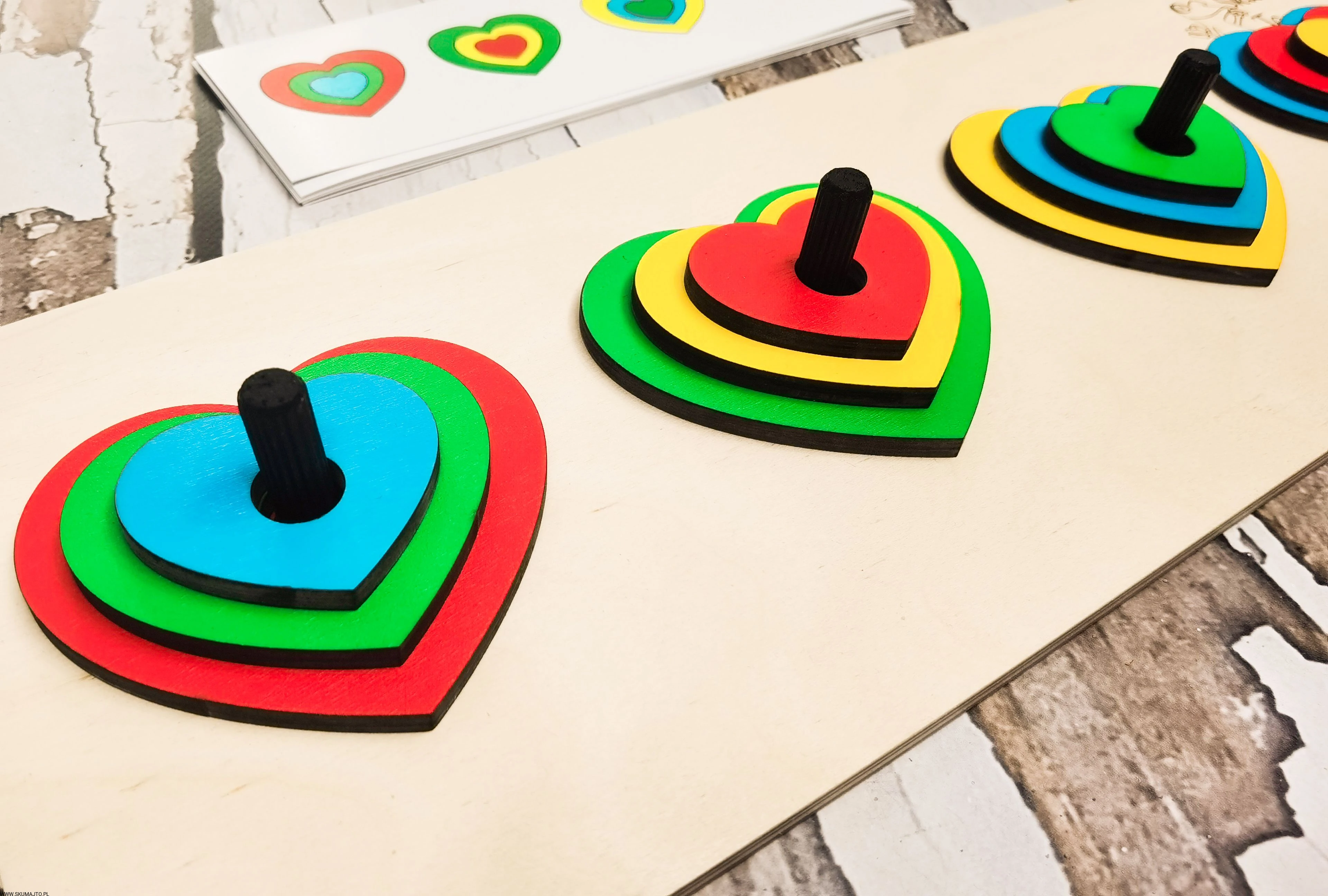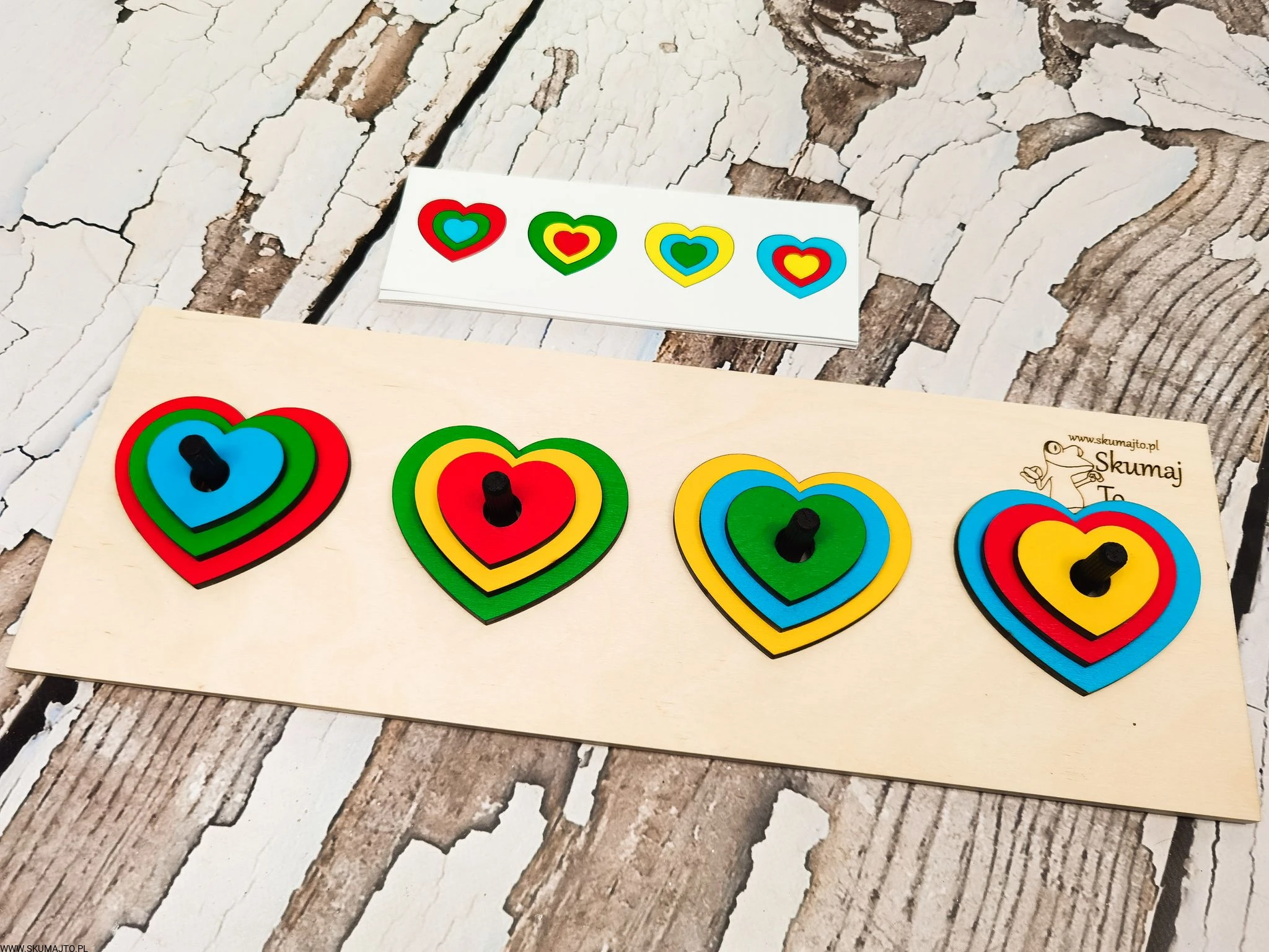 Układanka do odwzorowywania, Kolorowe serduszka, nauka kolorów, odwzorowywanie, drewniane serca