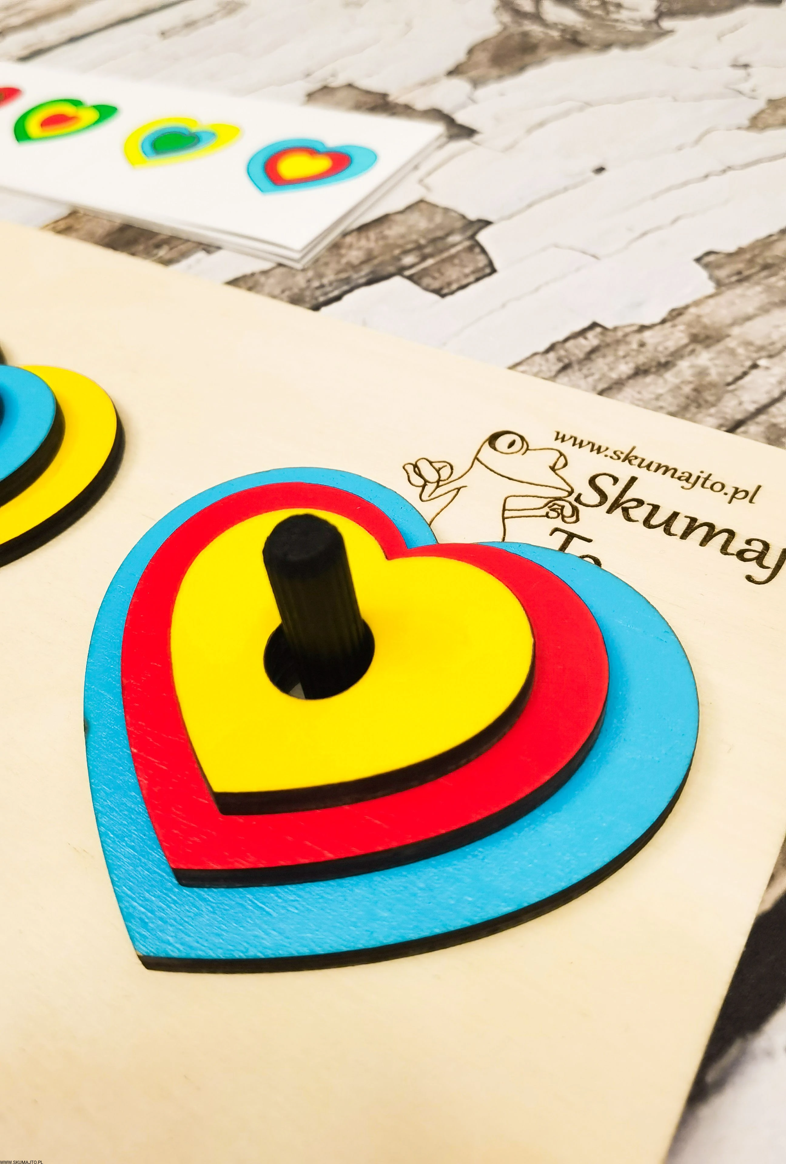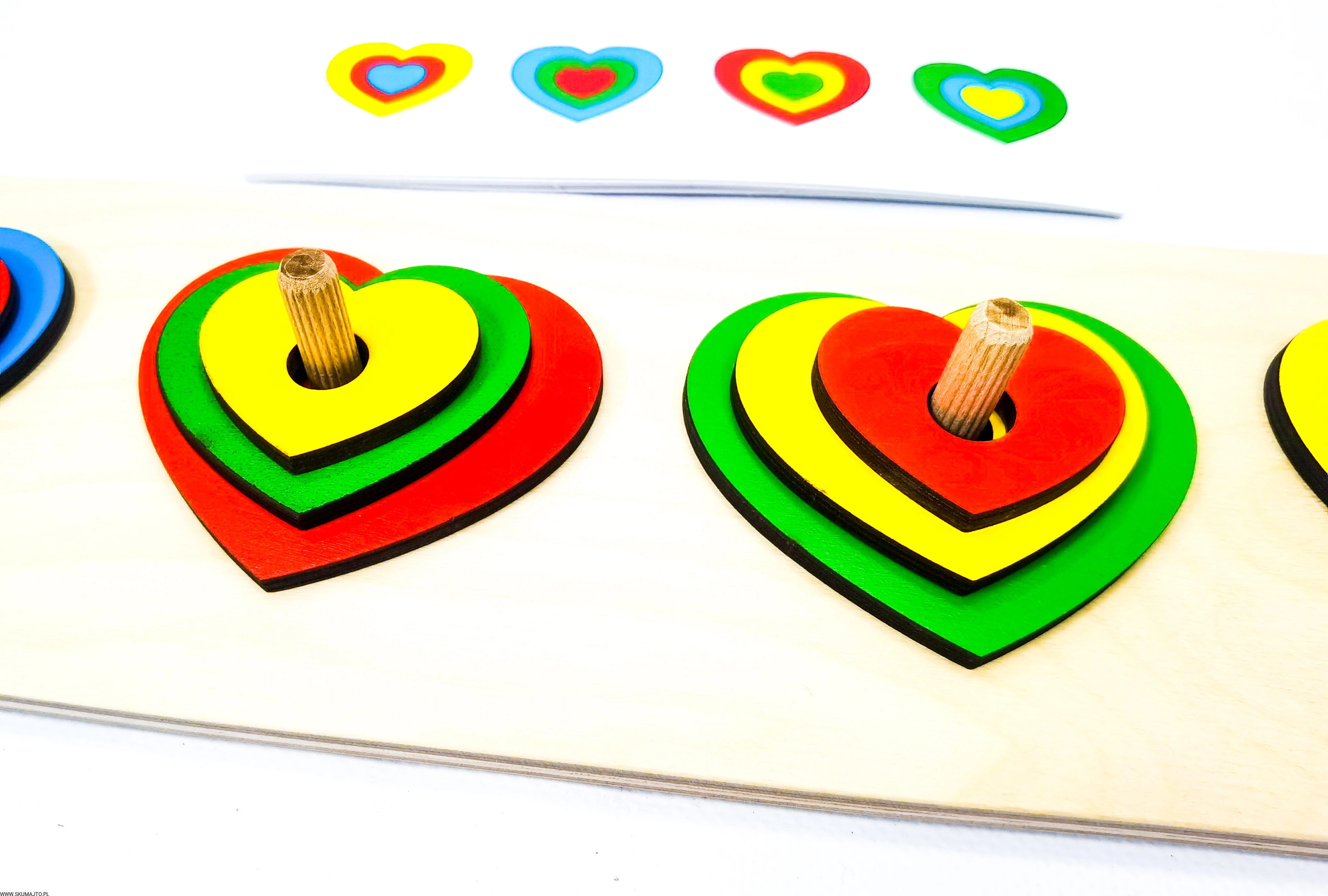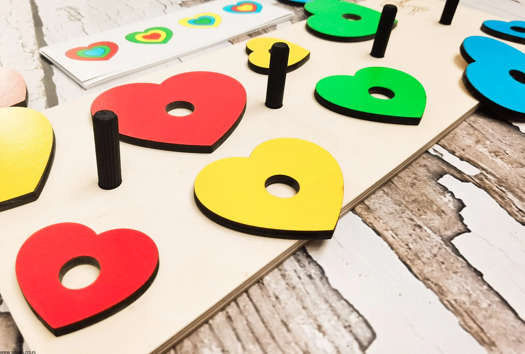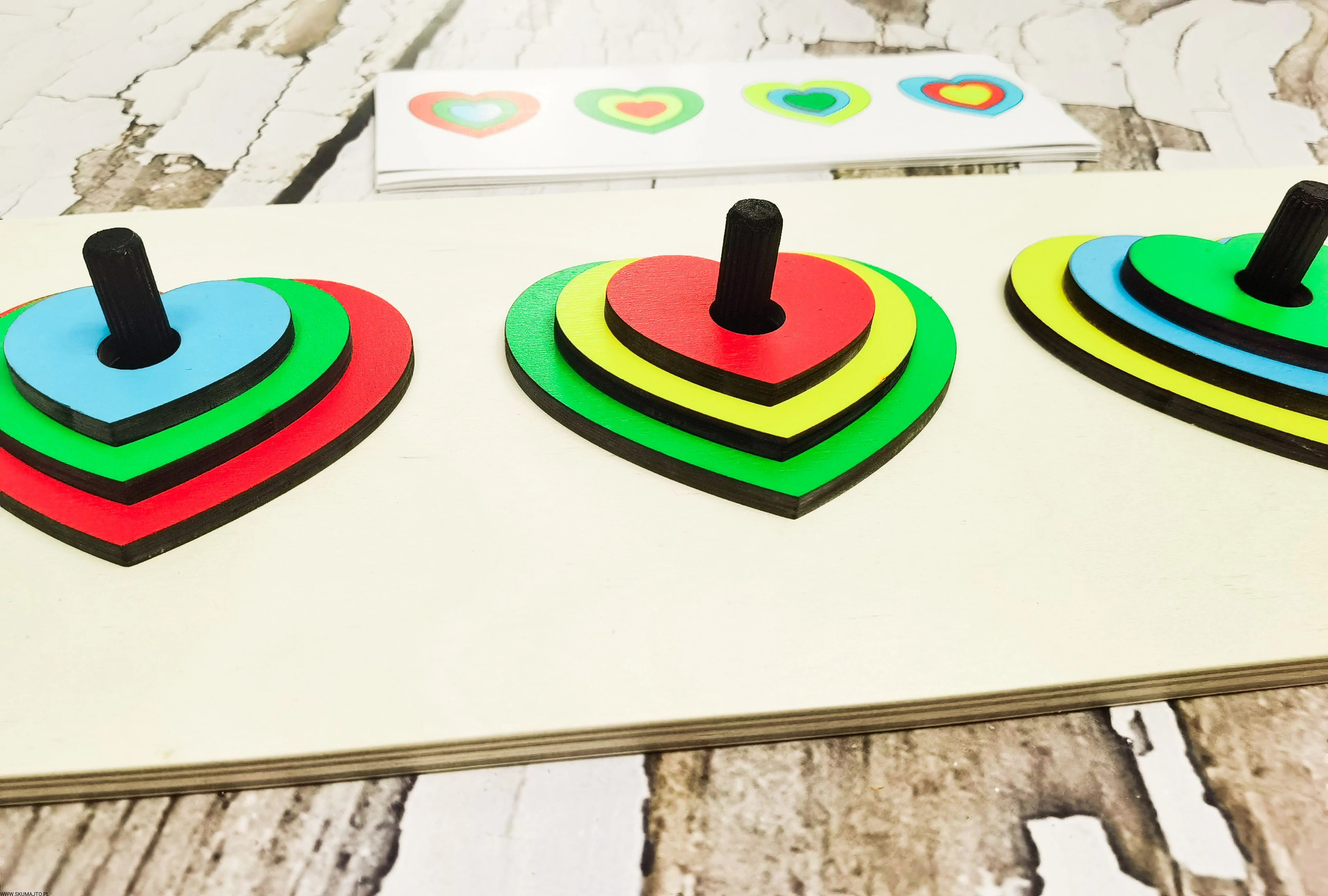 Układanka do odwzorowywania, Kolorowe serduszka, nauka kolorów, odwzorowywanie, drewniane serca