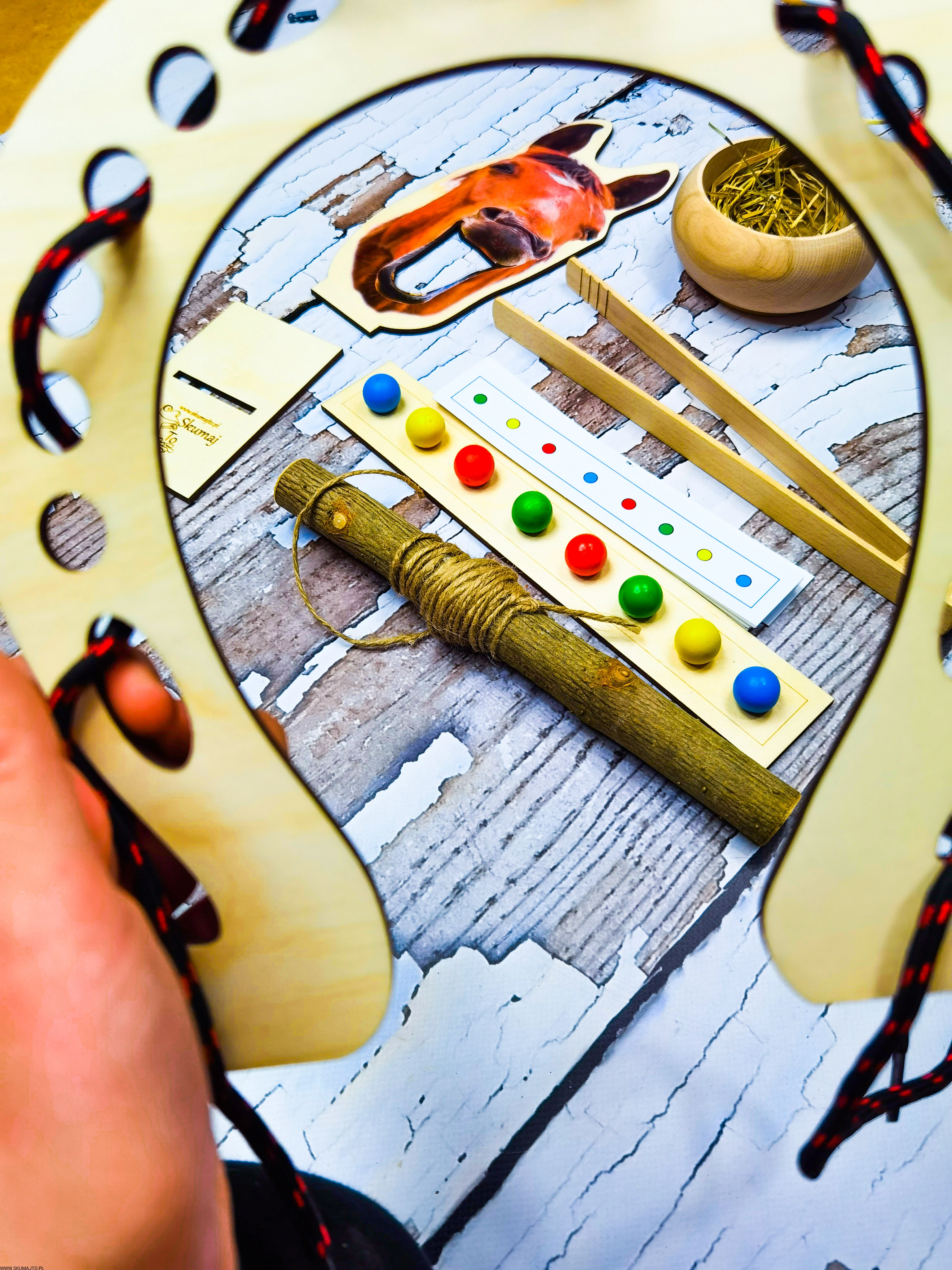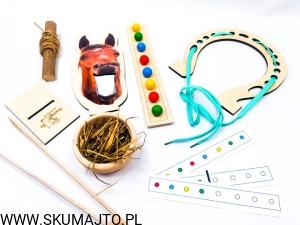 - Przewlekanie Sznurówki: Ćwiczenie precyzji i koordynacji poprzez przewlekanie sznurówki przez podkowę.