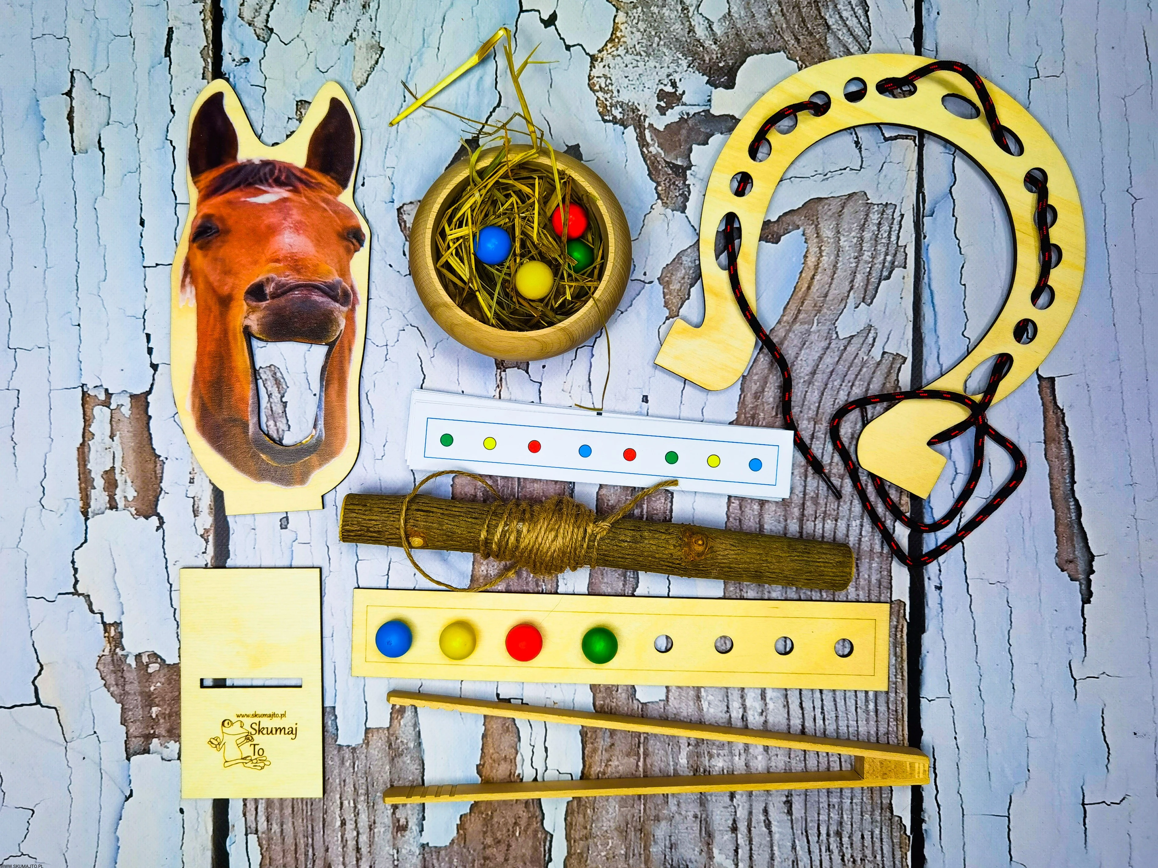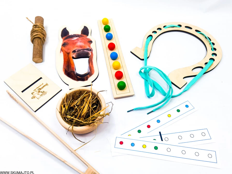 - Rozwój Motoryki i Precyzji: Używanie nożyczek do cięcia sianka, drewnianych szczypiec do karmienia konika i nawlekanie makaronu rozwija małą motorykę oraz koordynację ręka-oko.