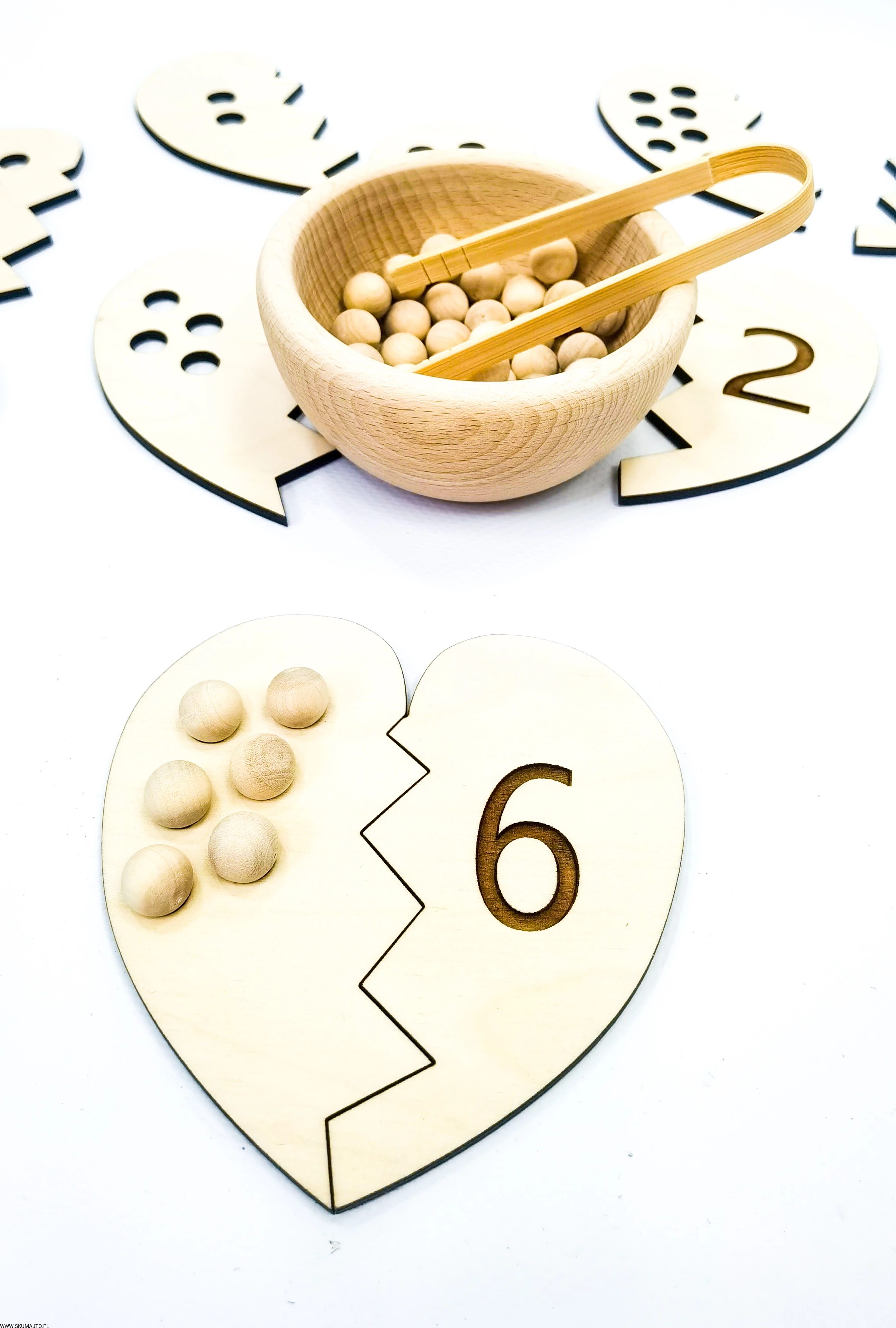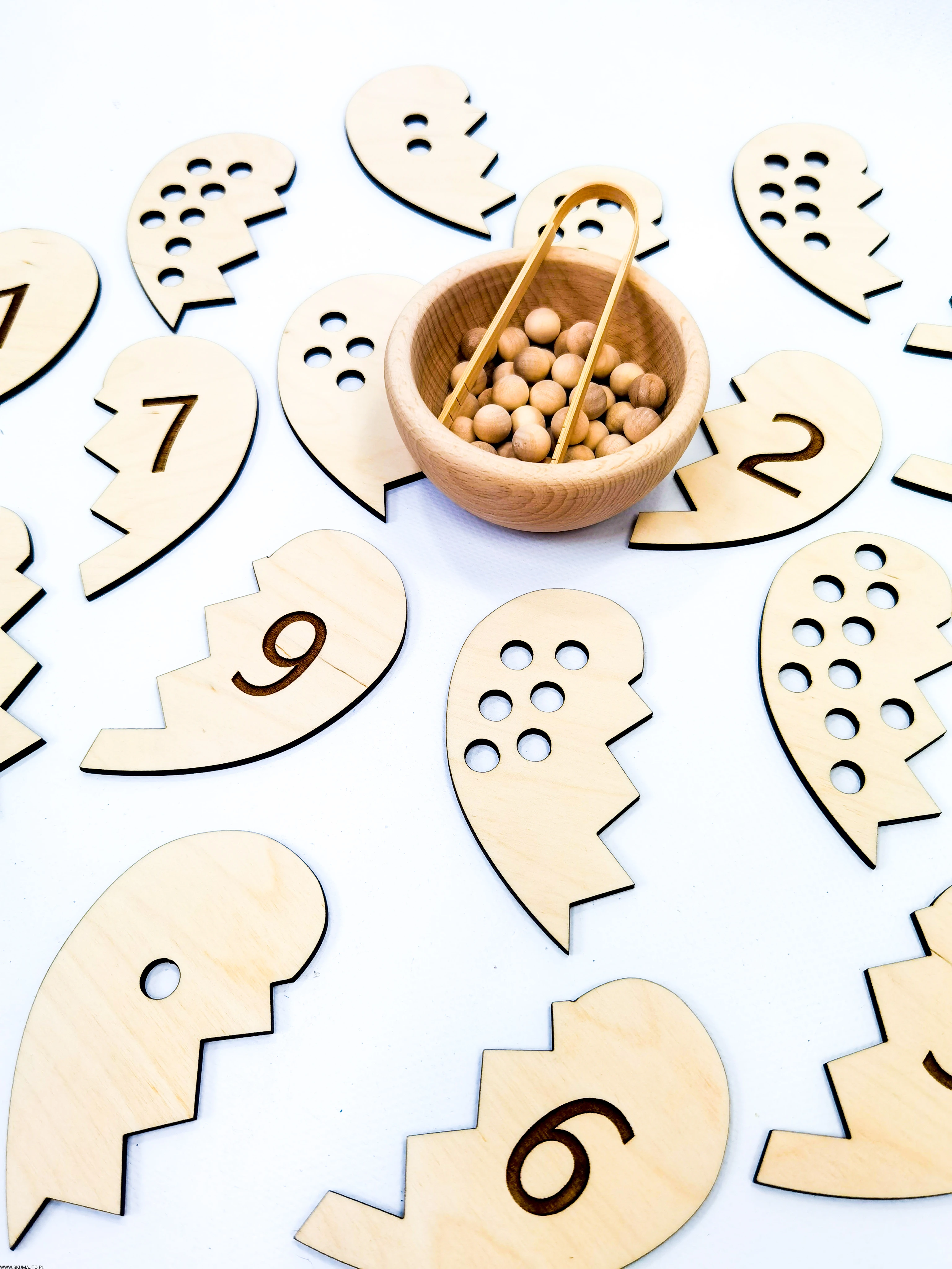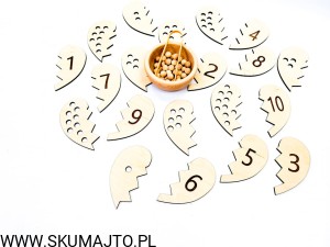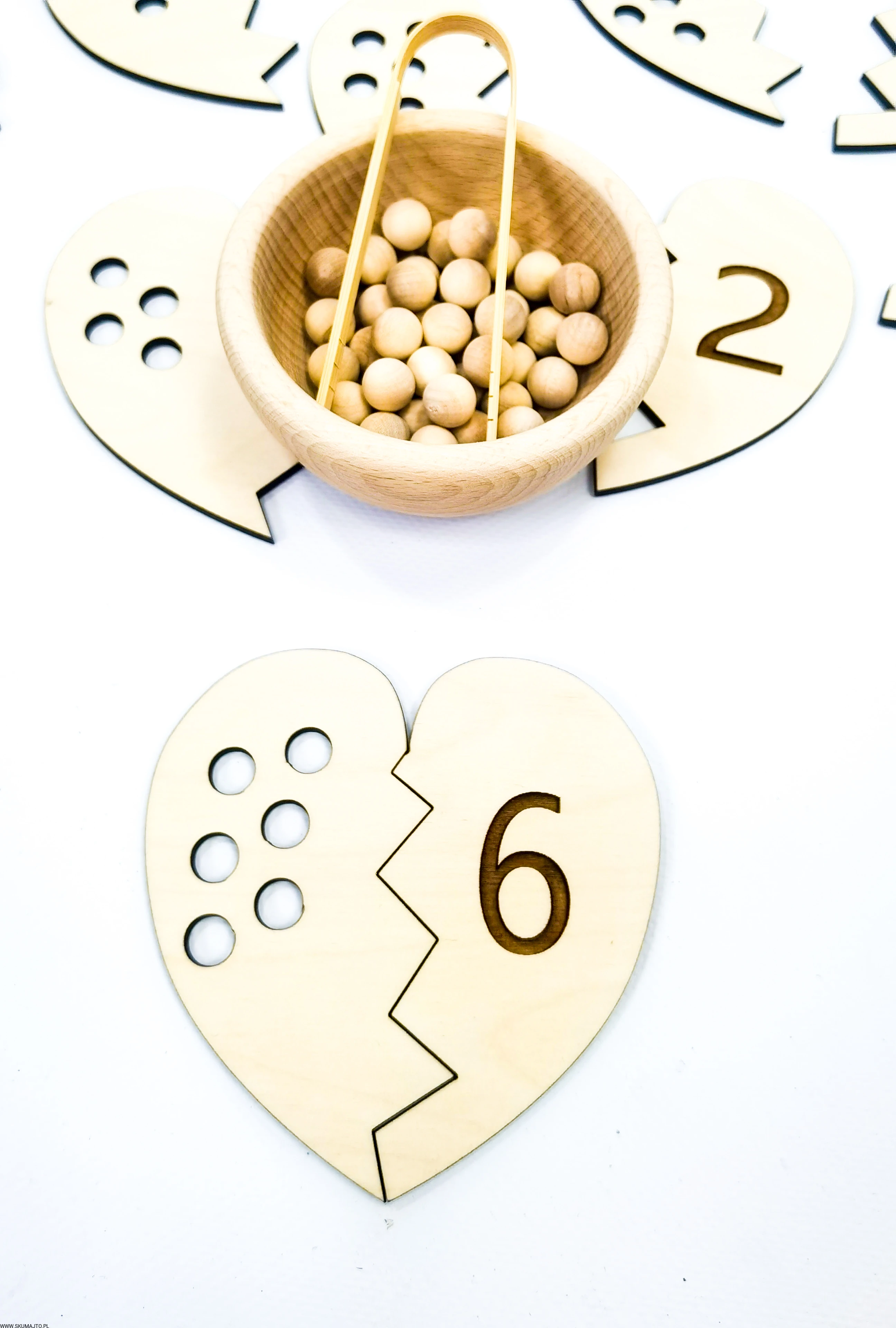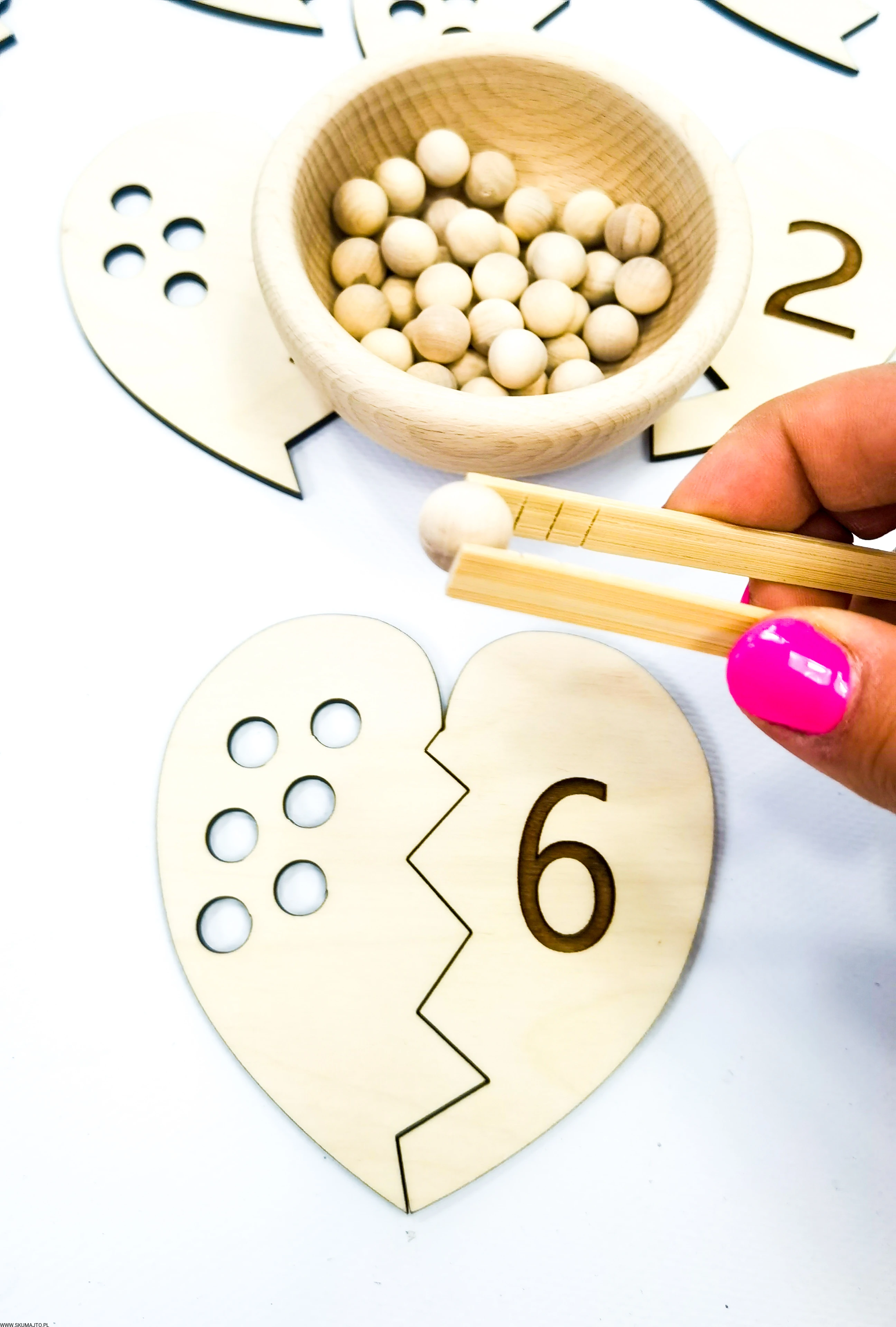 - Łączenie Połówek Serc: Dziecko losuje połówkę serca z dziurkami i przy pomocy bambusowych szczypiec wyciąga z miseczki odpowiednią ilość koralików. Następnie przelicza je głośno, układa na serduszku i szuka połówki serca z odpowiednią cyfrą, łącząc je ze sobą.