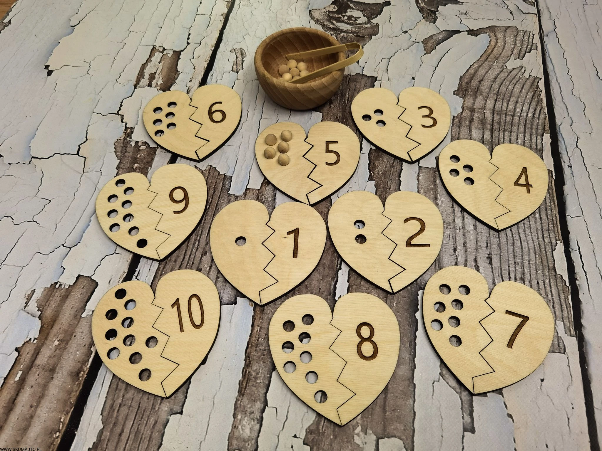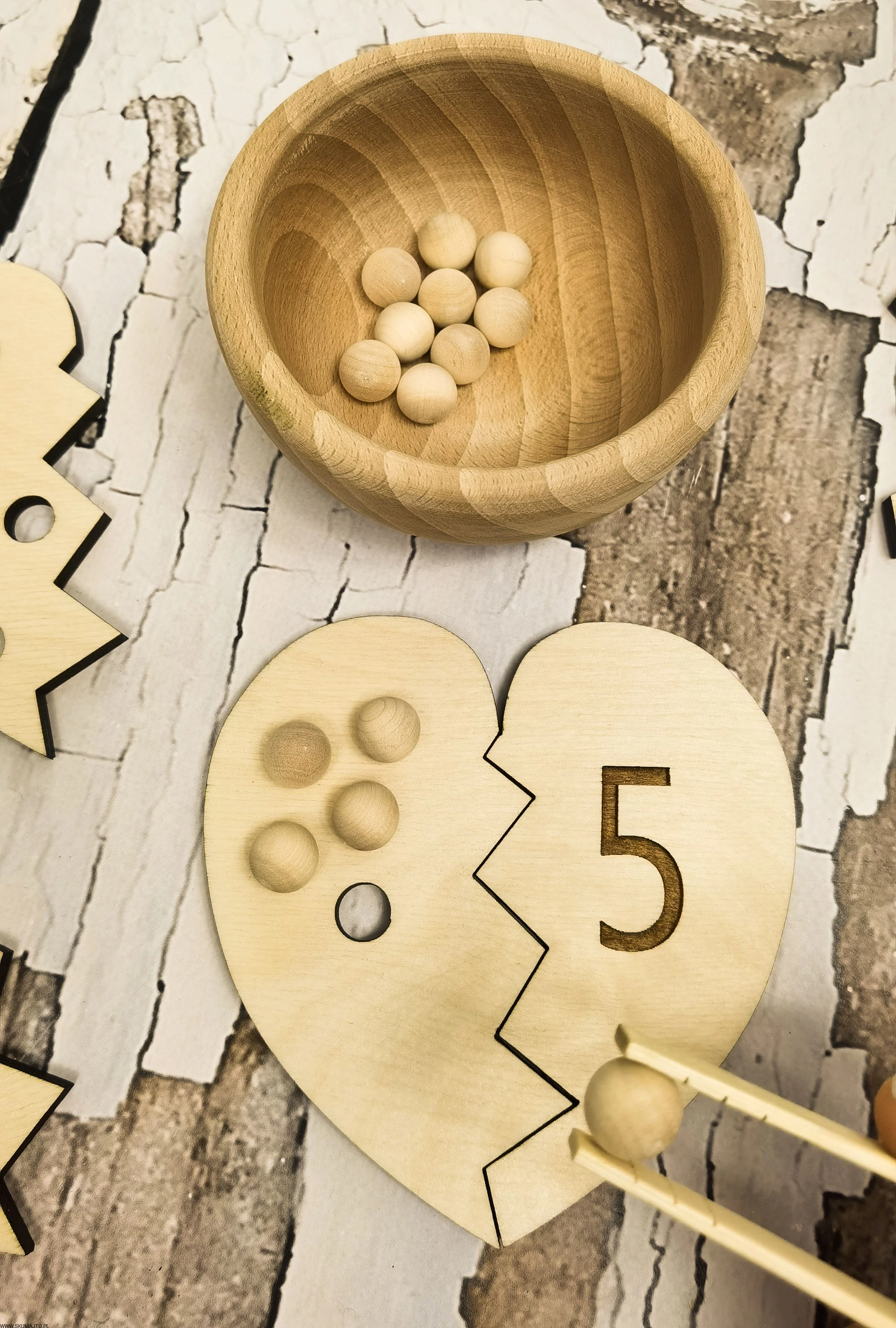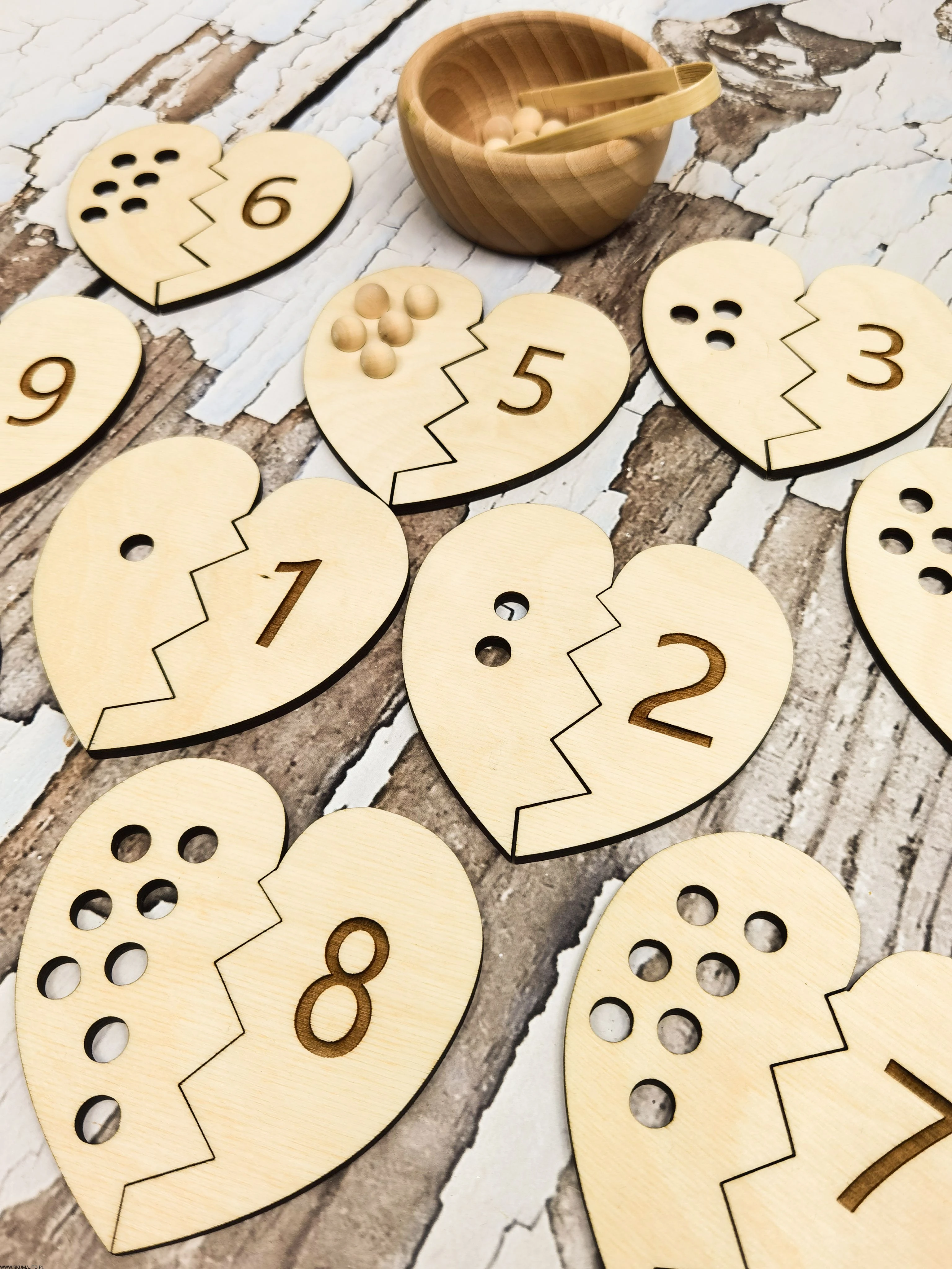 - Łączenie Połówek Serc: Dziecko losuje połówkę serca z dziurkami i przy pomocy bambusowych szczypiec wyciąga z miseczki odpowiednią ilość koralików. Następnie przelicza je głośno, układa na serduszku i szuka połówki serca z odpowiednią cyfrą, łącząc je ze sobą.