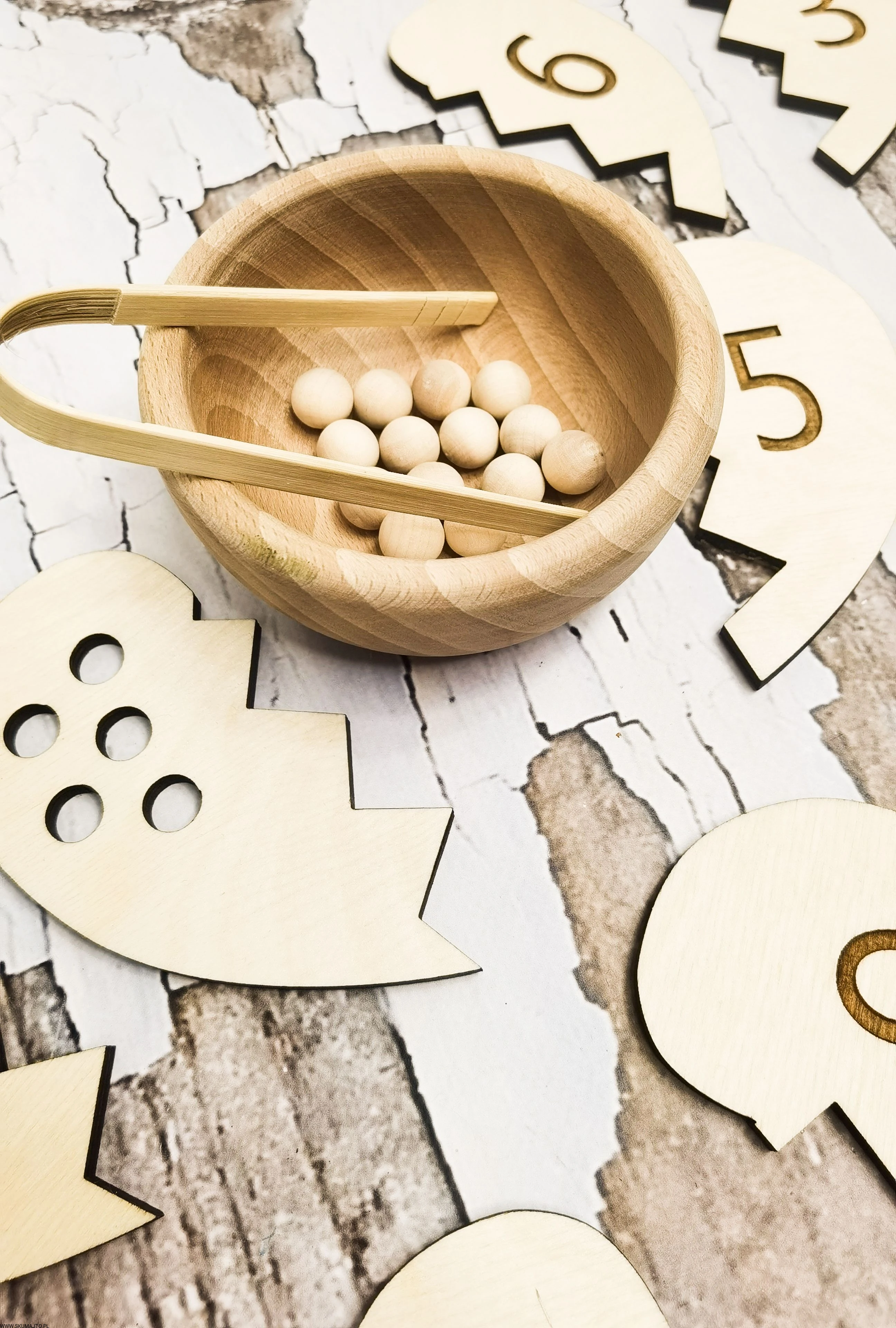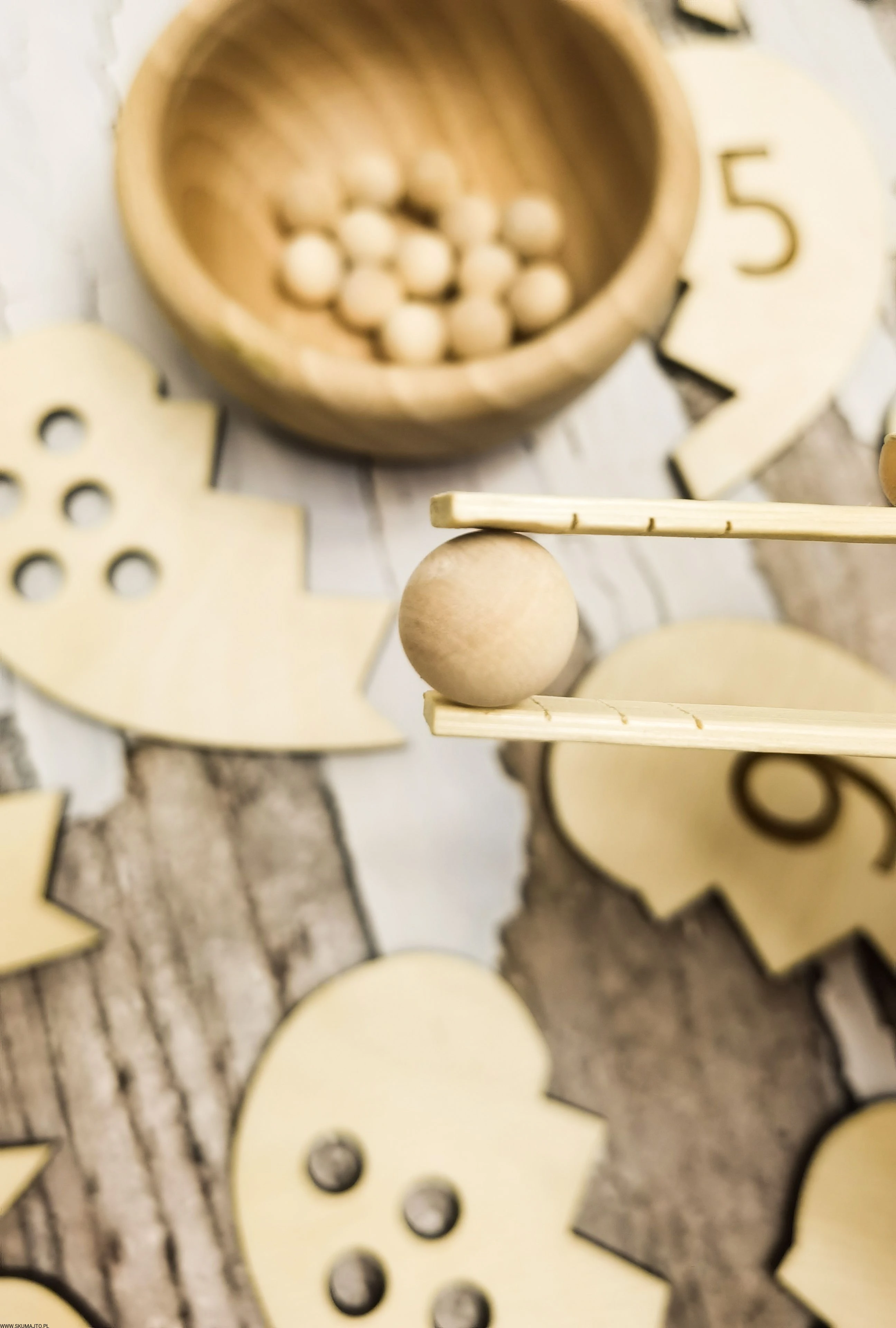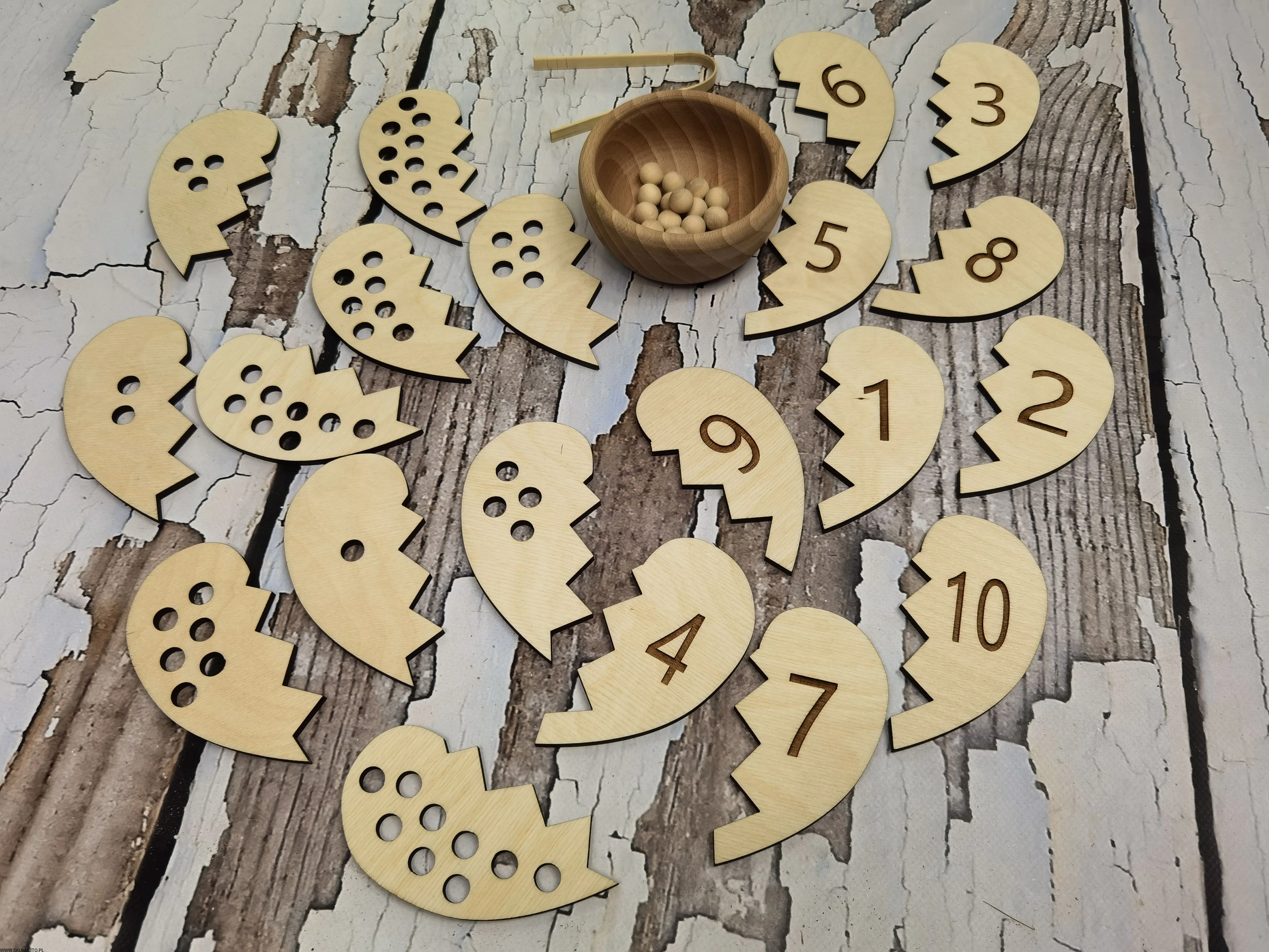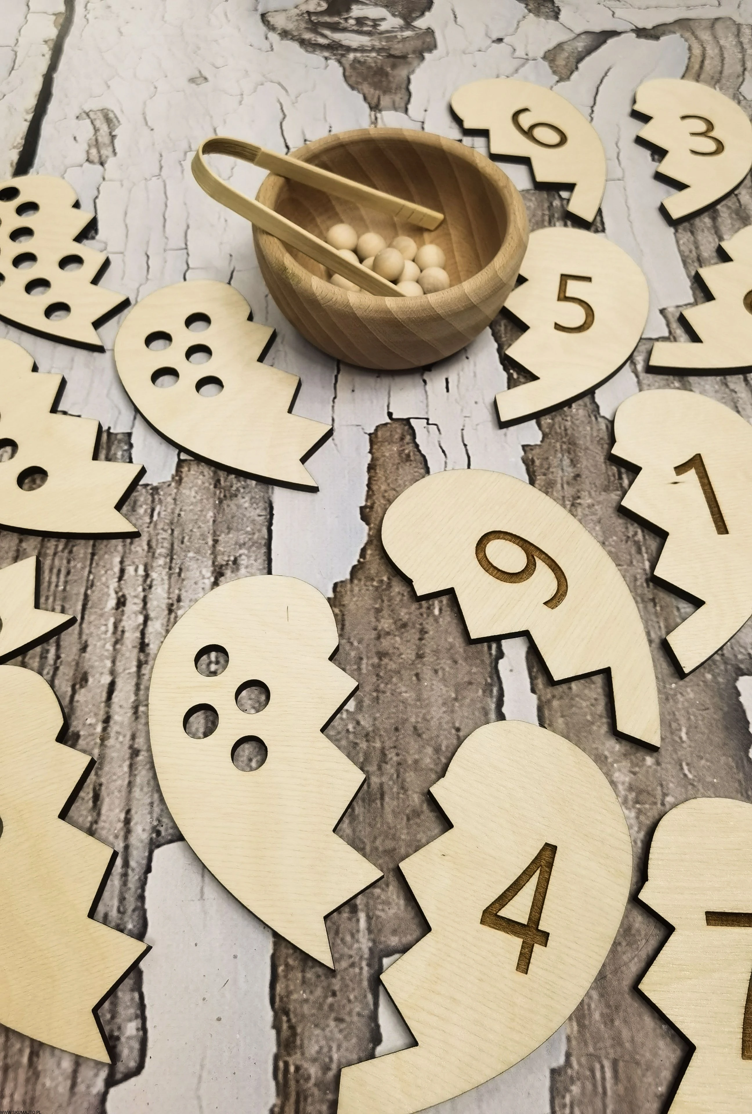 - Łączenie Połówek Serc: Dziecko losuje połówkę serca z dziurkami i przy pomocy bambusowych szczypiec wyciąga z miseczki odpowiednią ilość koralików. Następnie przelicza je głośno, układa na serduszku i szuka połówki serca z odpowiednią cyfrą, łącząc je ze sobą.