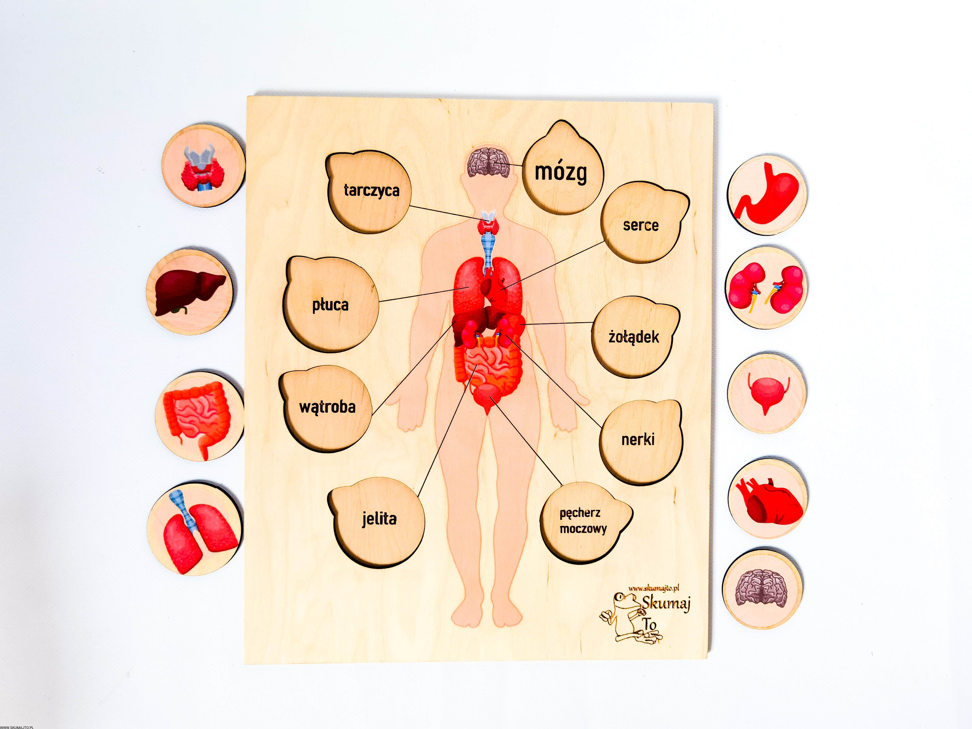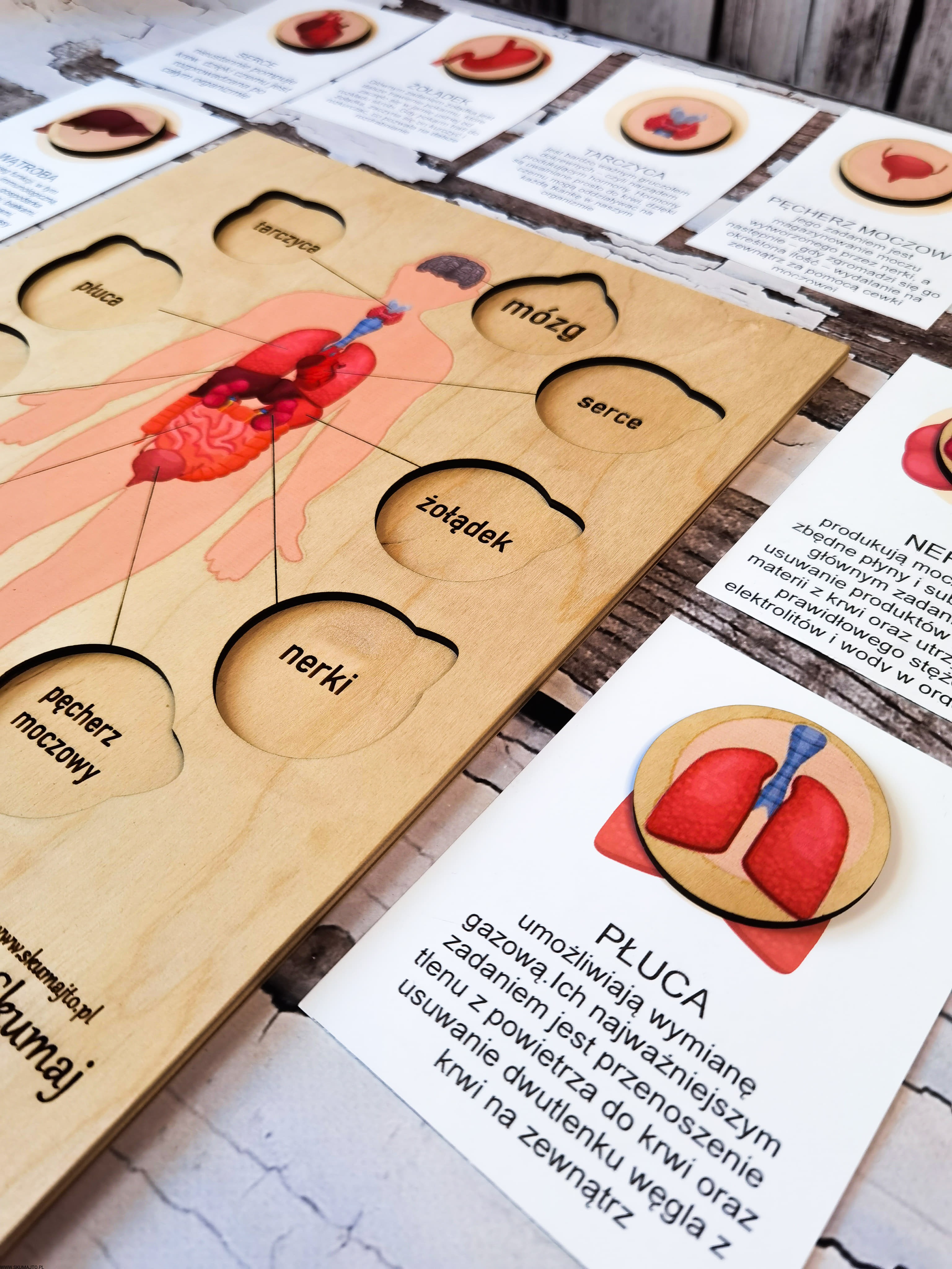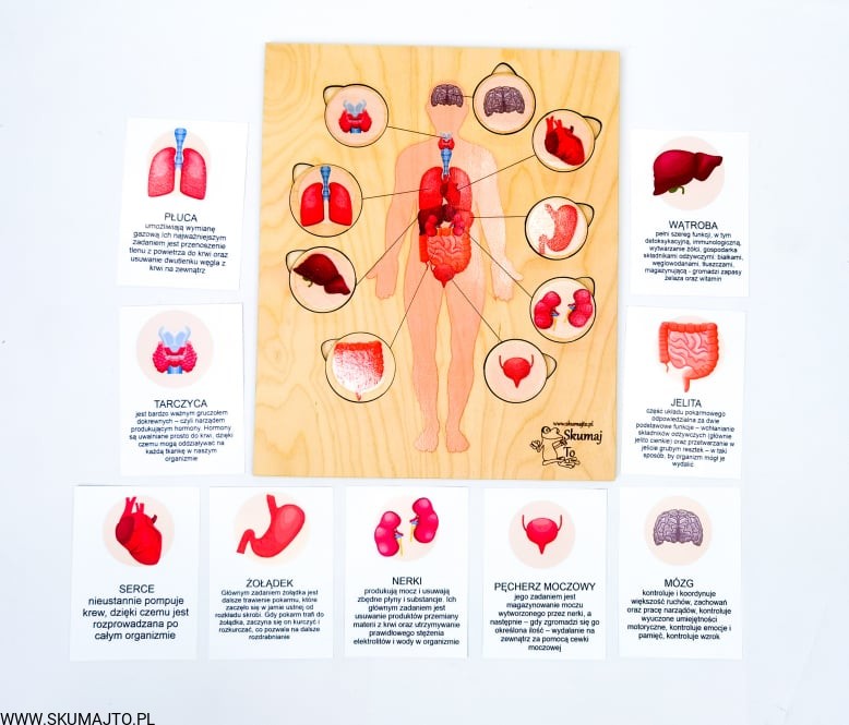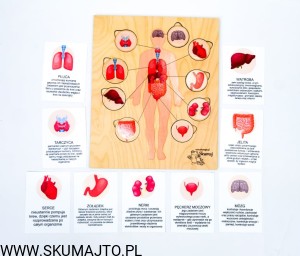 Narządy człowieka, drewniana układanka, podpisy, wyciągane elementy