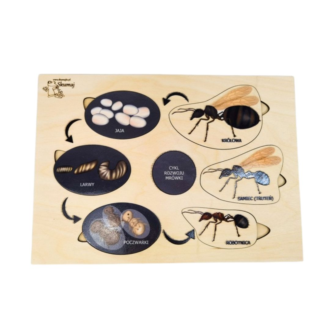 Dobrym uzupełnieniem nauki jest układanka pokazująca cykl rozwojowy mrówki, która pomaga zrozumieć kolejne etapy życia owada.