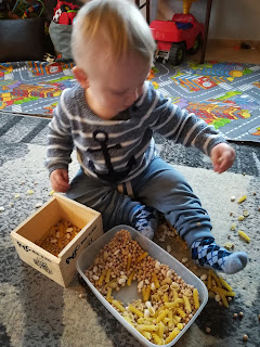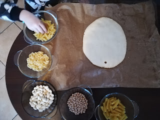 Ostatnio zakręciłam szybciutko dwie porcje i zaczęliśmy zabawę. Do miseczek trafiły różne makarony, groszek i fasola. Michał zachwycony wyklejał swój obraz, a mama kleiła afrykańskie zwierzaki. Zabawa wspaniała a przepis na masę solną jest bardzo prosty: