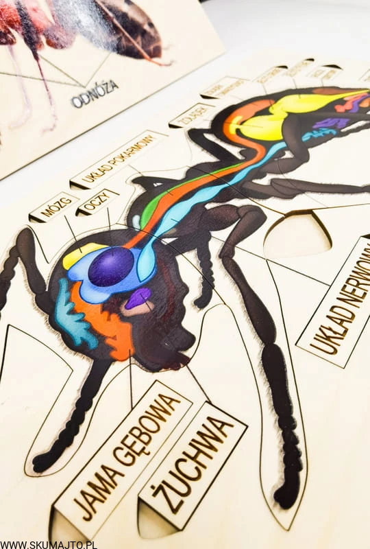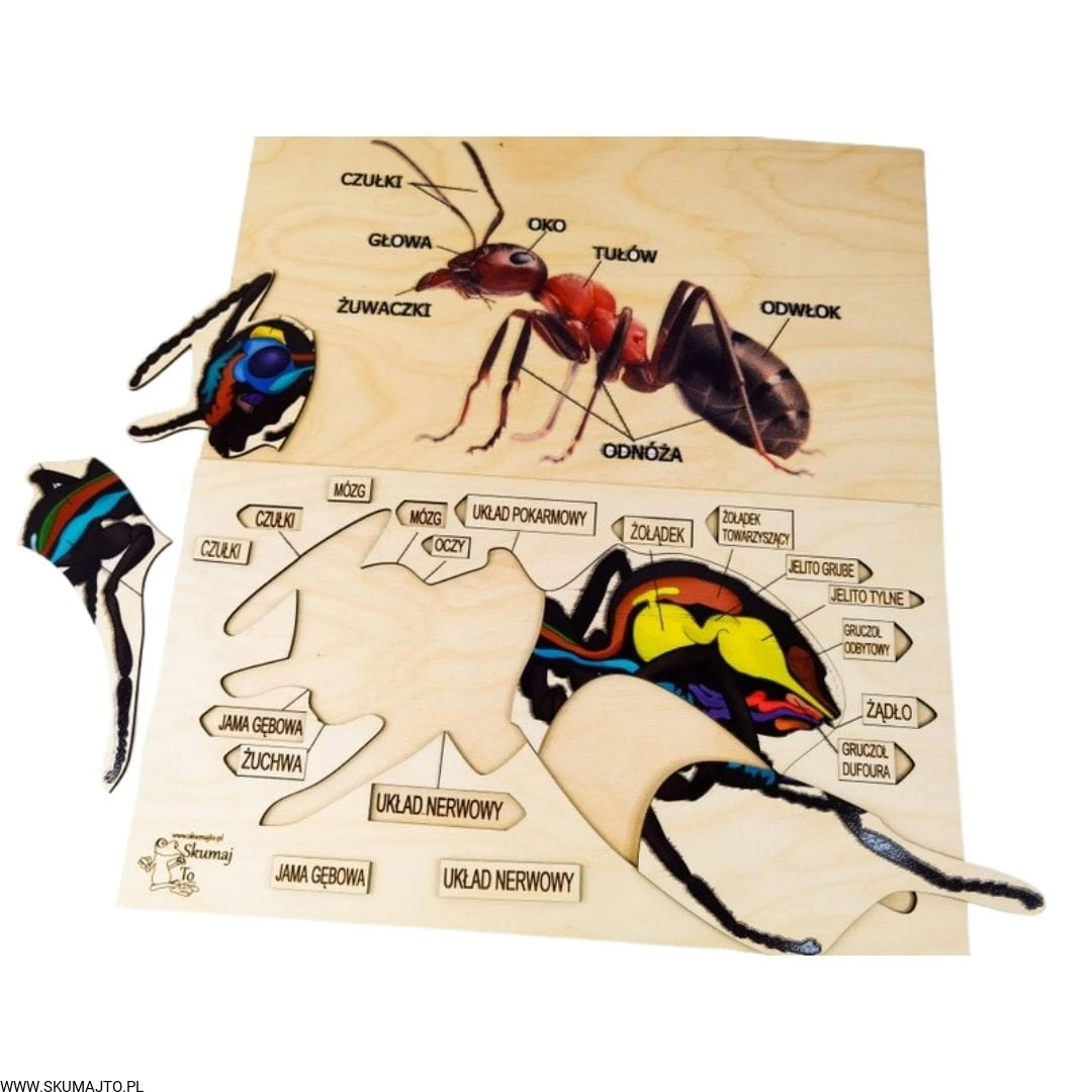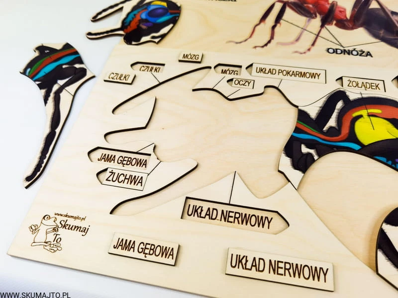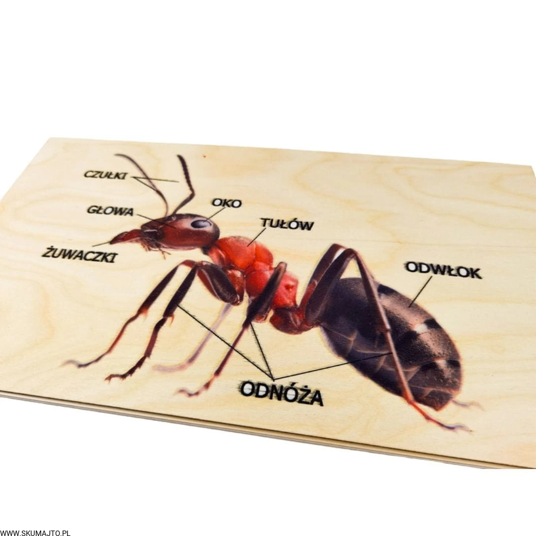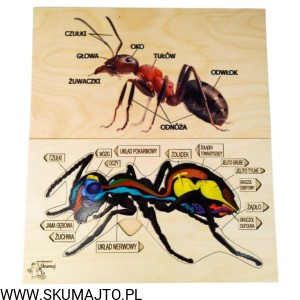 Anatomia mrówki, drewniana układanka, budowa mrówki, wyciągane elementy z podpisami