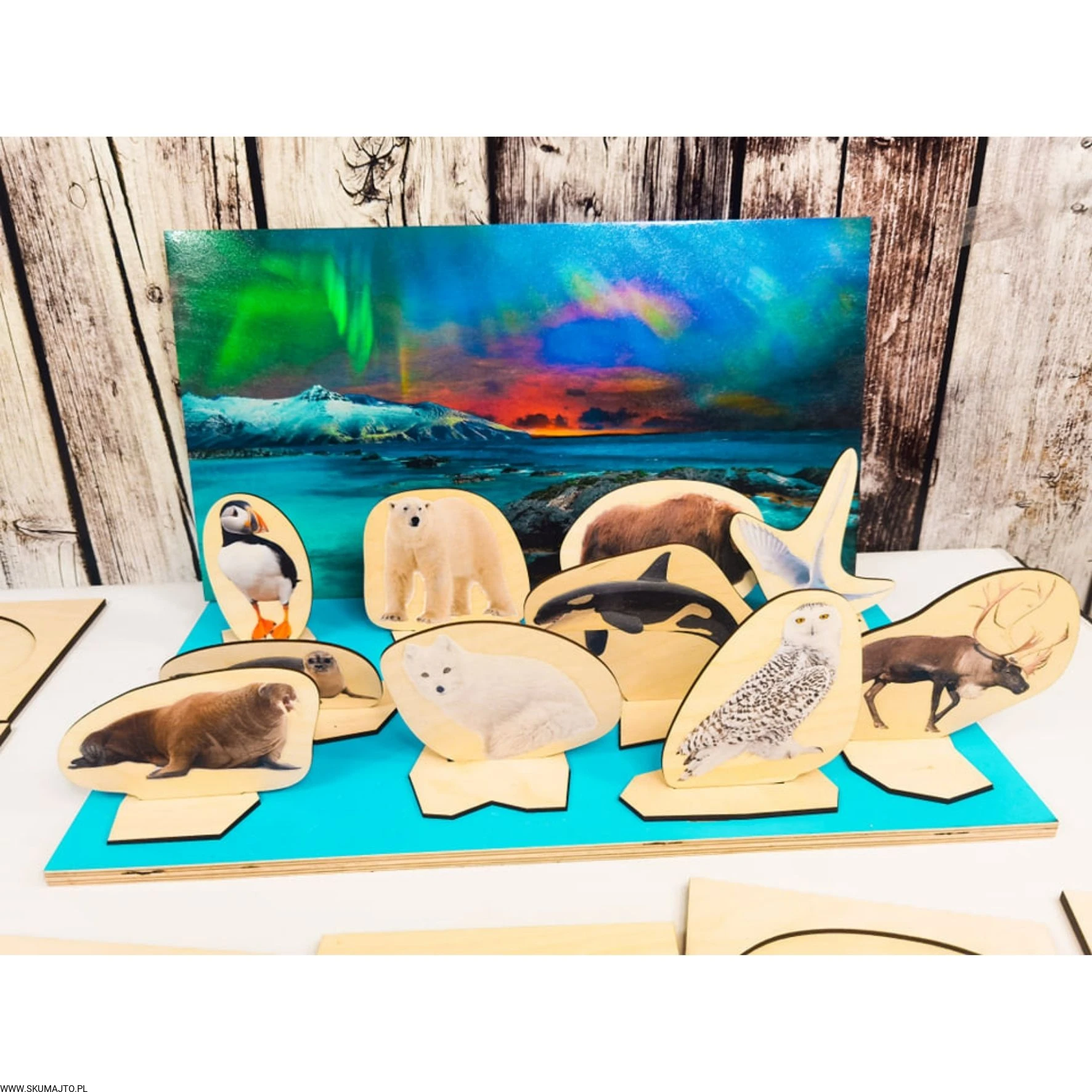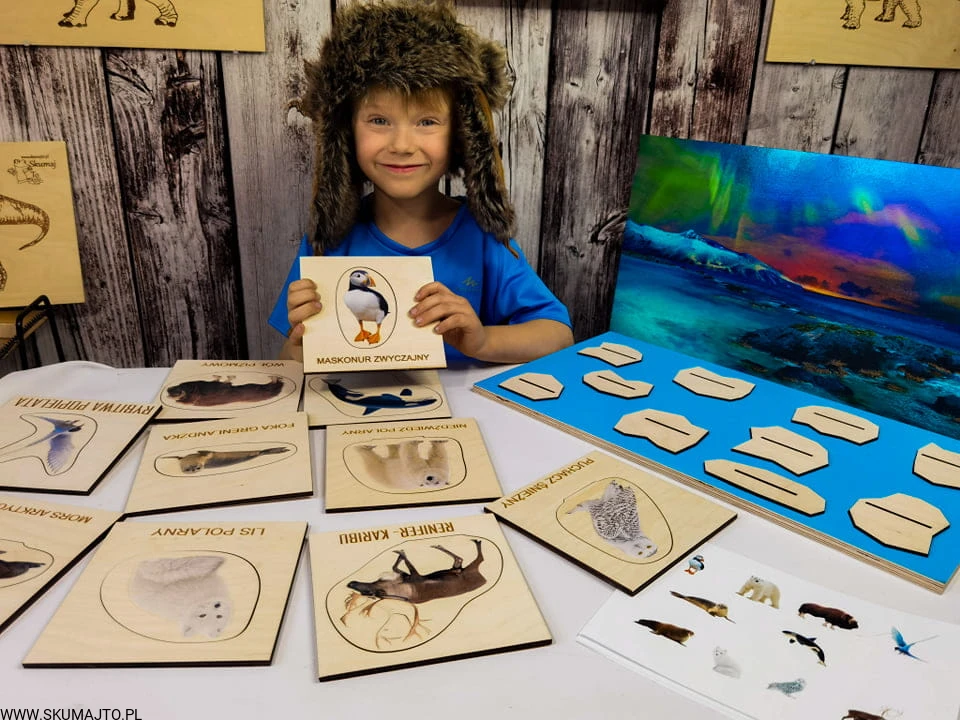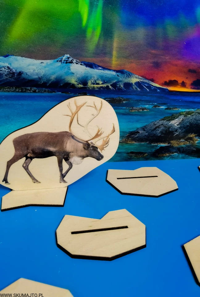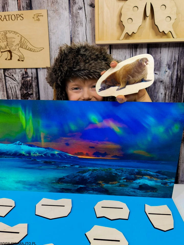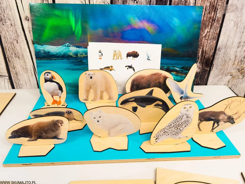 Arktyka, drewniana układanka, makieta, zwierzęta Arktyki, zorza polarna, odwzorowywanie