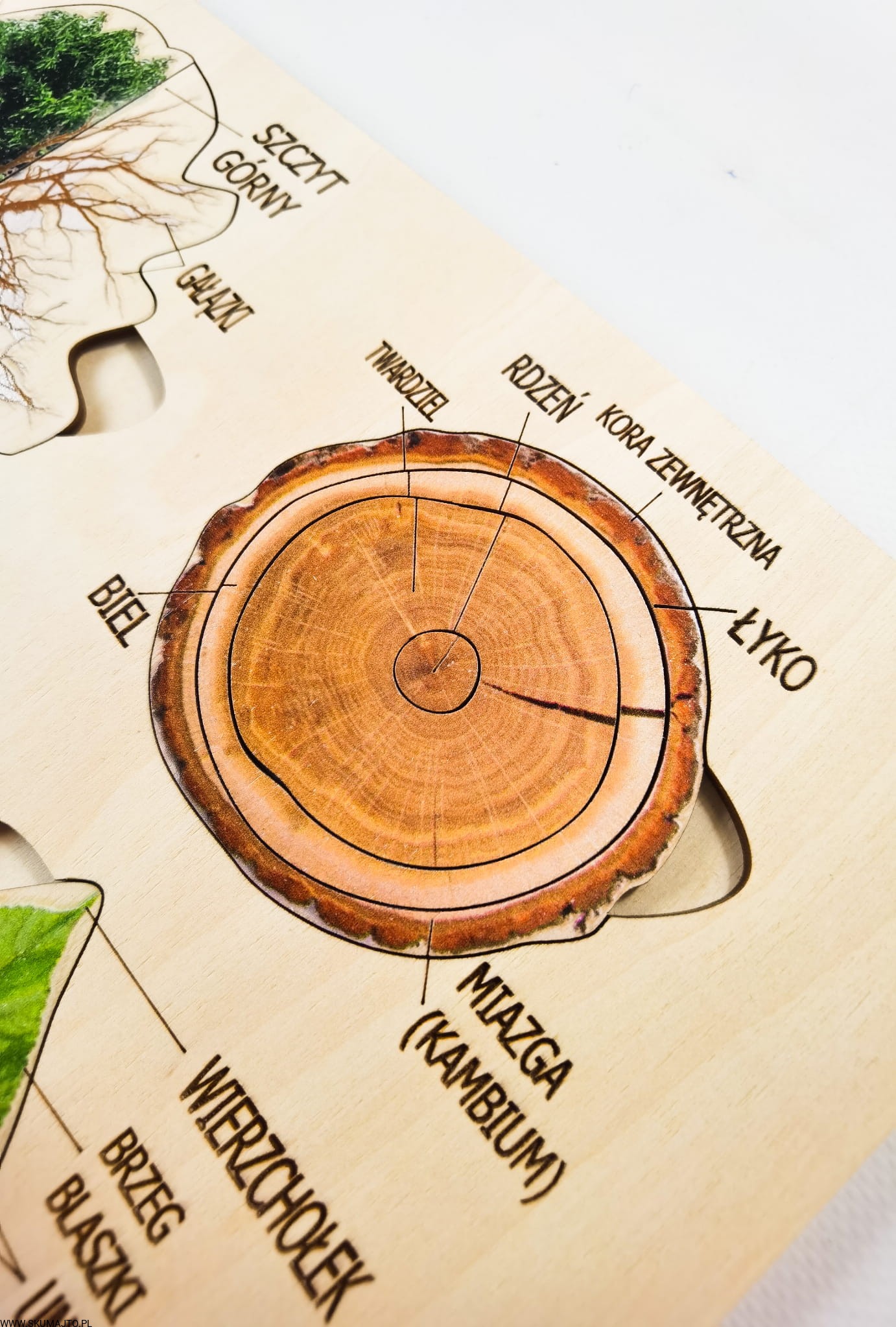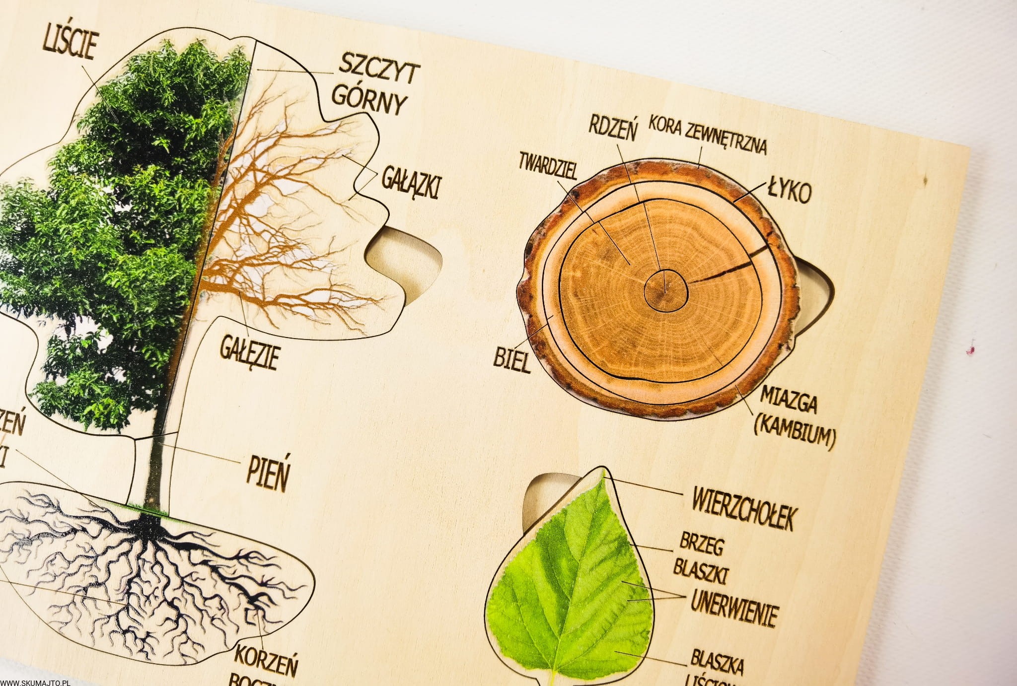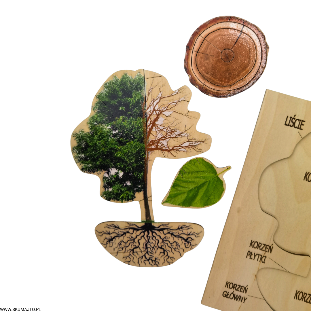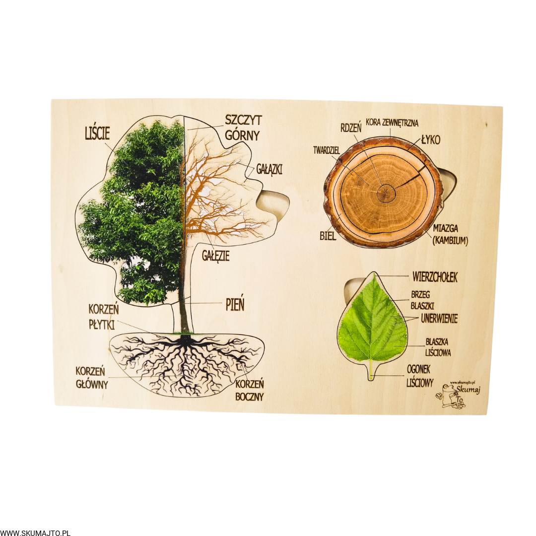 - 9 Ruchomych Elementów: Przedstawiających różne części drzewa, w tym przekrój przez pień i budowę liścia.
