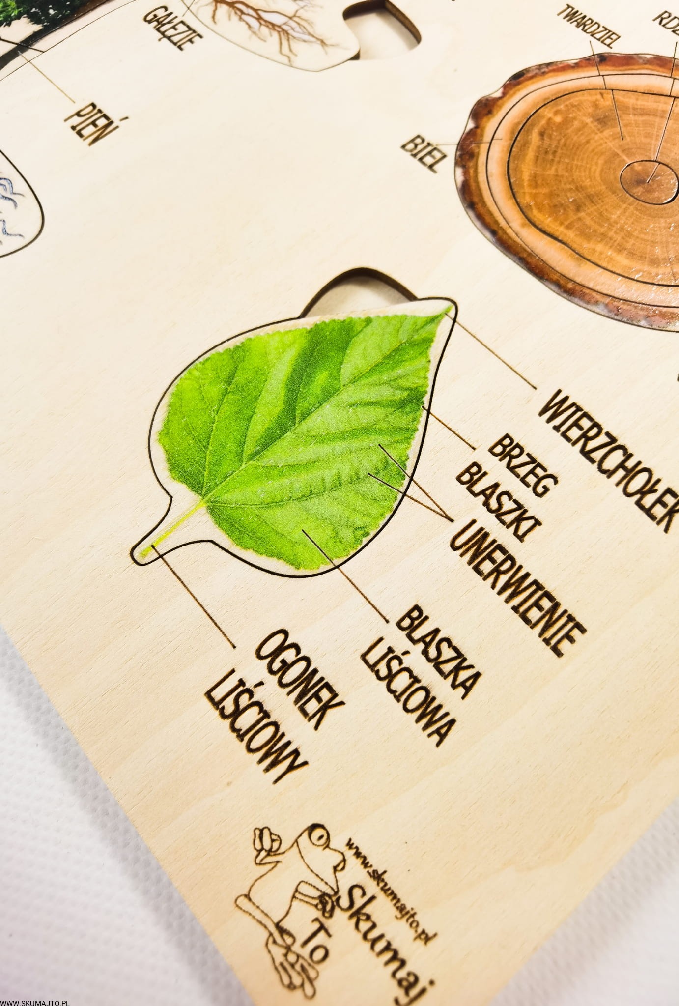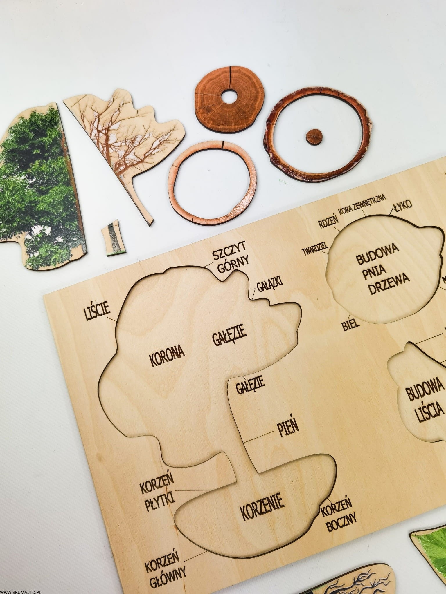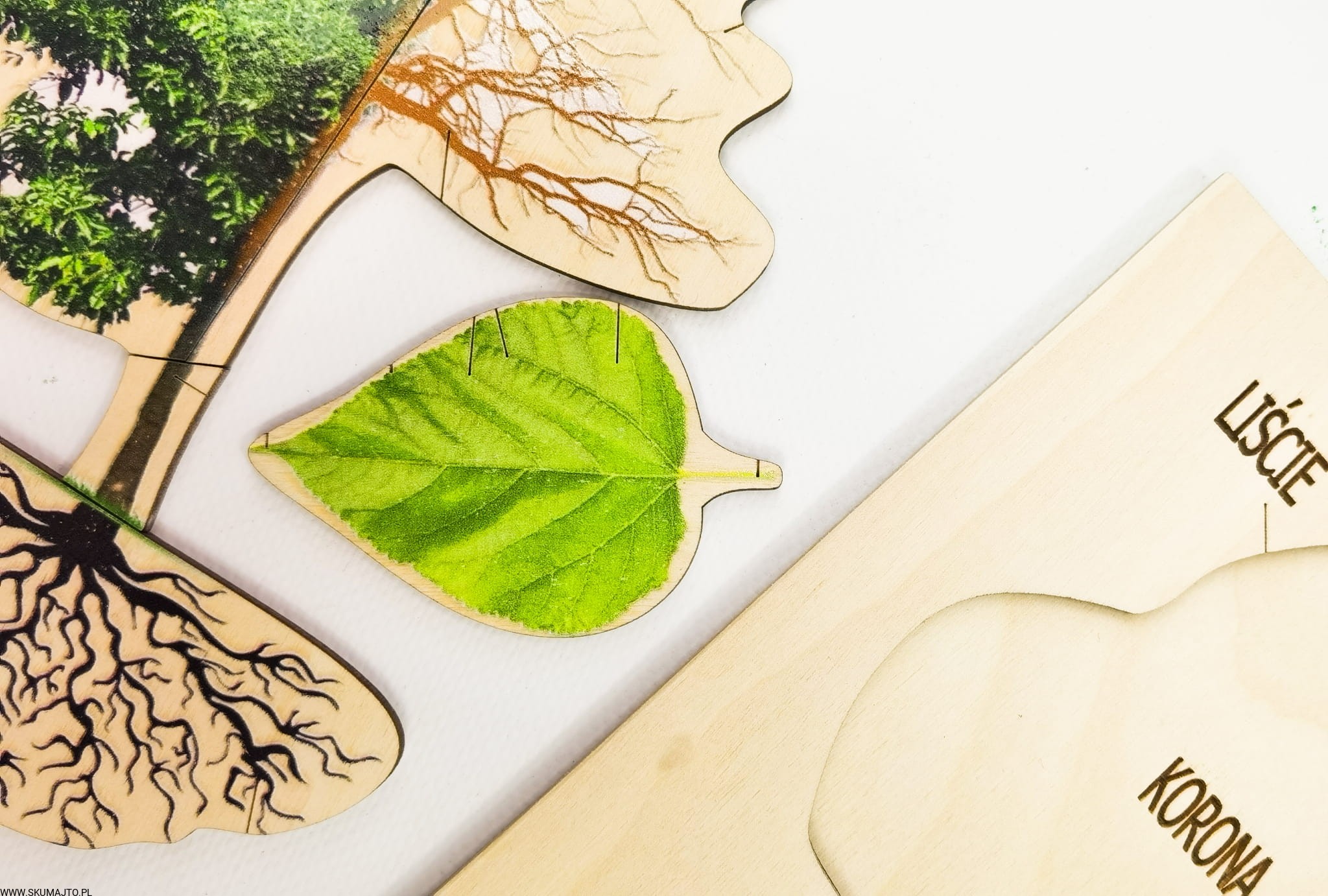 - 9 Ruchomych Elementów: Przedstawiających różne części drzewa, w tym przekrój przez pień i budowę liścia.