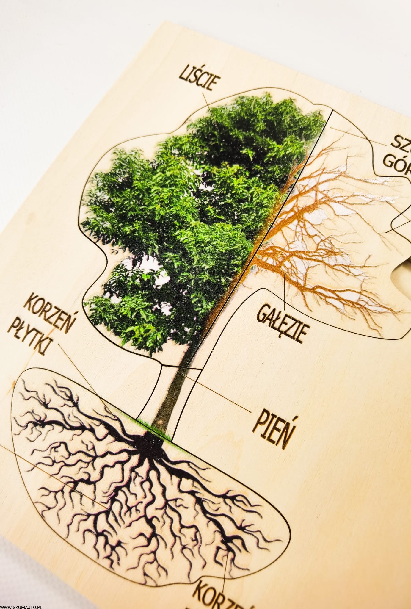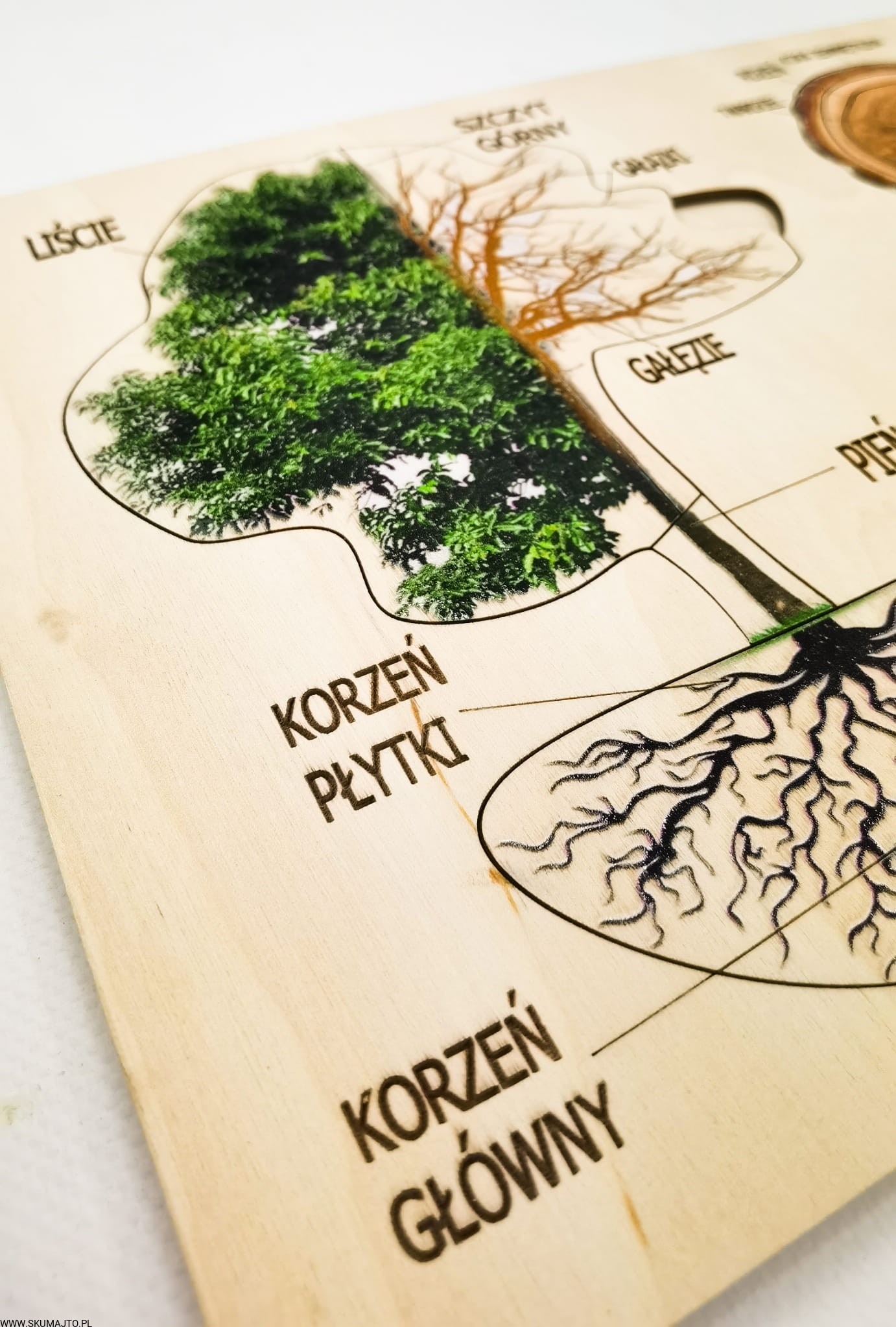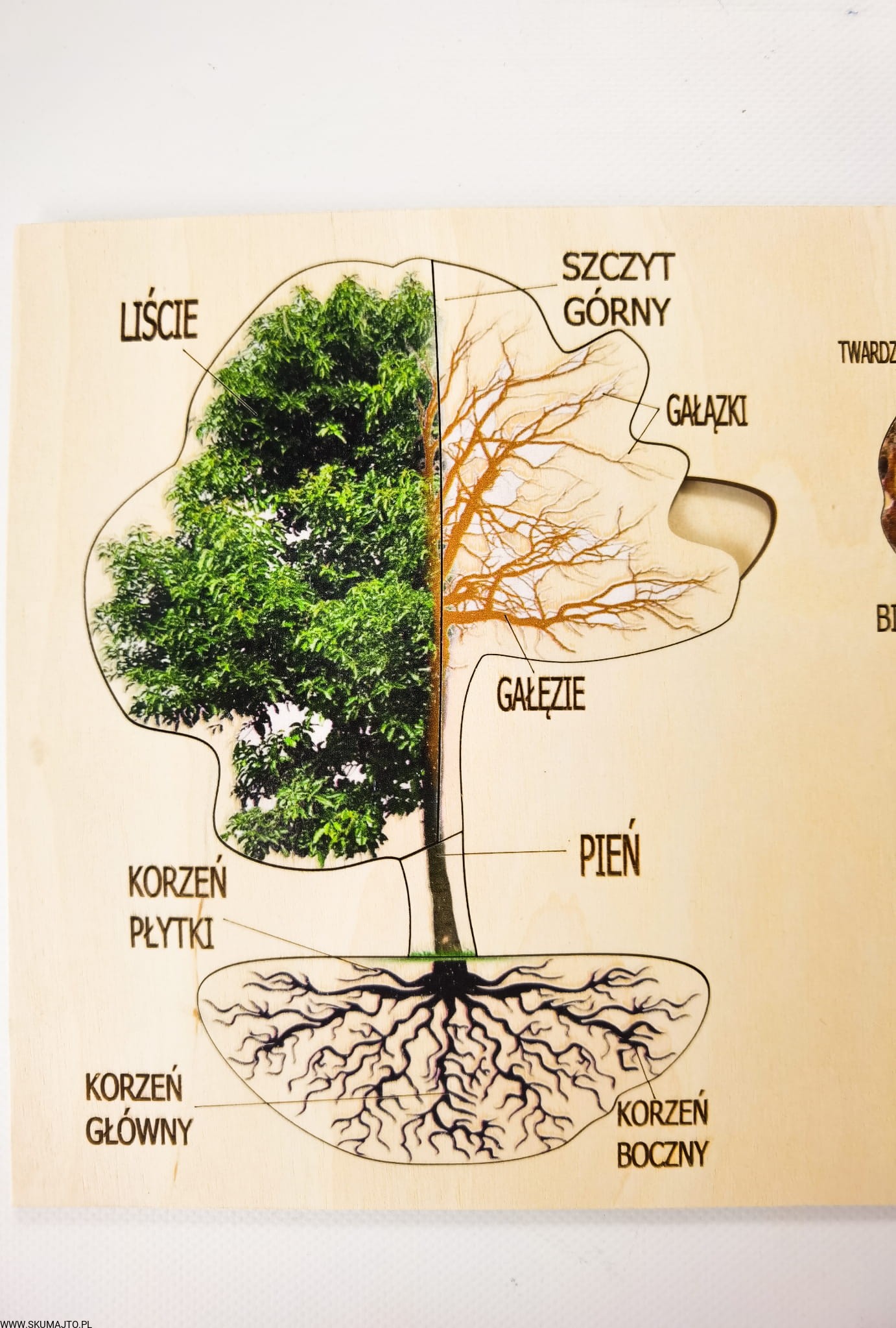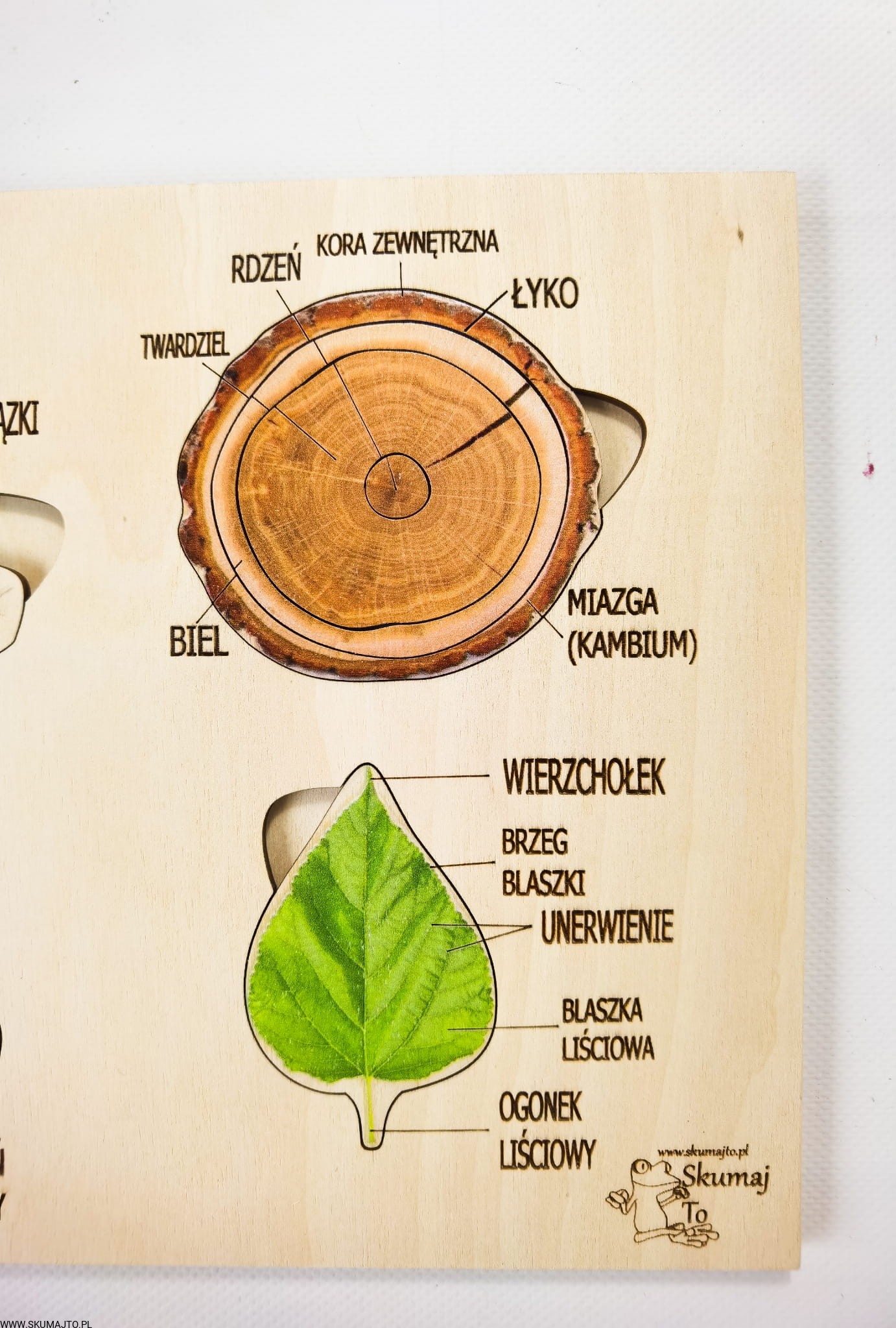 - 9 Ruchomych Elementów: Przedstawiających różne części drzewa, w tym przekrój przez pień i budowę liścia.