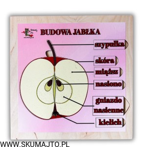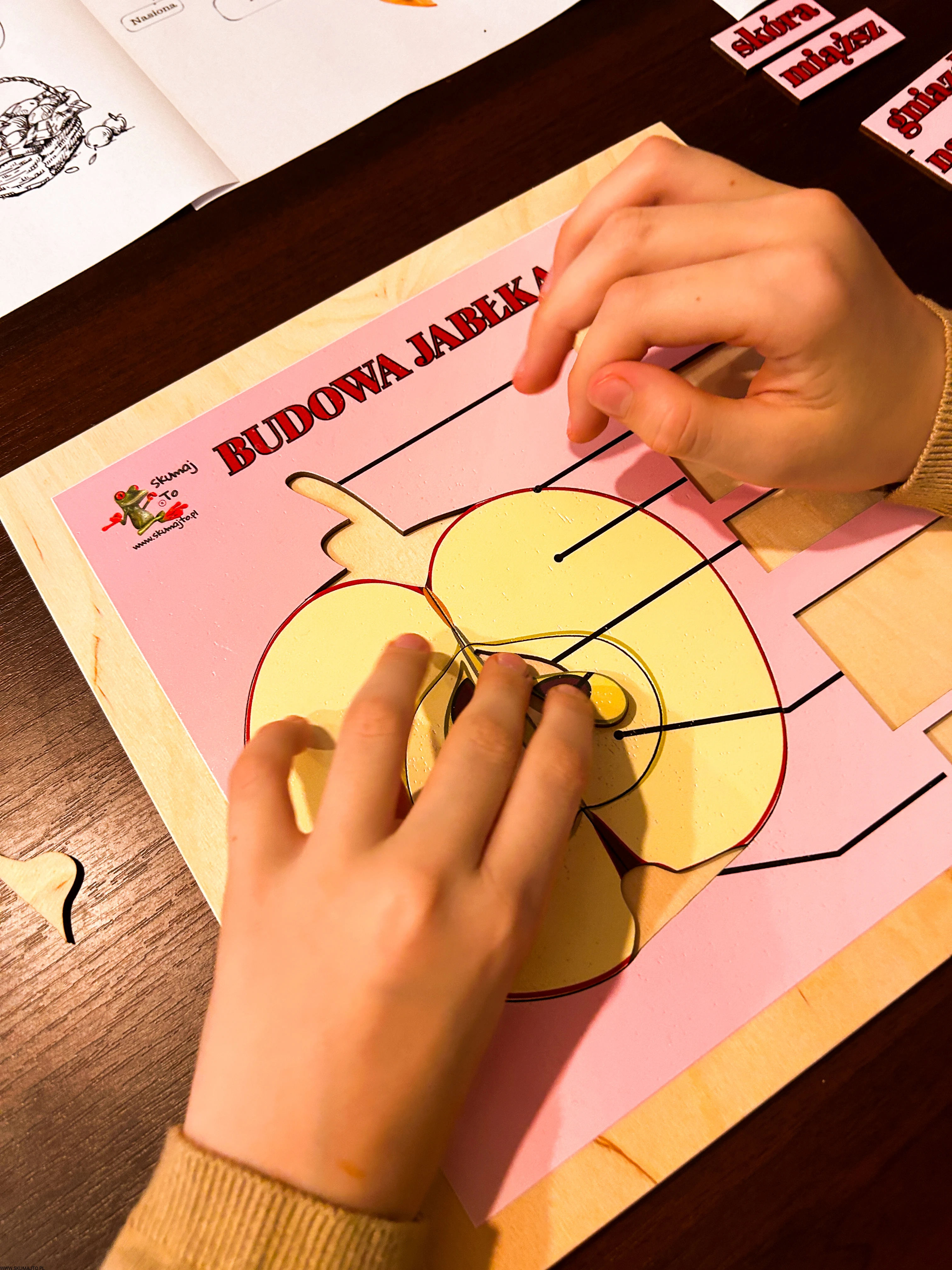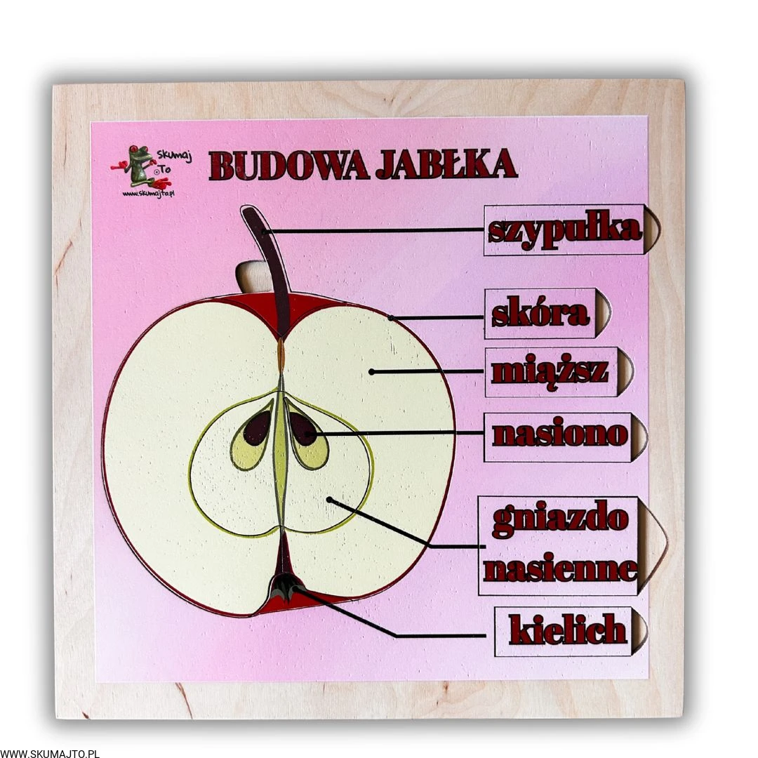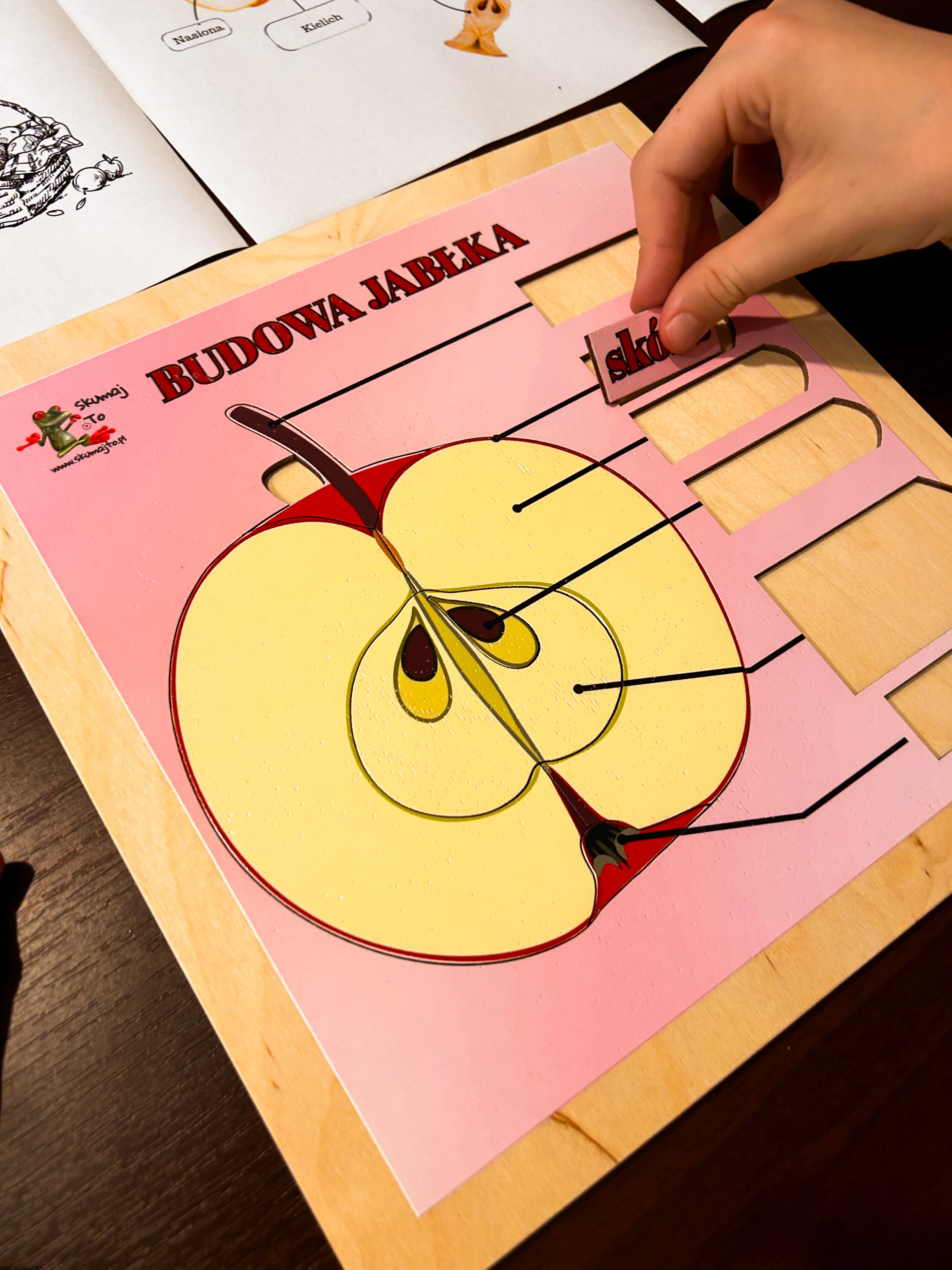 budowa jabłka dla dzieci, układanka edukacyjna owoce, drewniana pomoc dydaktyczna, nauka przez zabawę, karty edukacyjne jabłko, materiały edukacyjne przedszkole, edukacja przyrodnicza, rozwój słownictwa dziecka, zabawy z jabłkiem, montessori owoce, nauka o owocach dla dzieci