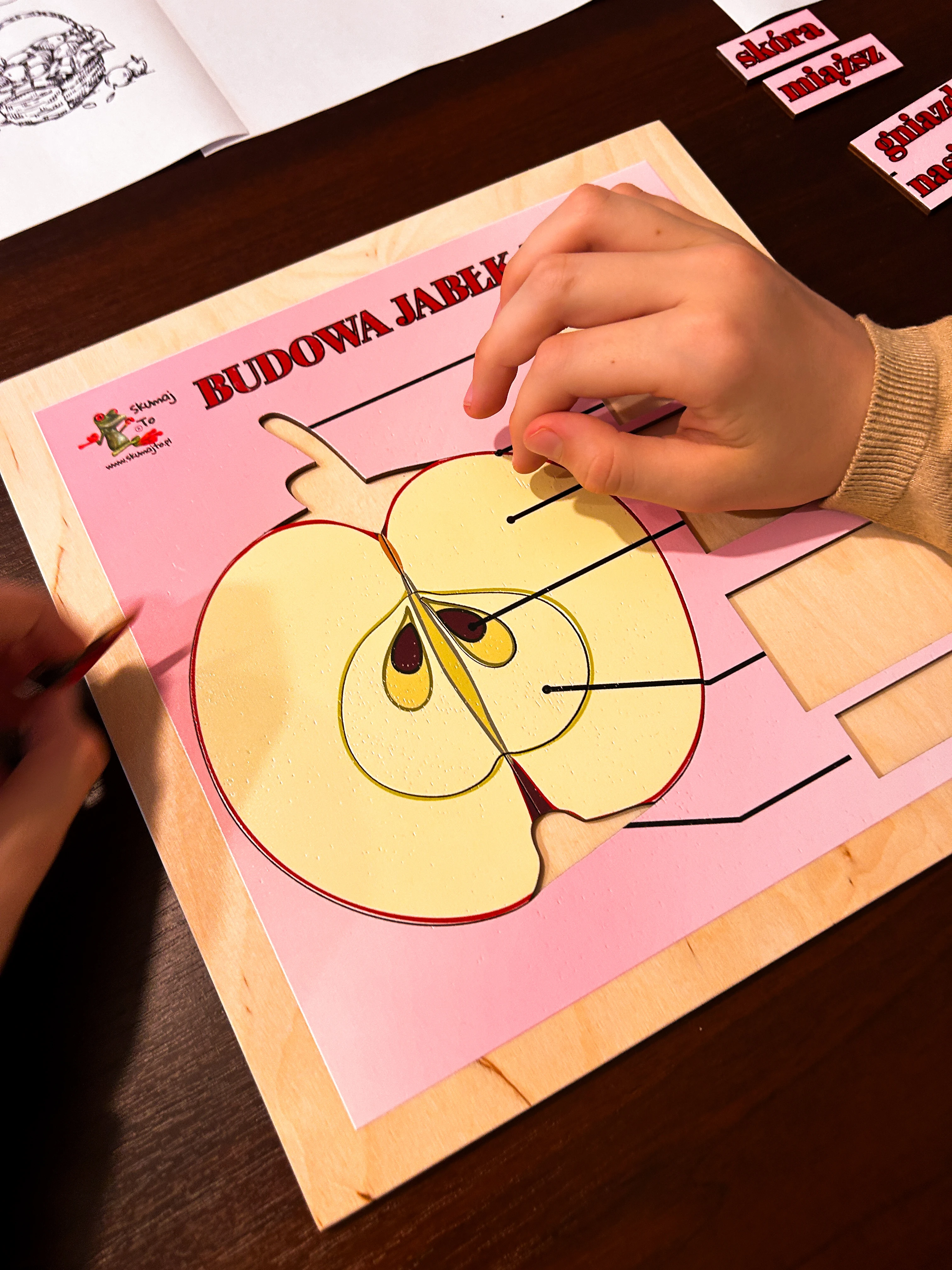 Ruchome elementy do dopasowywania – każda część jabłka może zostać wyjęta i dopasowana z powrotem na miejsce, co pozwala dziecku poznawać budowę owocu przez działanie i doświadczanie.