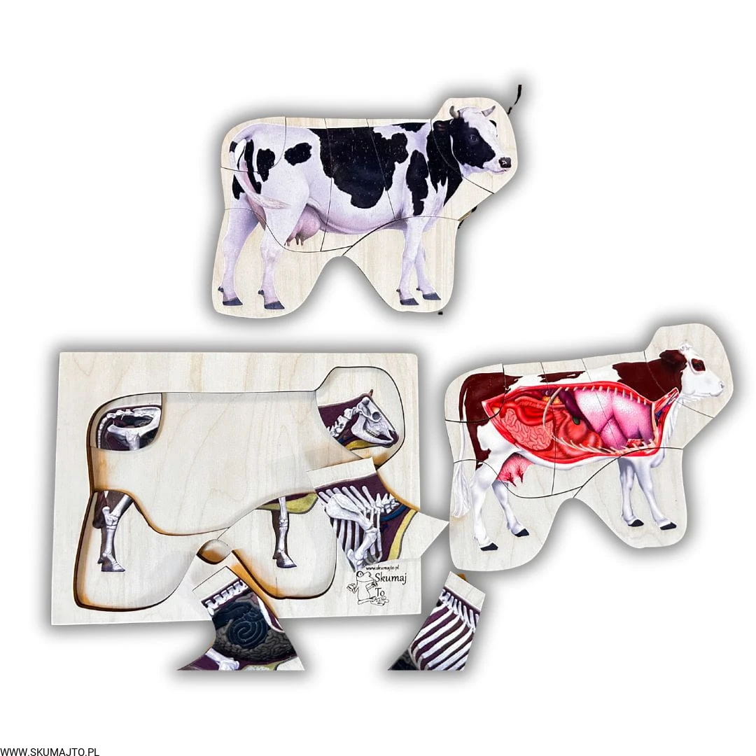 „Budowa krowy” to wyjątkowa, trójwarstwowa układanka, która zabiera dzieci na fascynującą podróż w głąb ciała jednego z najważniejszych zwierząt gospodarskich. Zabawka nie tylko zachwyca precyzją i starannością wykonania, ale przede wszystkim edukuje i inspiruje do zgłębiania tajemnic biologii. Każda warstwa układanki to krok w stronę lepszego zrozumienia, jak funkcjonuje organizm krowy – od jej szkieletu, przez narządy wewnętrzne, aż po wygląd zewnętrzny.