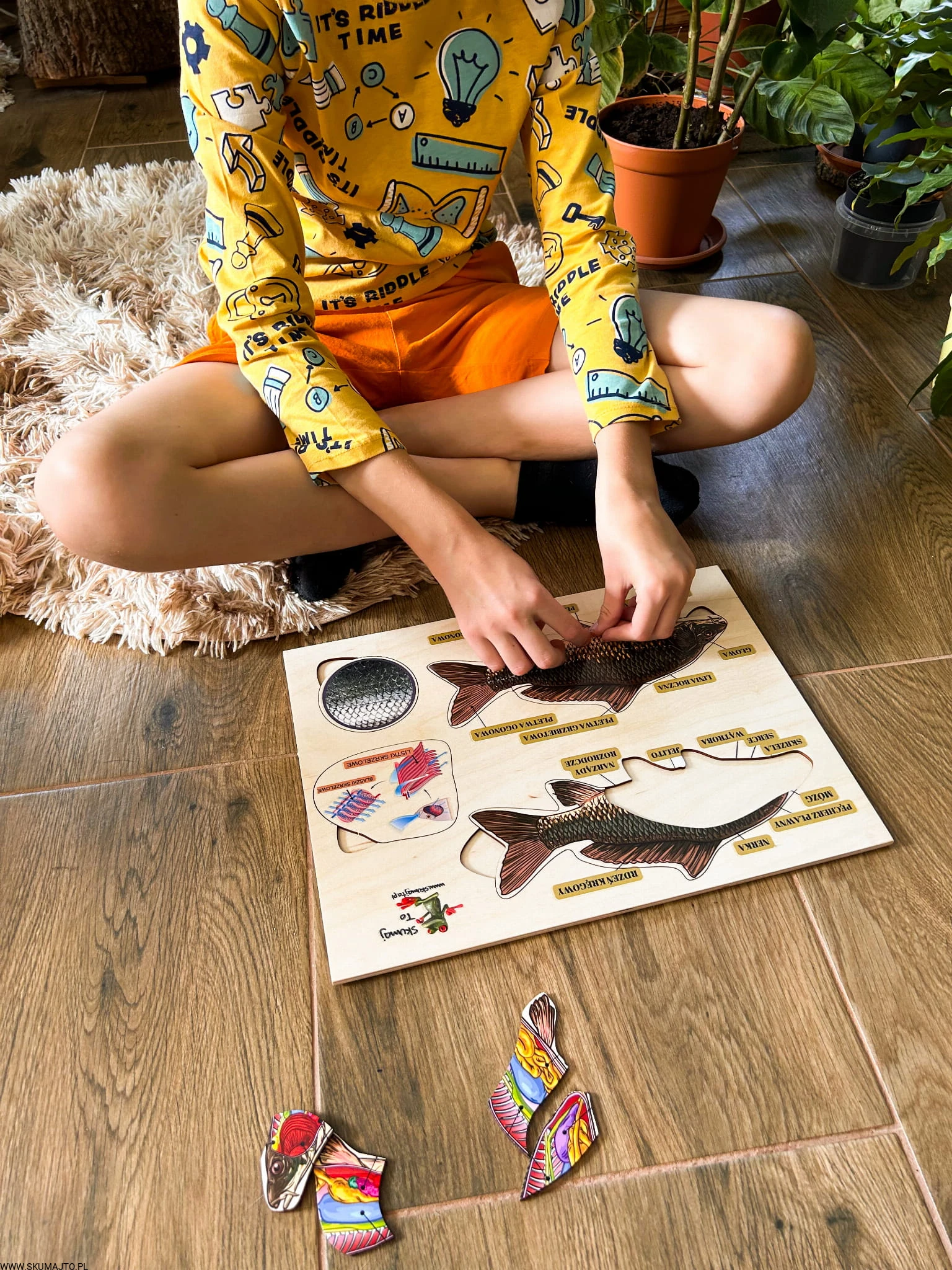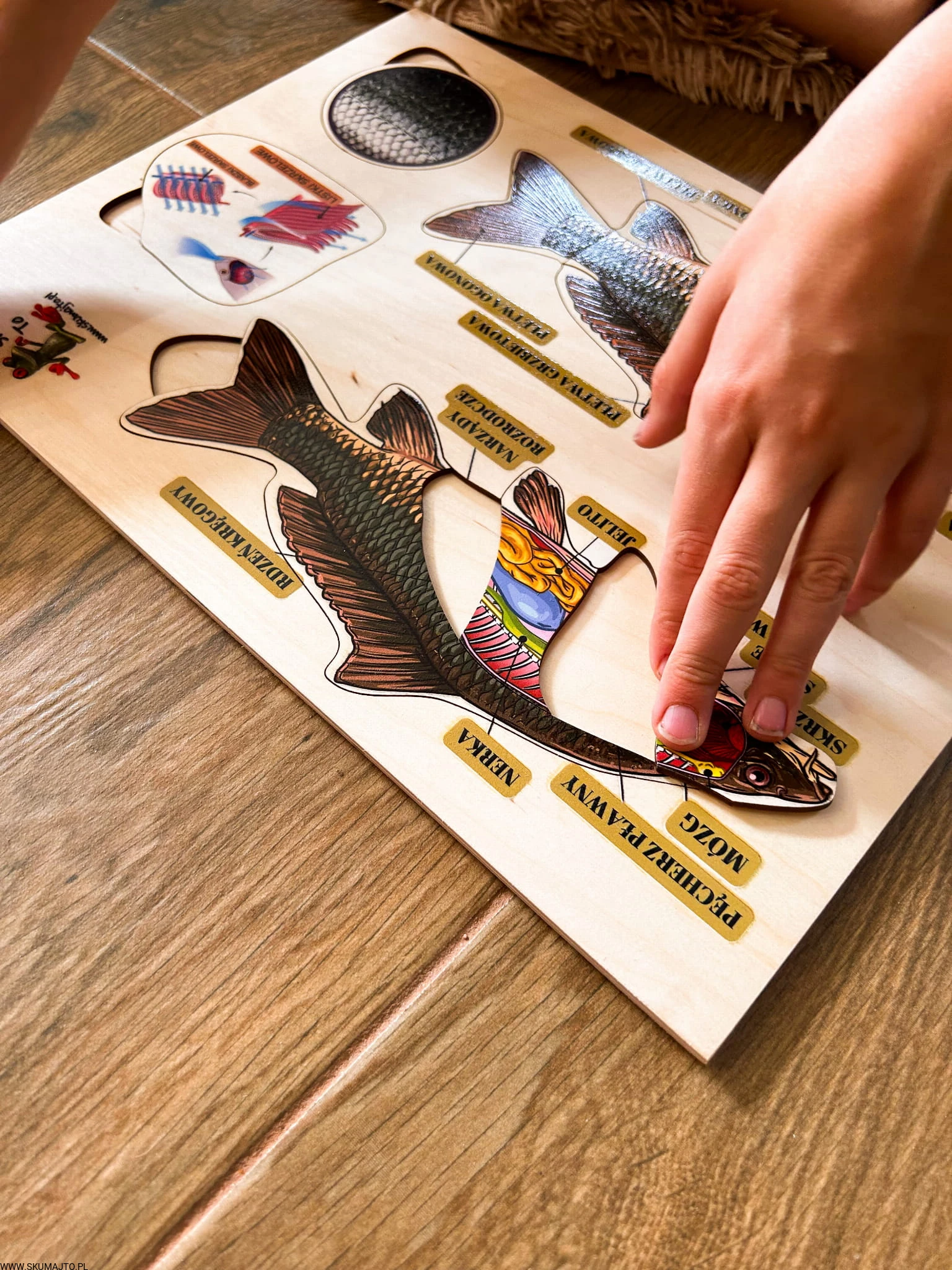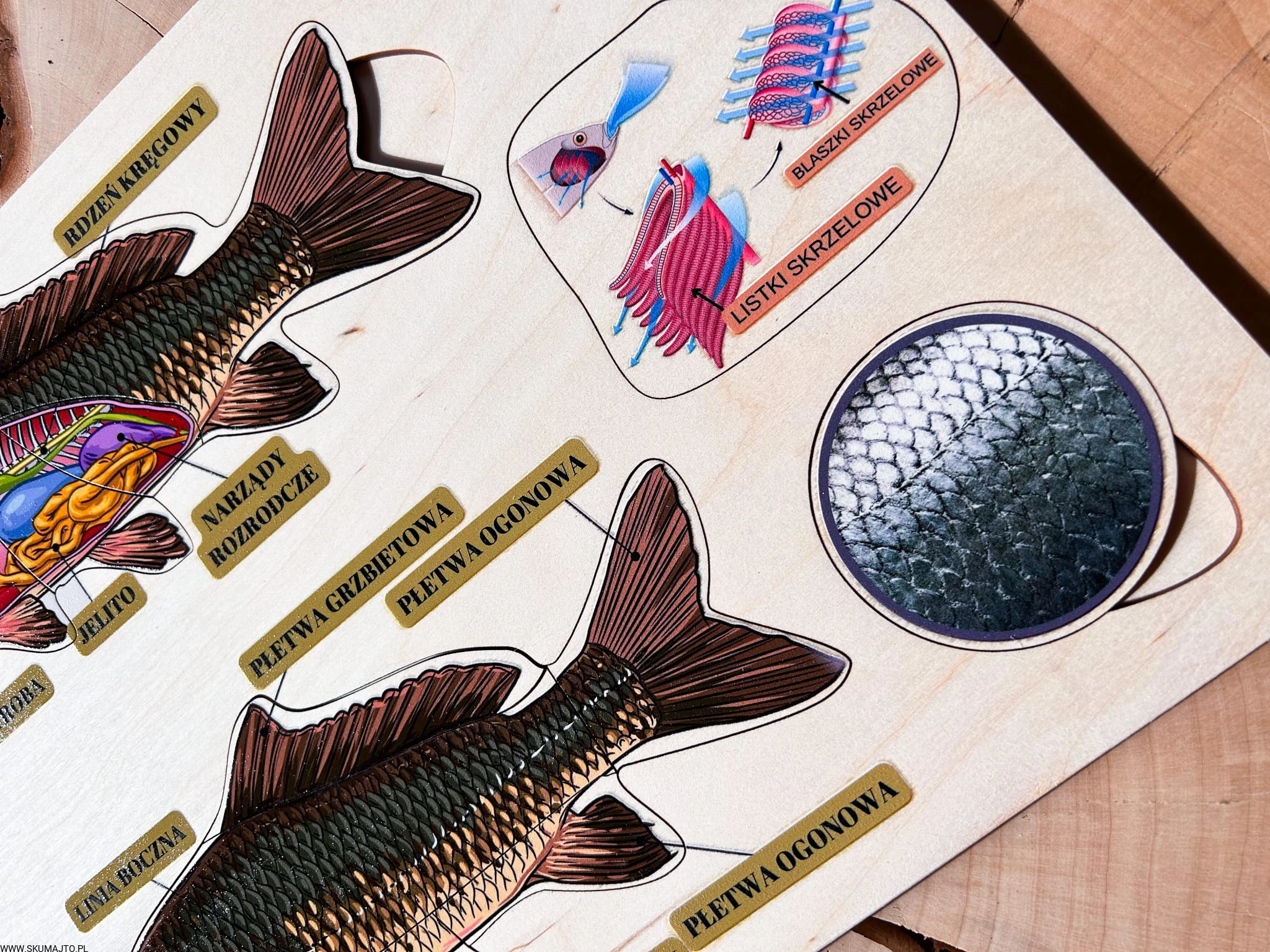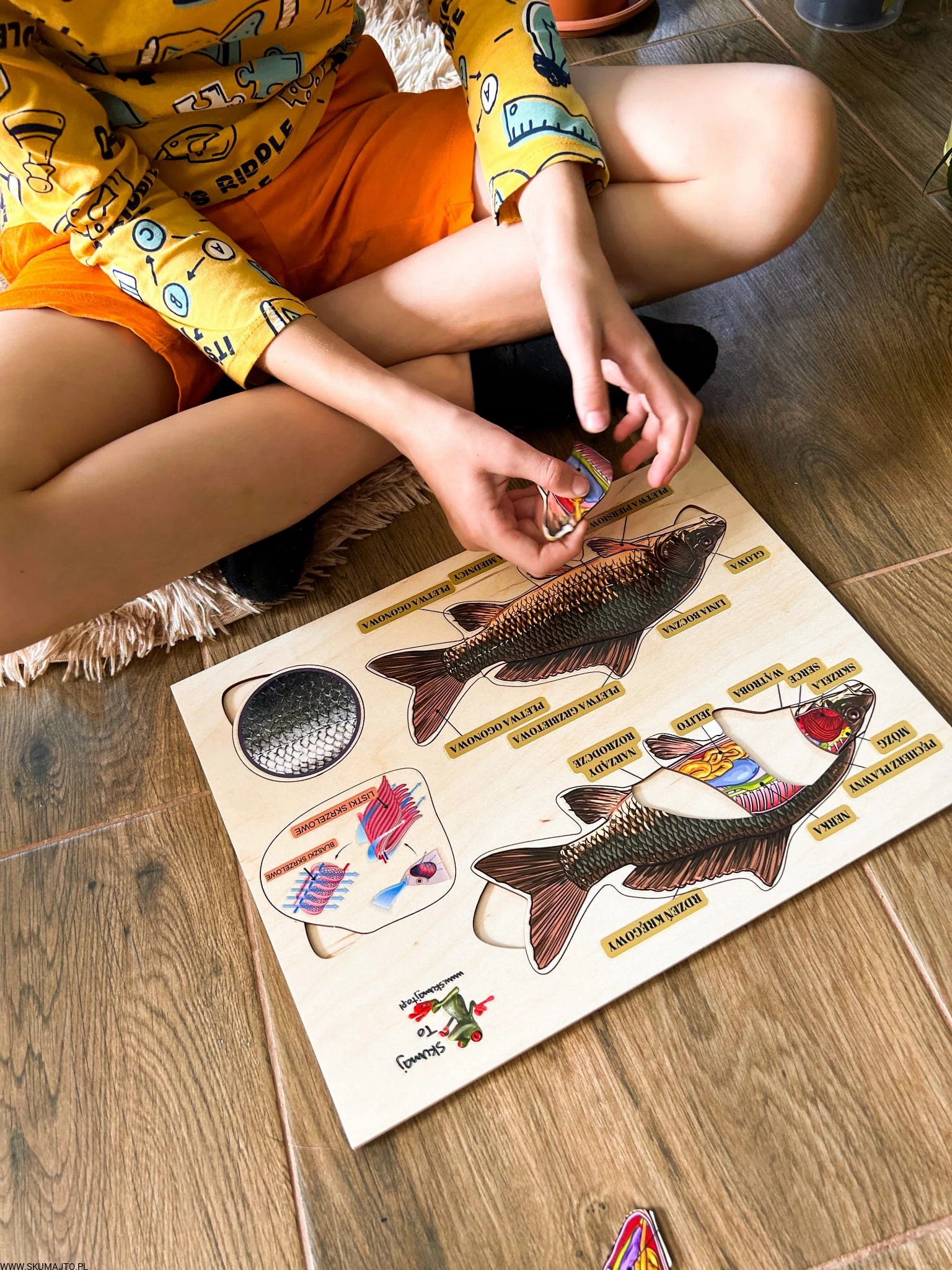 Budowa ryby układanka, anatomia ryb, drewniana układanka o rybie, ciekawostki o rybach