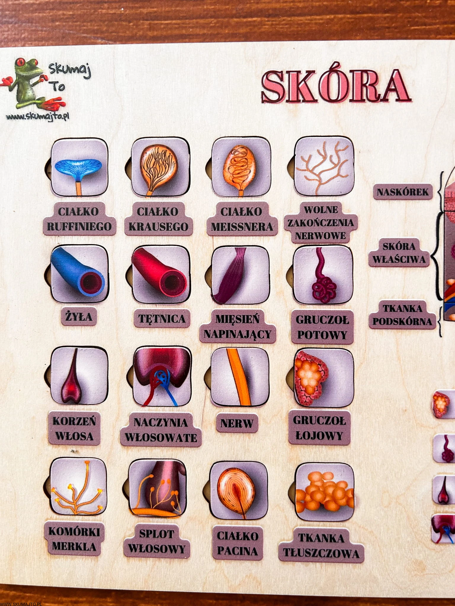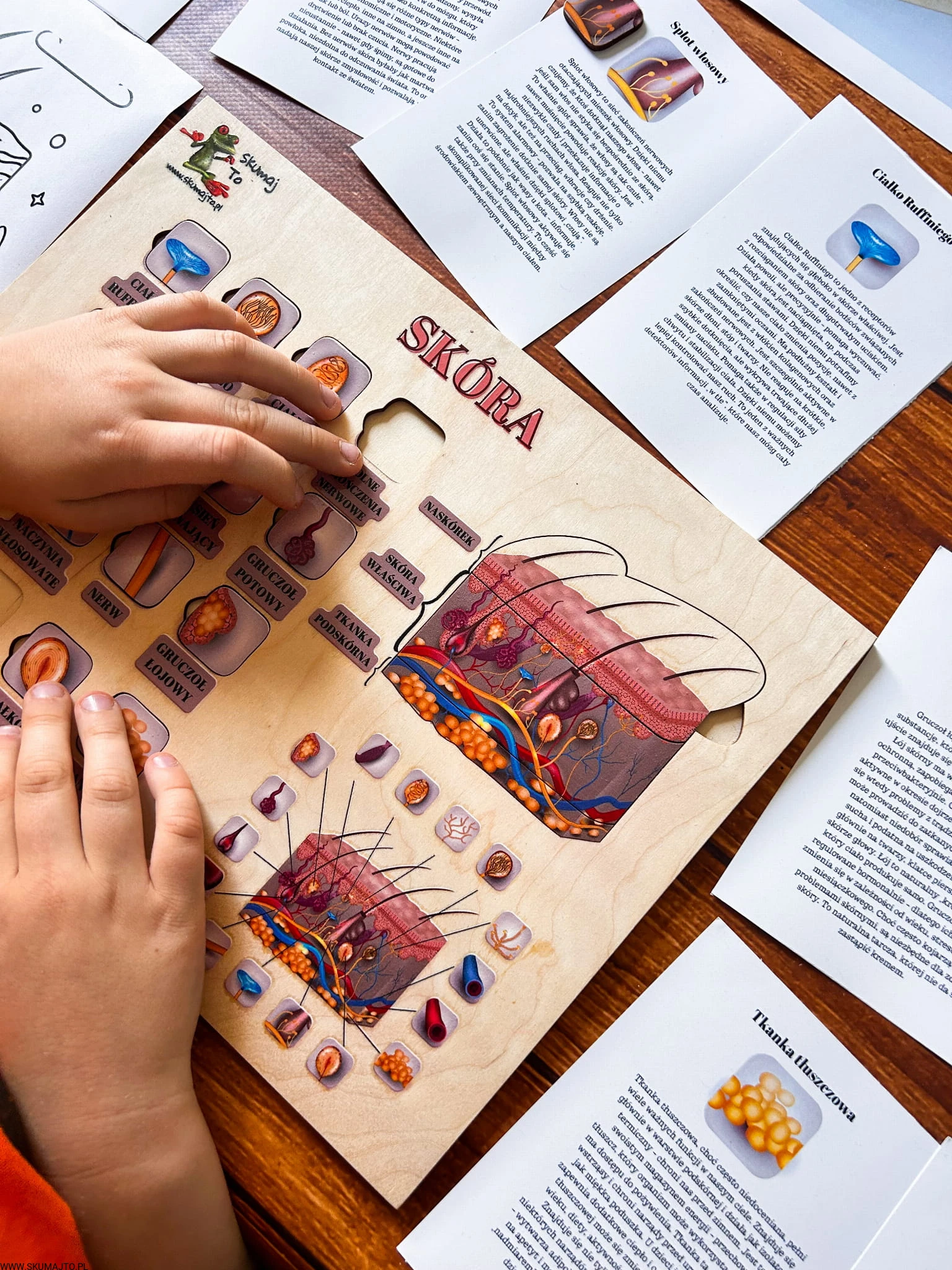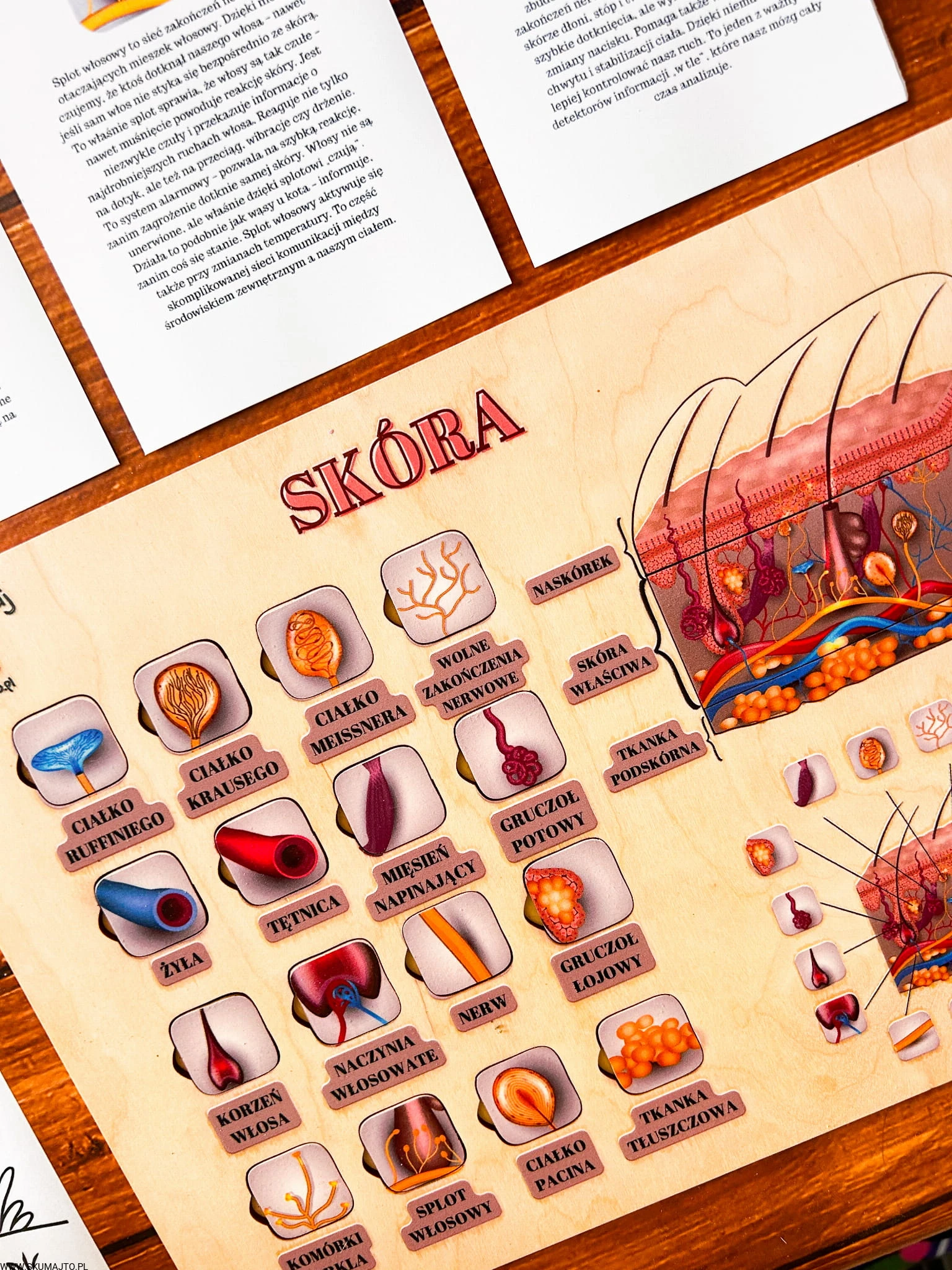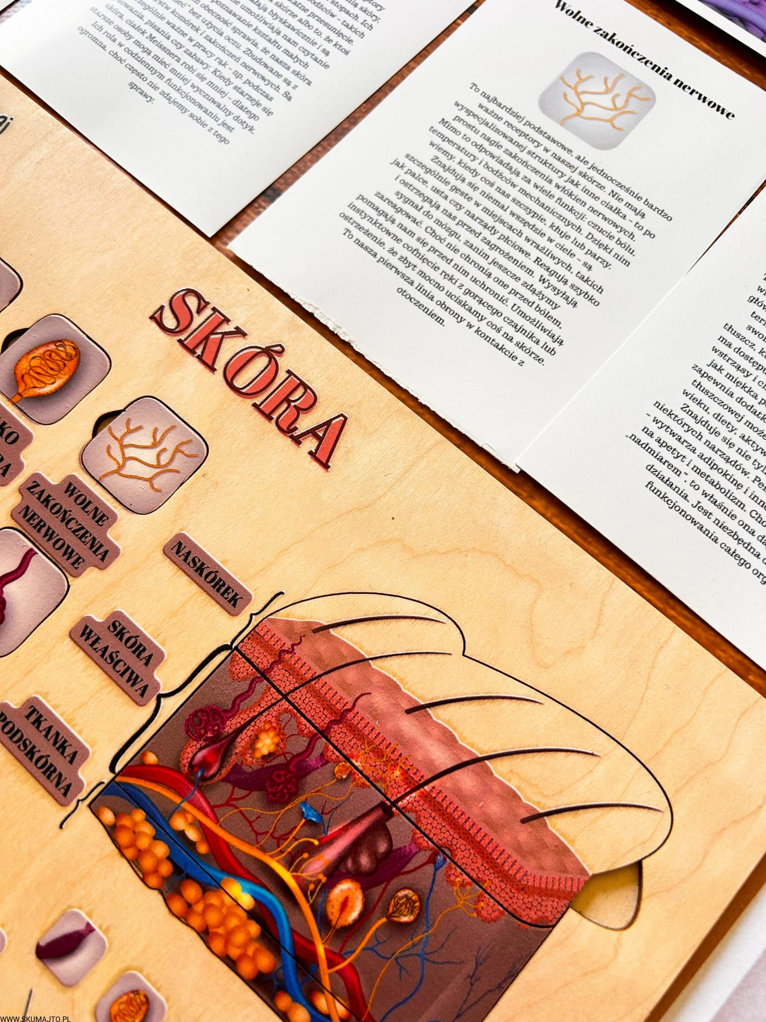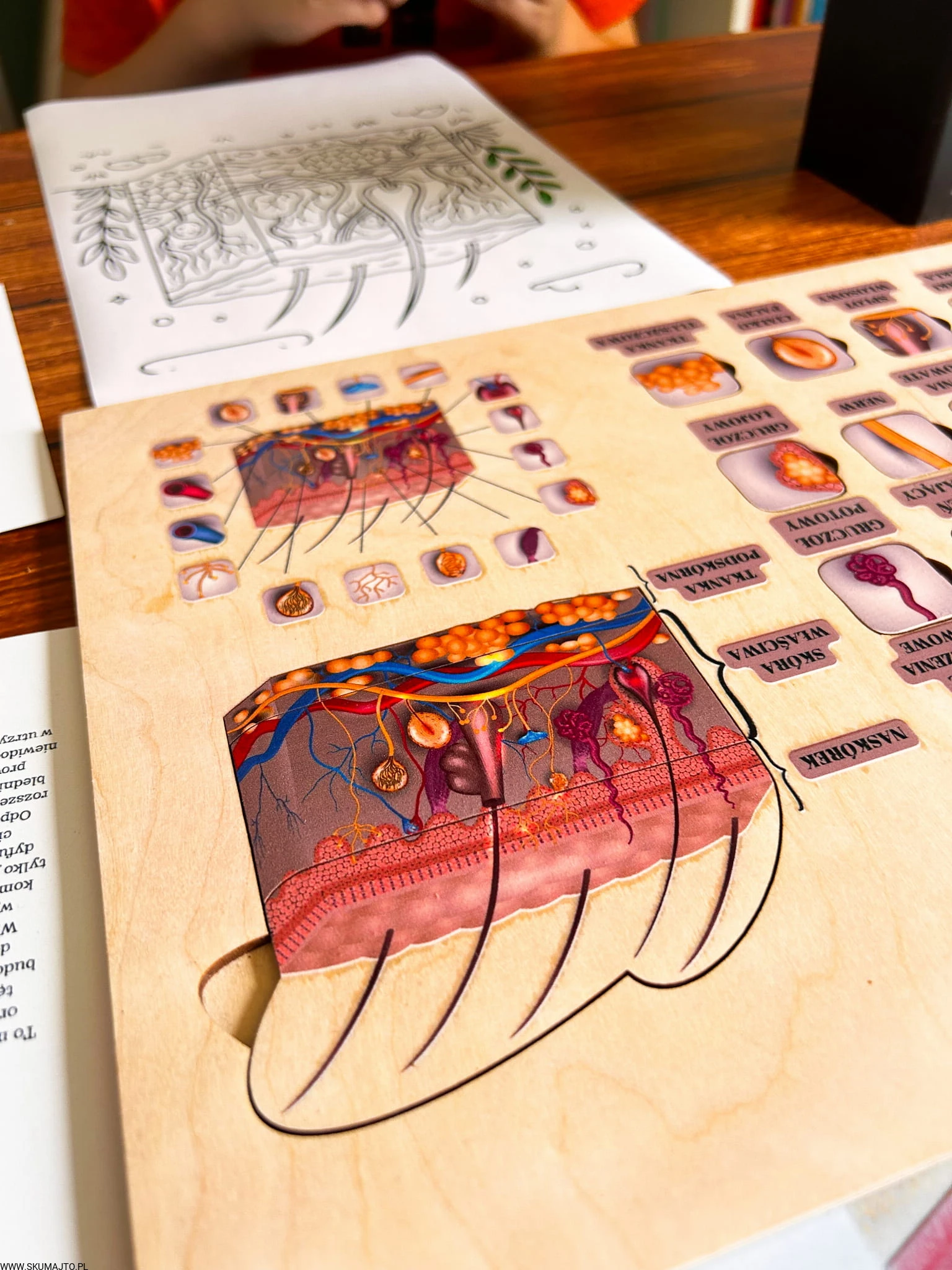 Układanka edukacyjna „Skóra” to kompletna, piękna i bogata w treść pomoc, która zmienia naukę anatomii w przygodę.