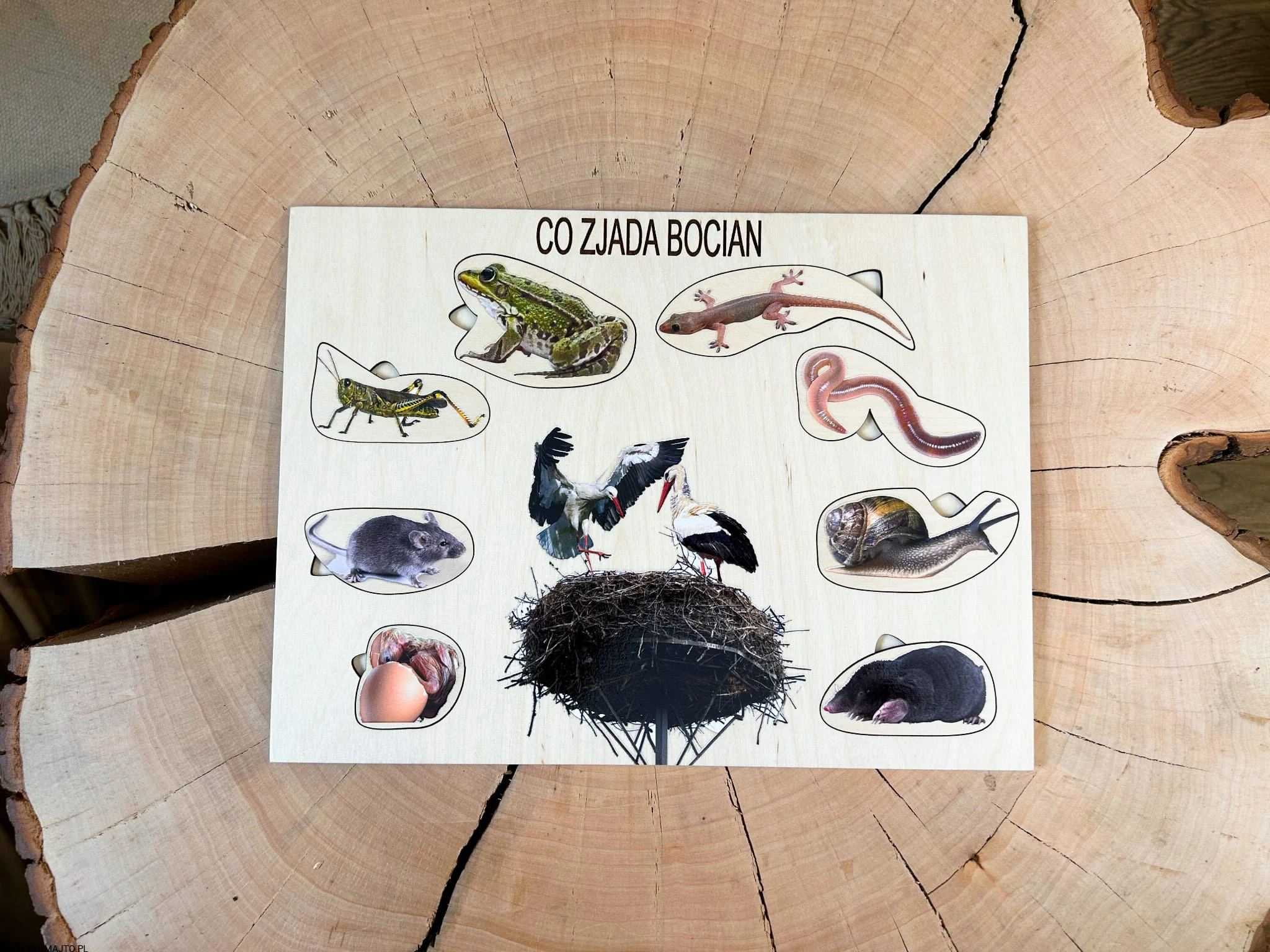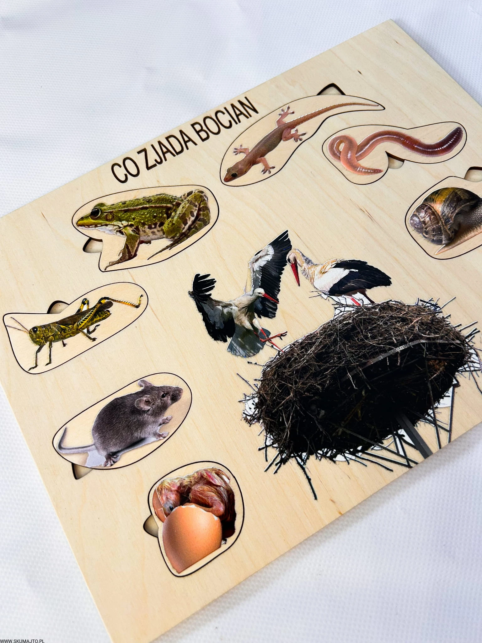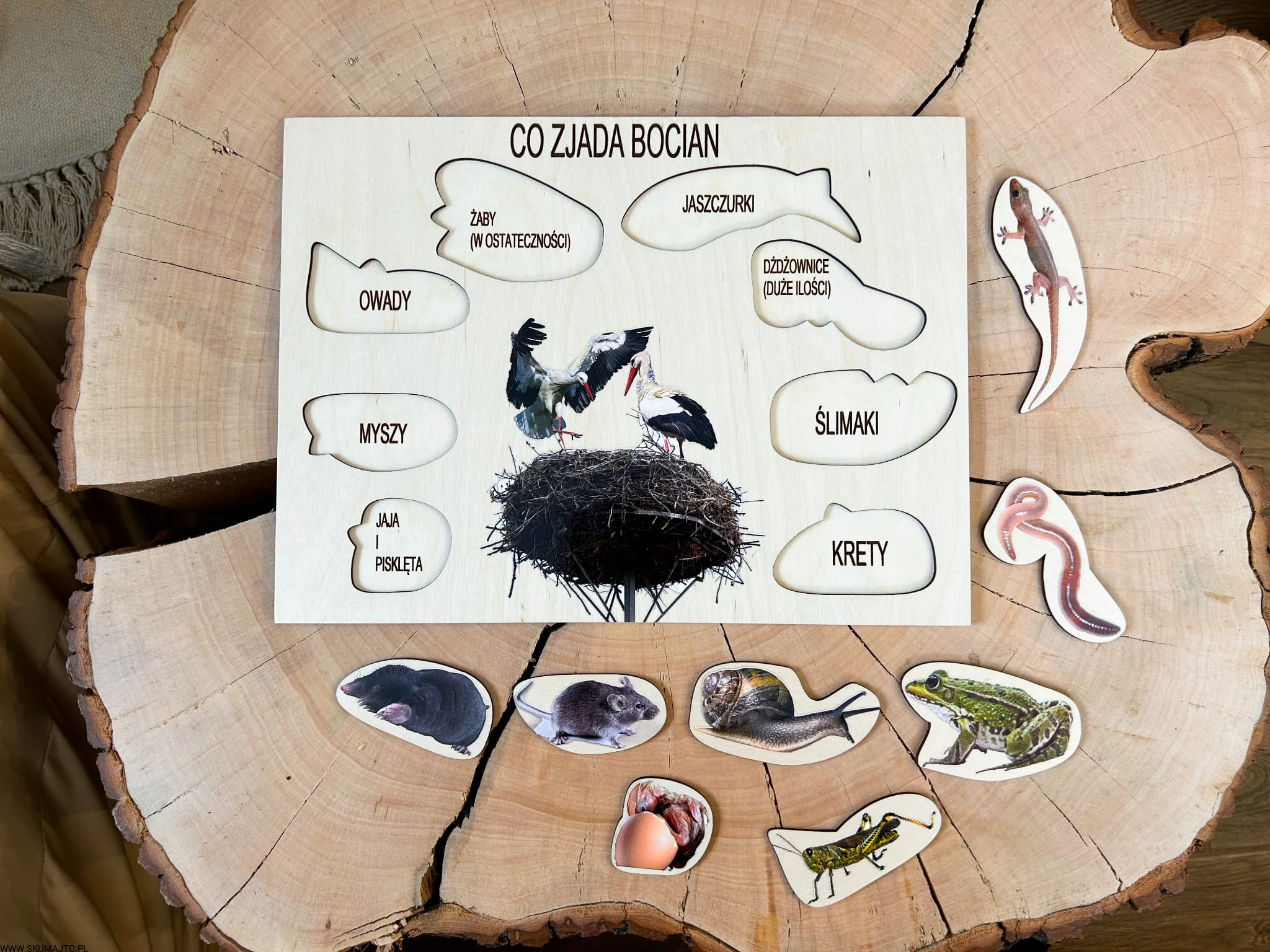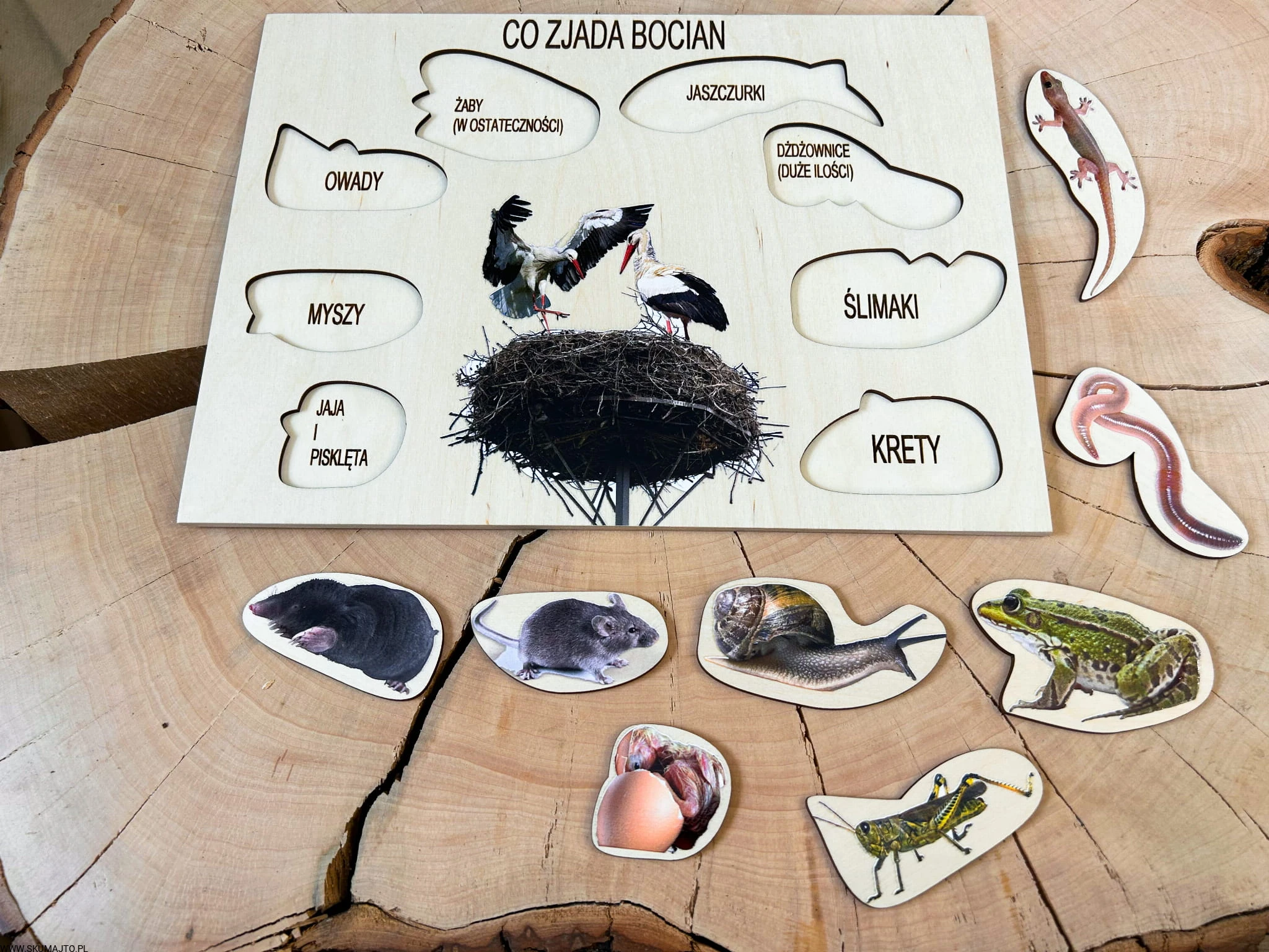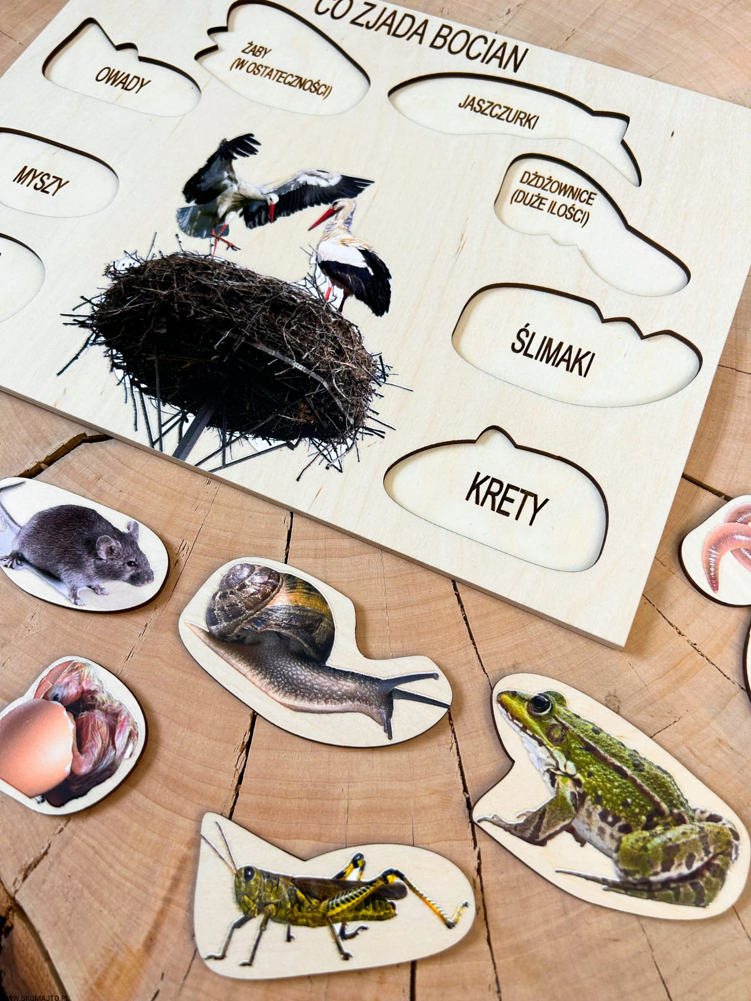 - 8 wyjmowanych elementów: Przedstawiających różne składniki diety bociana, każdy element jest podpisany.