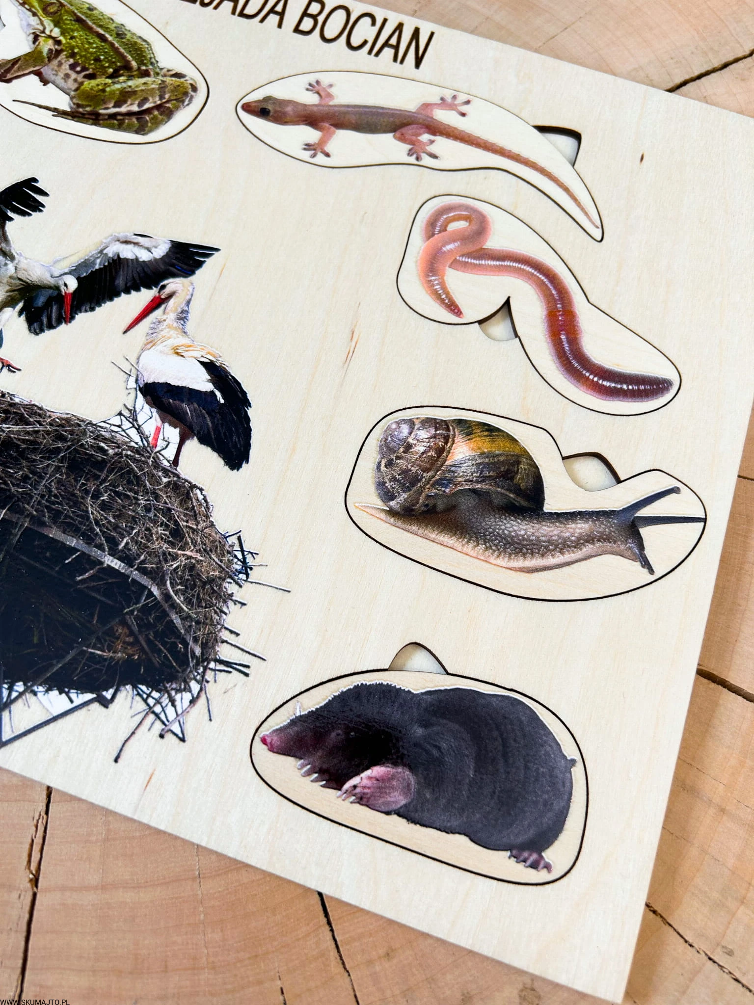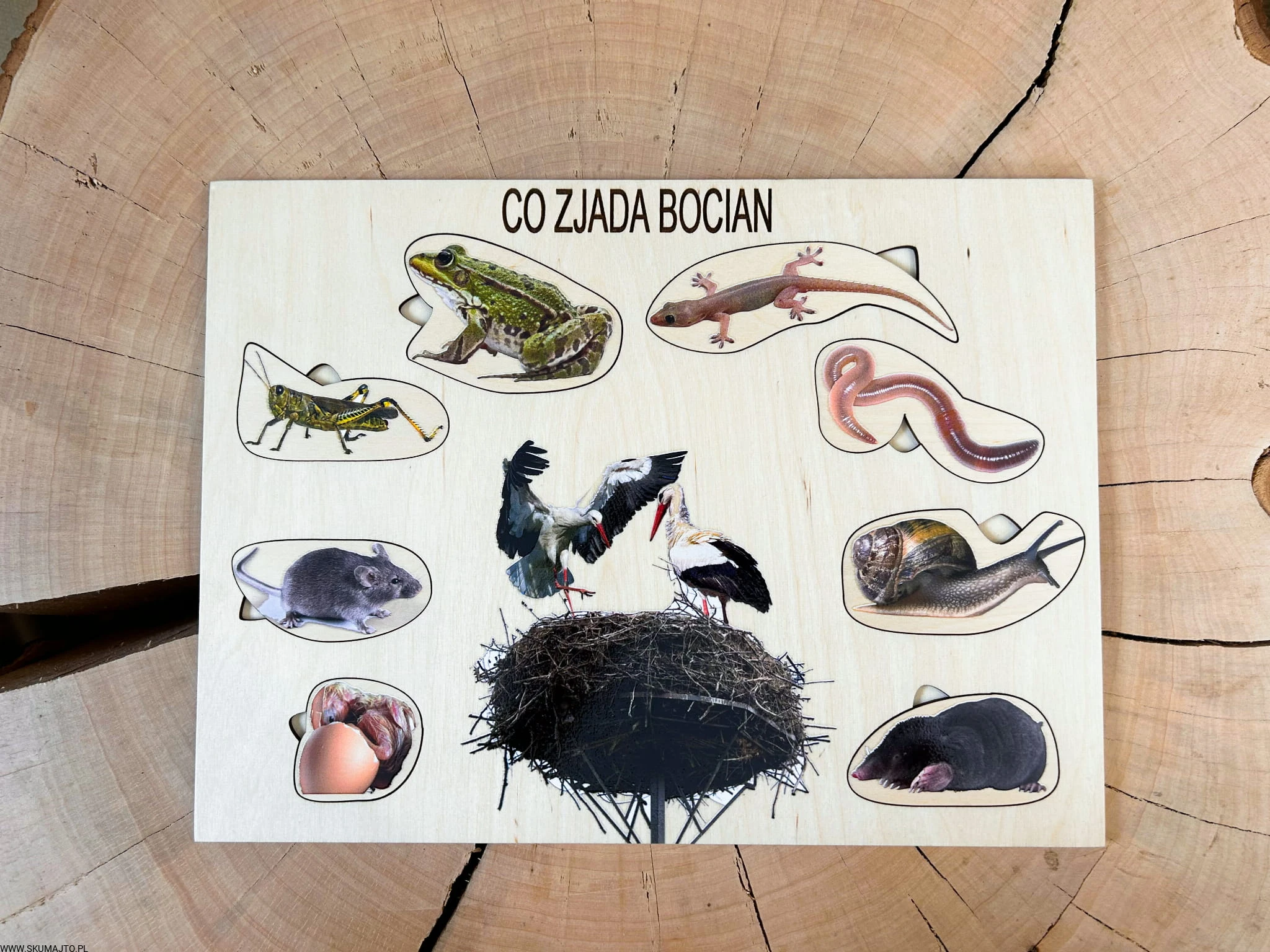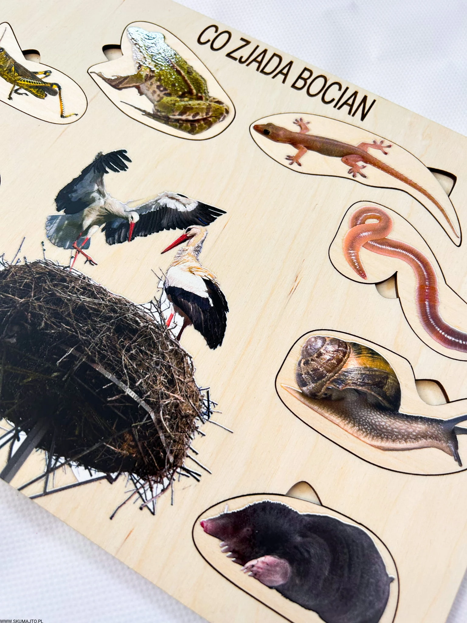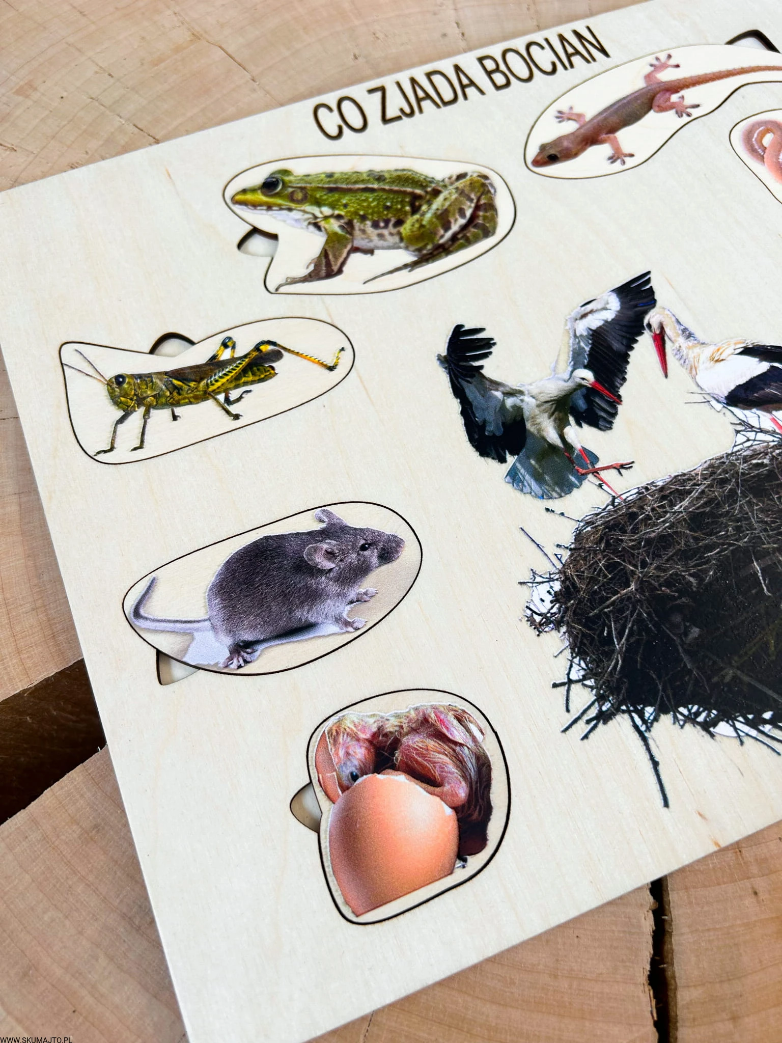 Co zjada bocian, drewniana układanka o bocianie, ciekawostki o bocianach