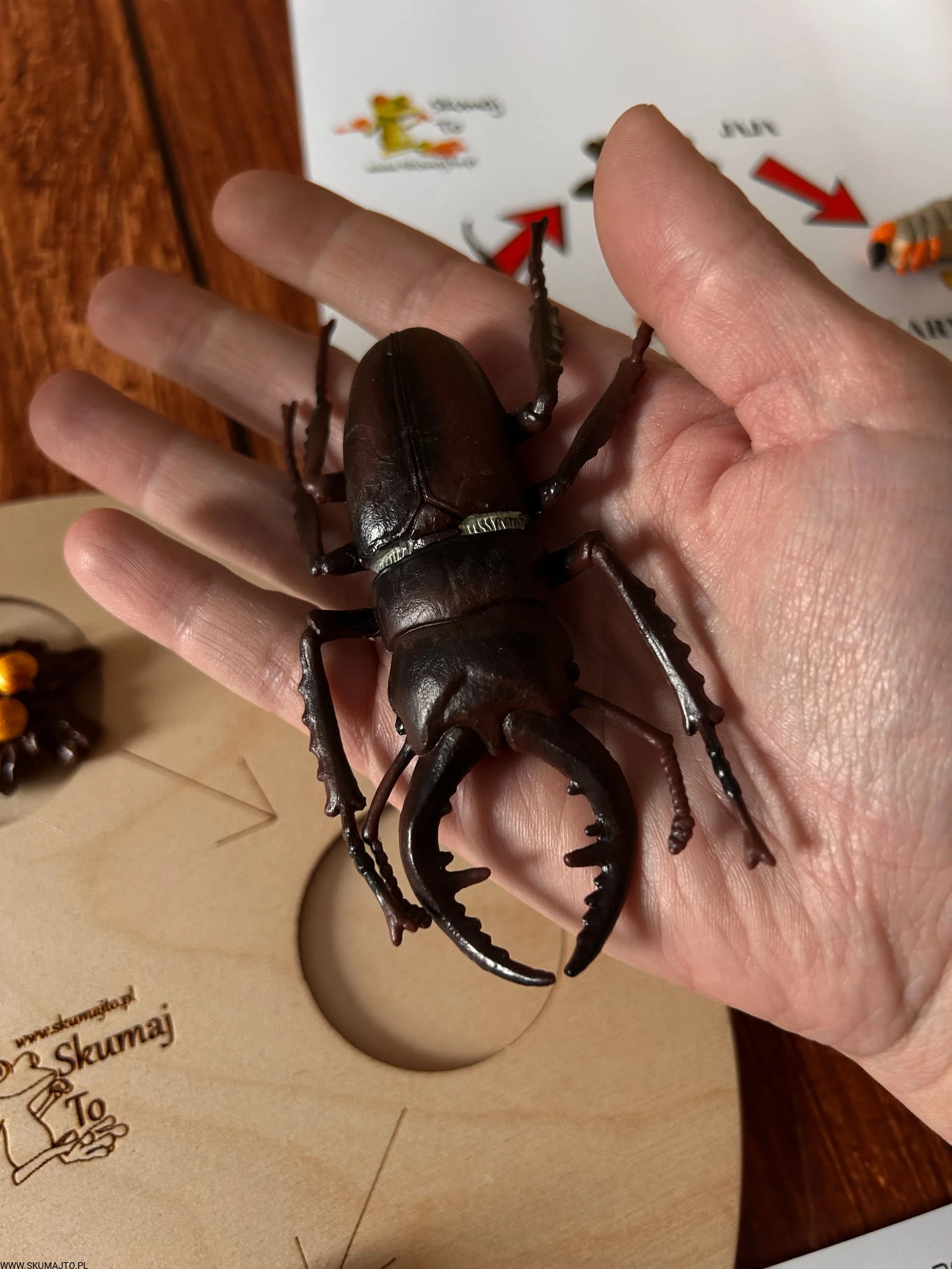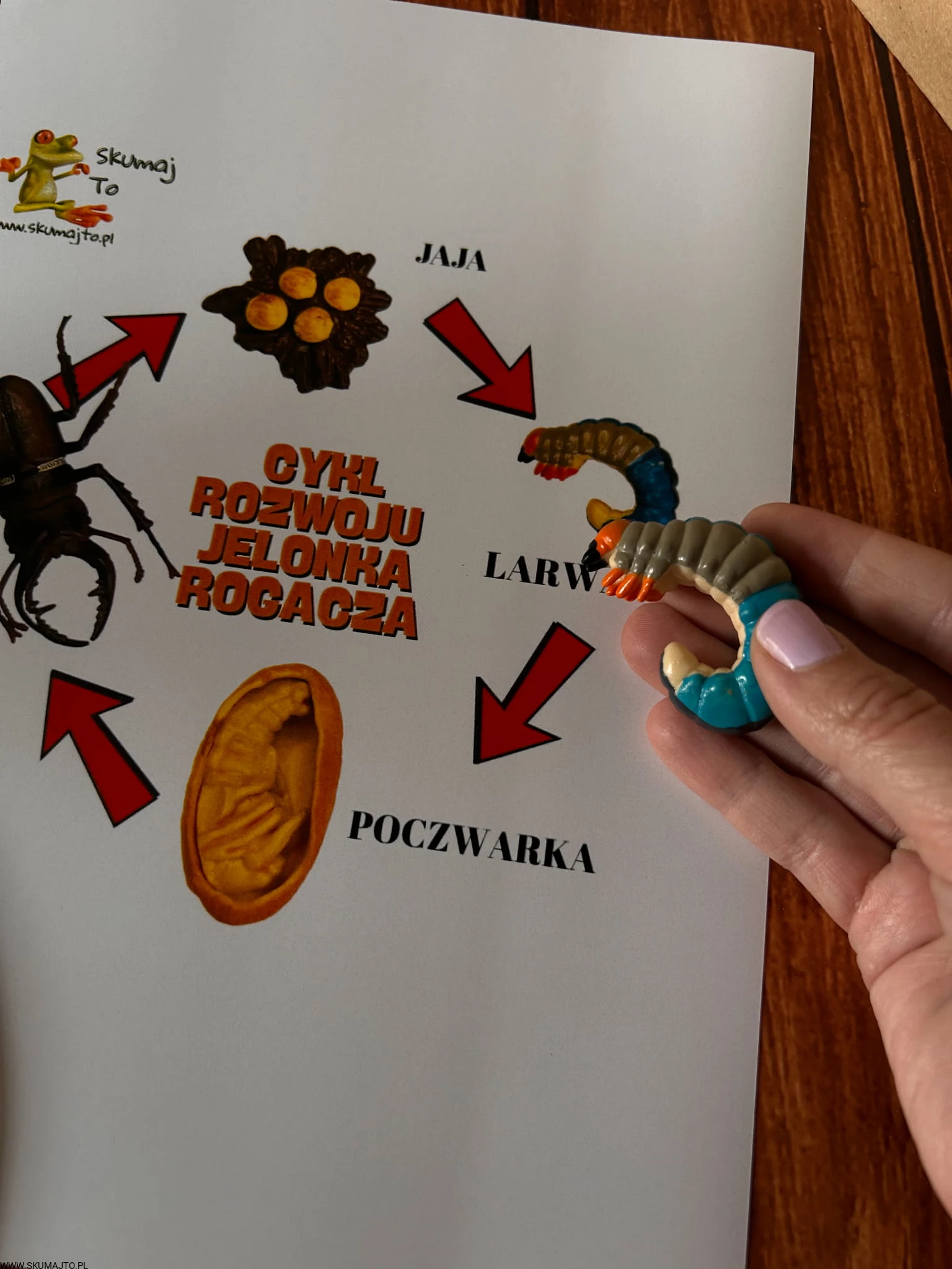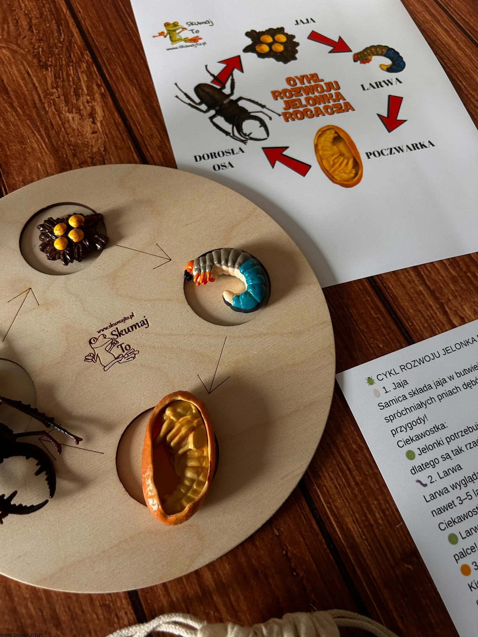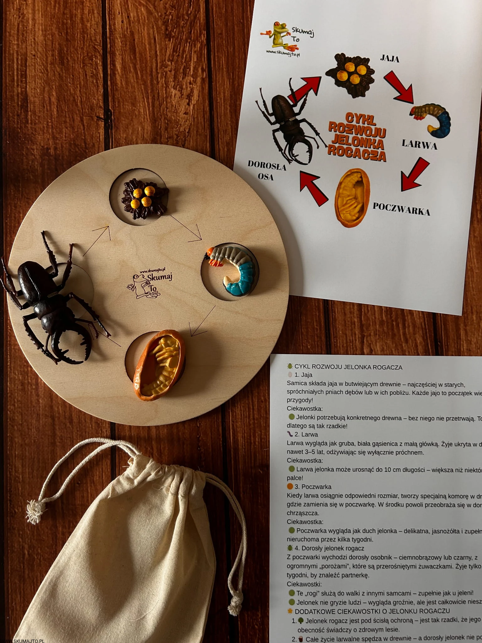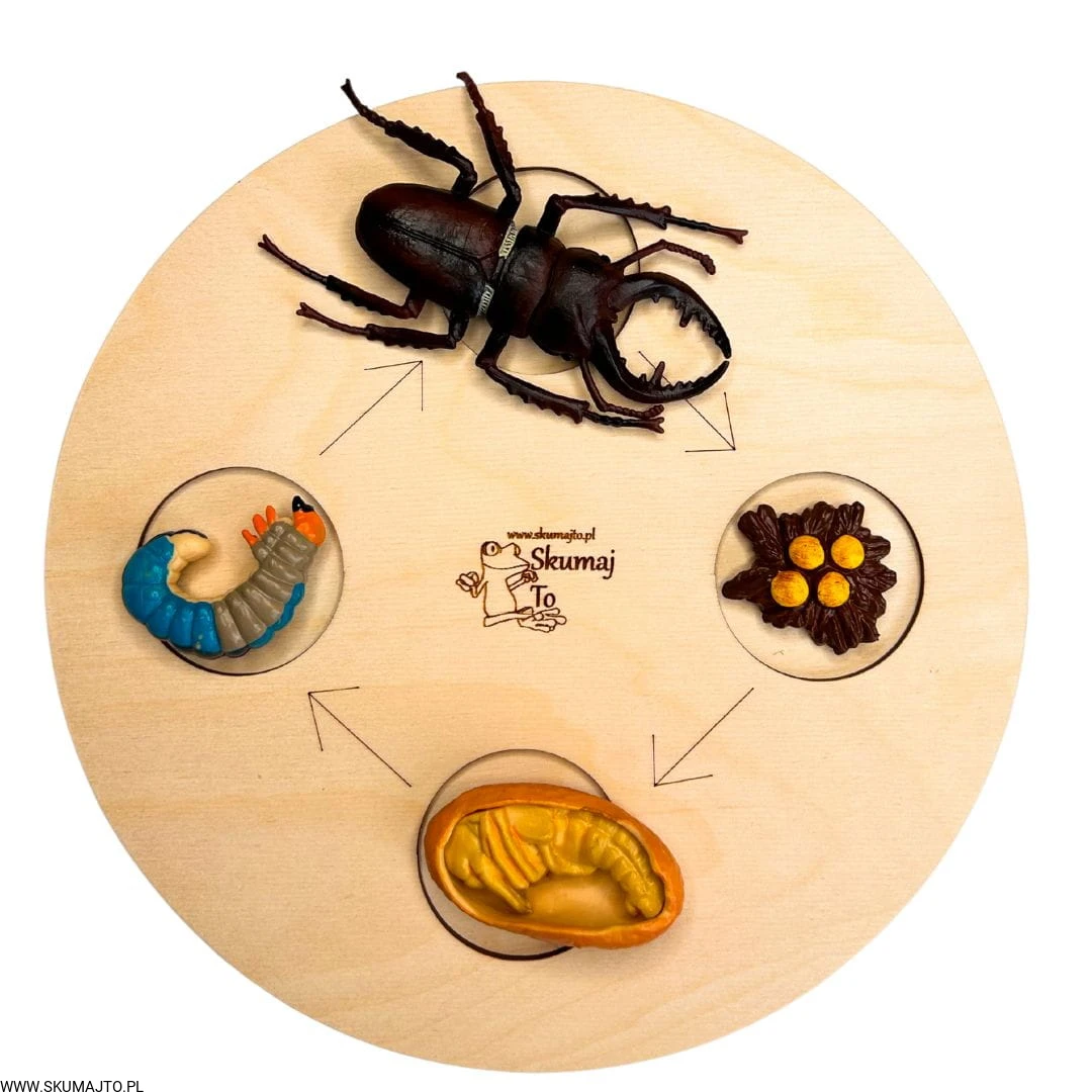 To kompletna, sensoryczna pomoc edukacyjna przedstawiająca cykl rozwoju jelonka rogacza – od jajeczka aż po dorosłego owada. Zestaw zawiera: