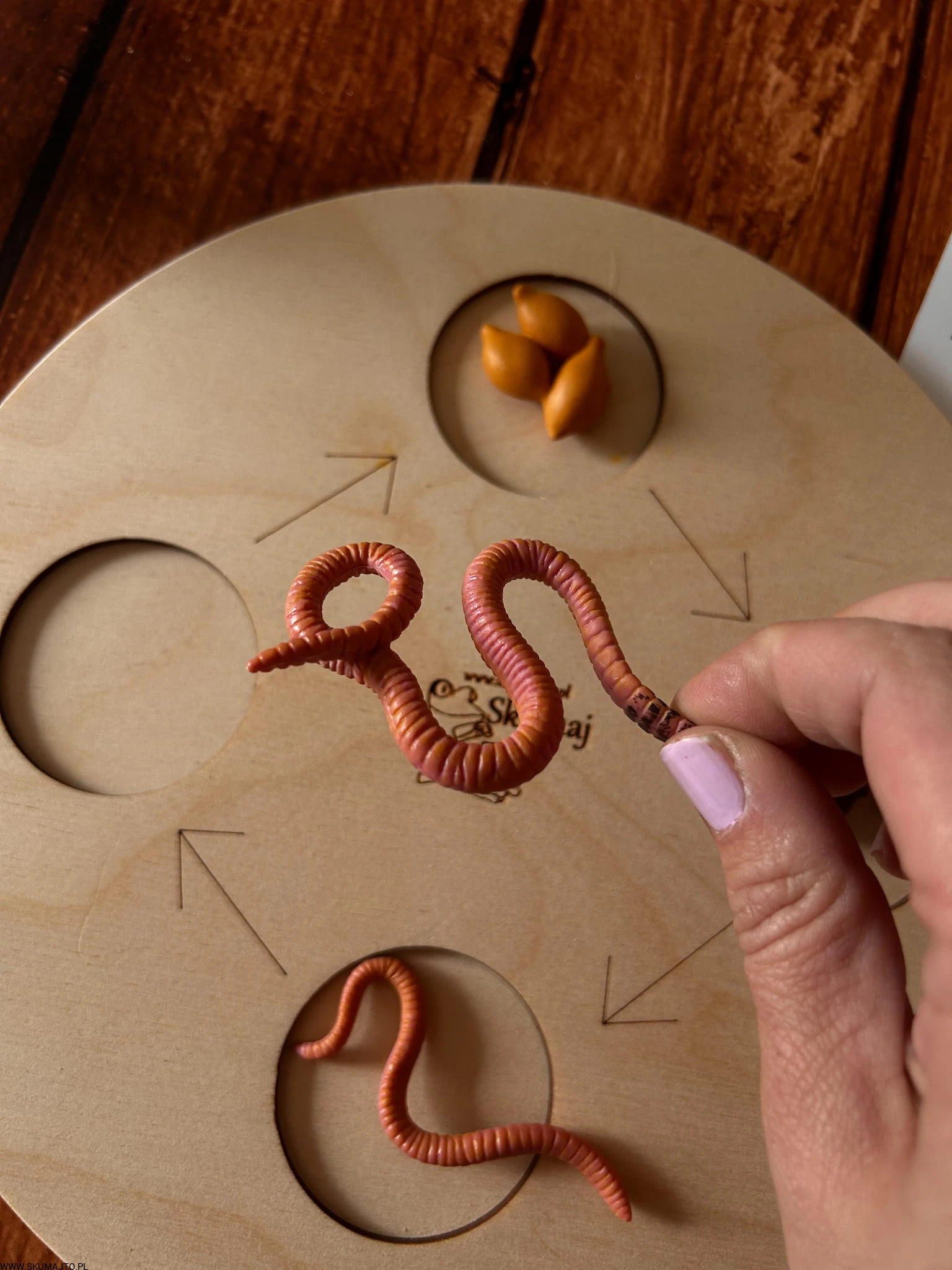 To sensoryczna pomoc edukacyjna przedstawiająca cykl rozwoju dżdżownicy – od kokonów z jajeczkami, przez młode osobniki, aż po dojrzałą formę. Dziecko może samodzielnie ułożyć każdy etap życia tego pożytecznego bezkręgowca, ucząc się przez dotyk, obserwację i zabawę.