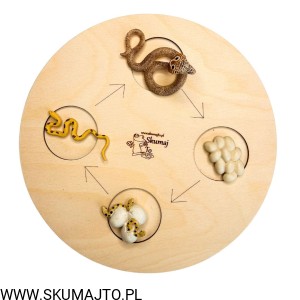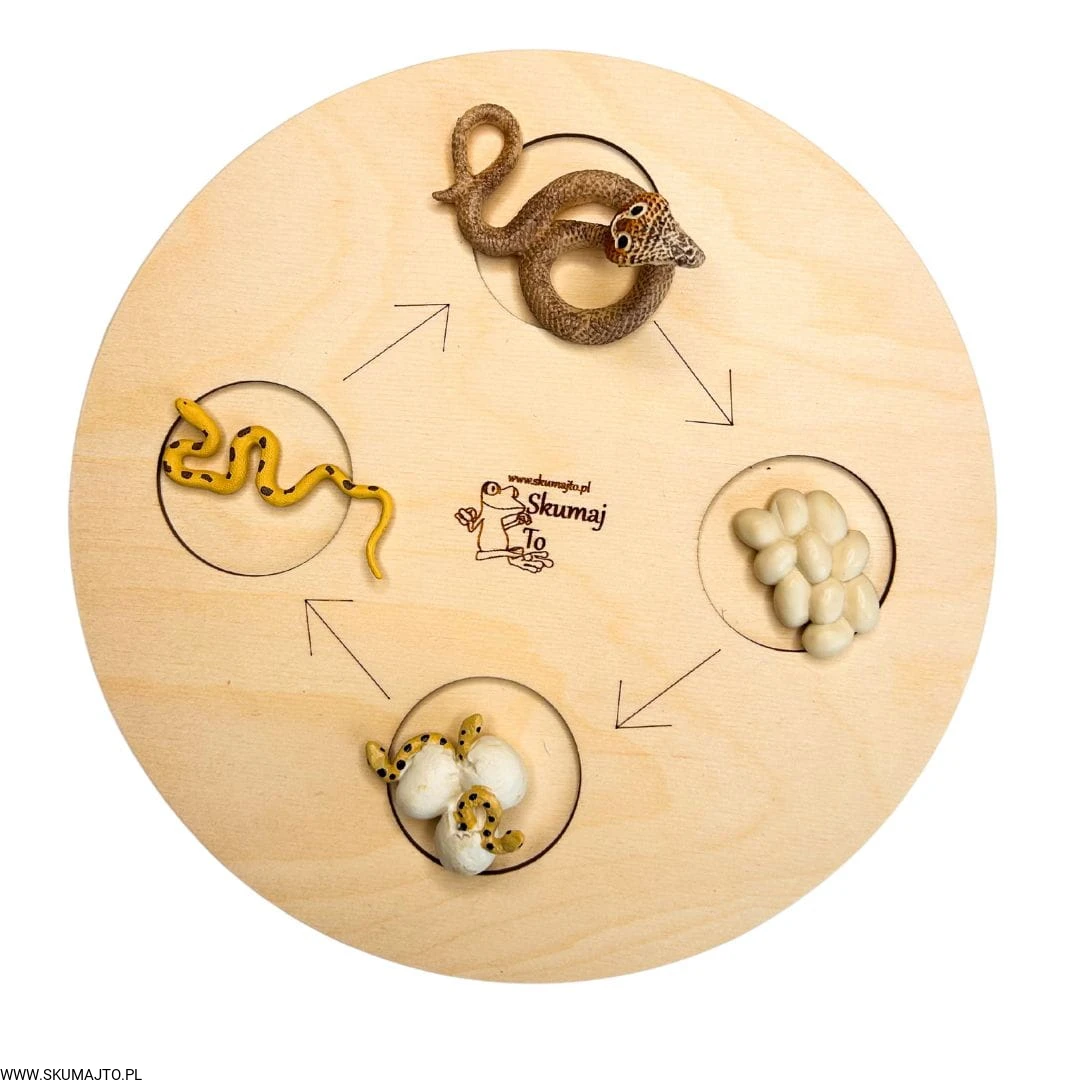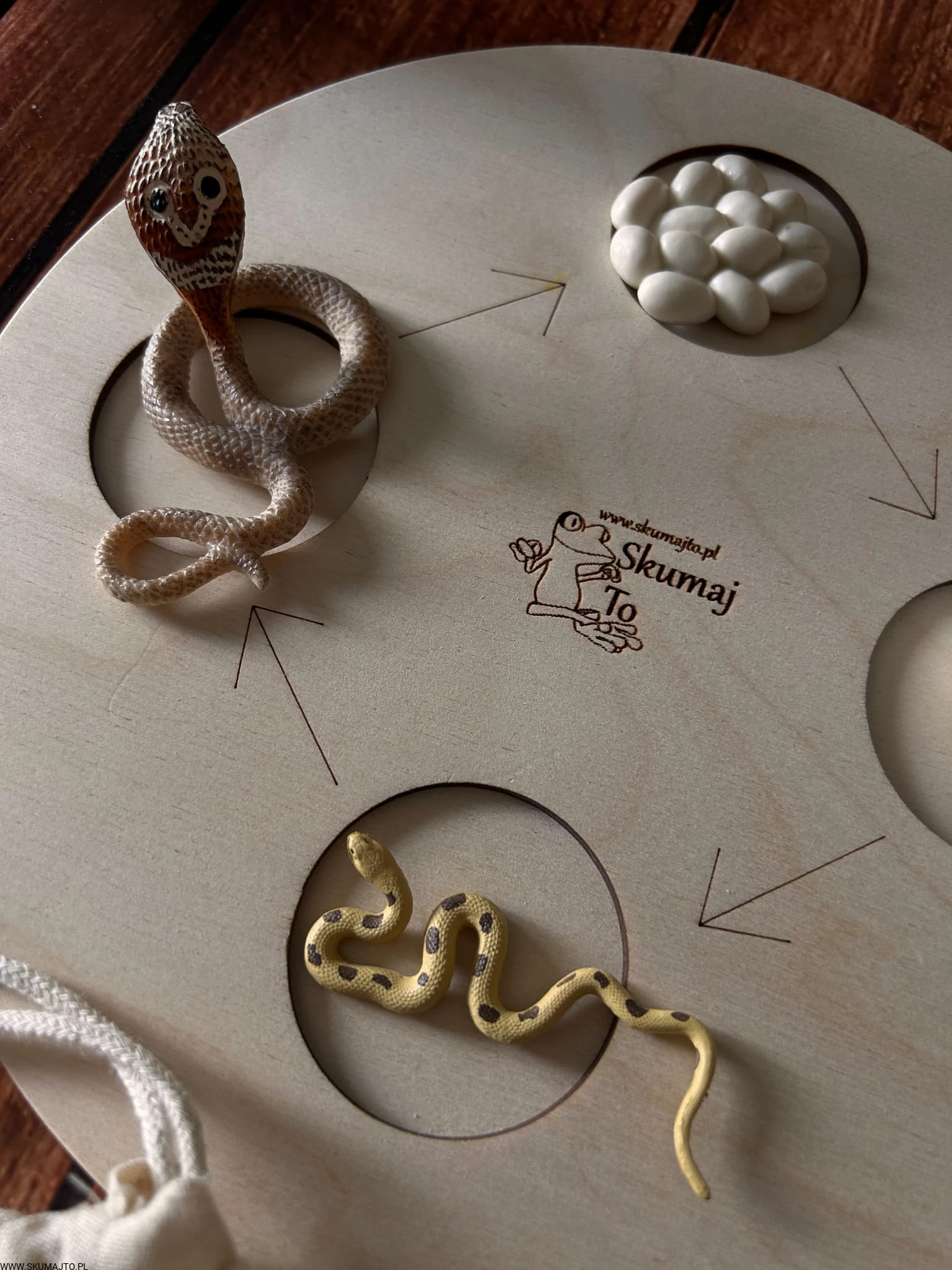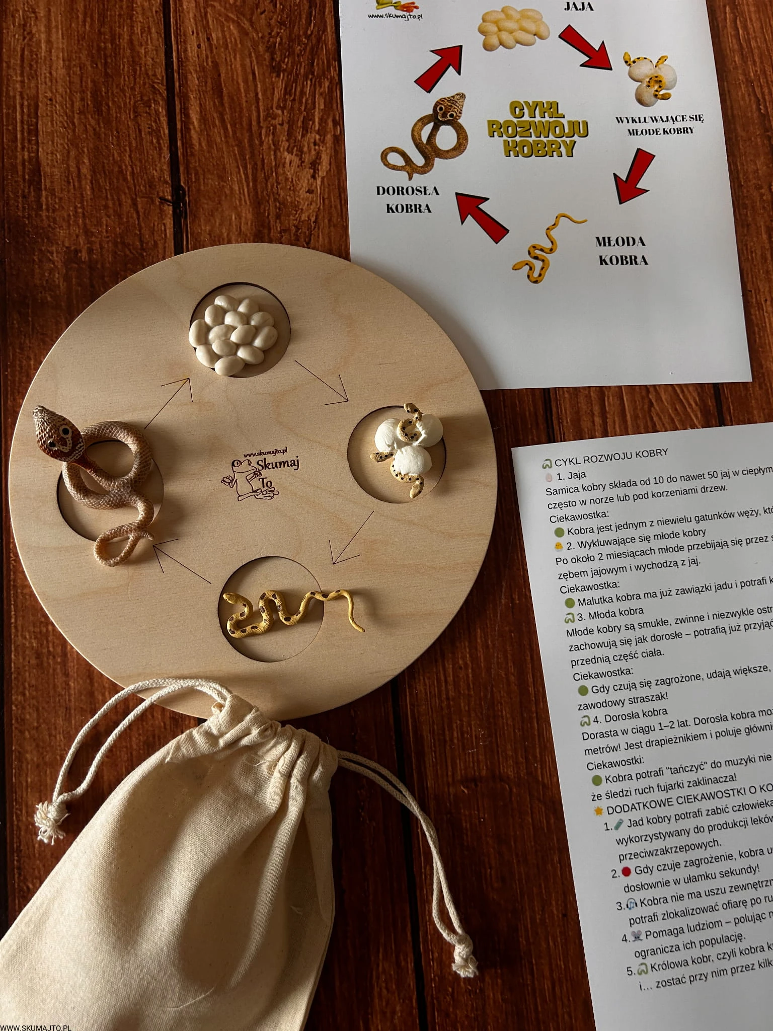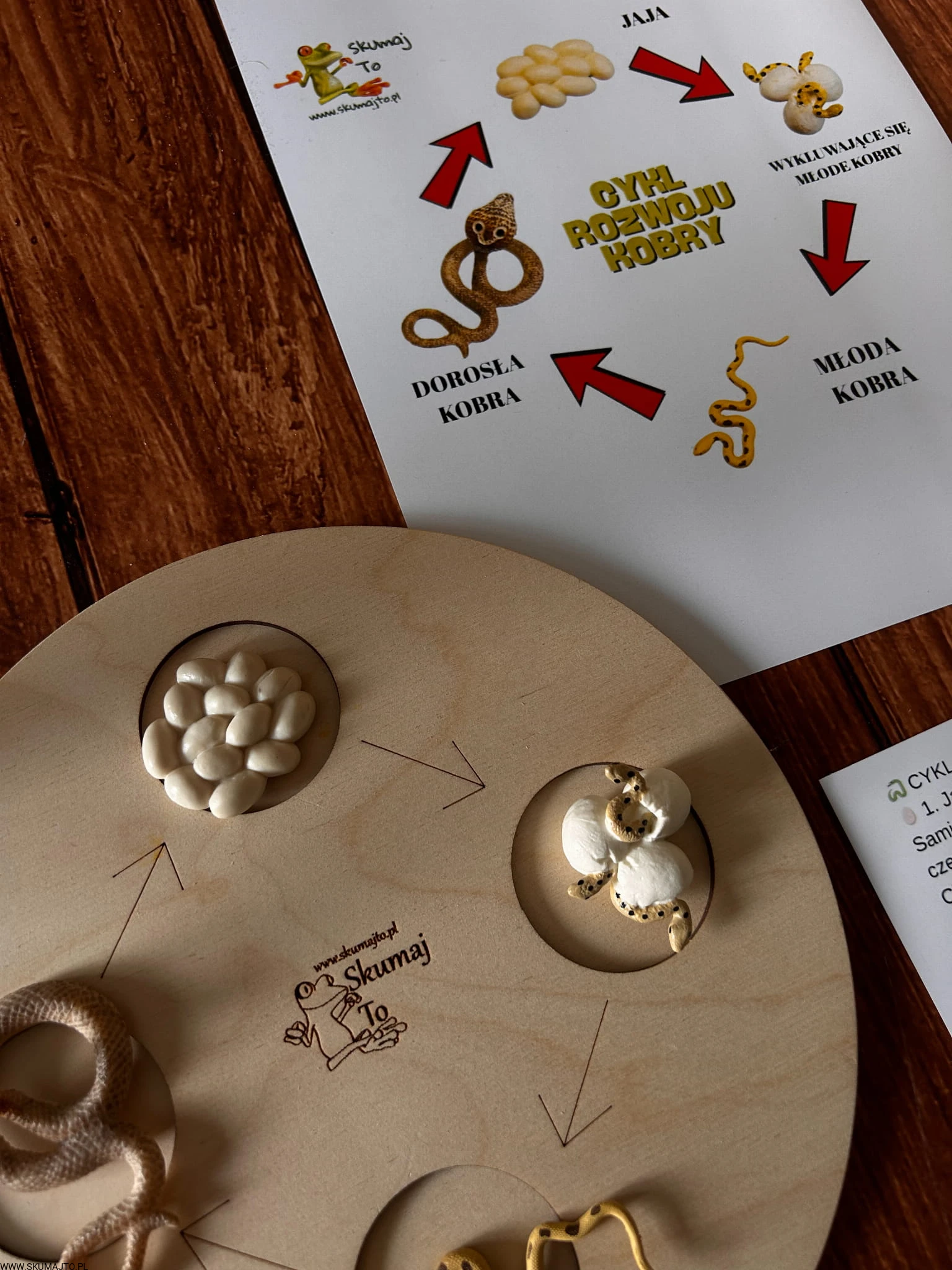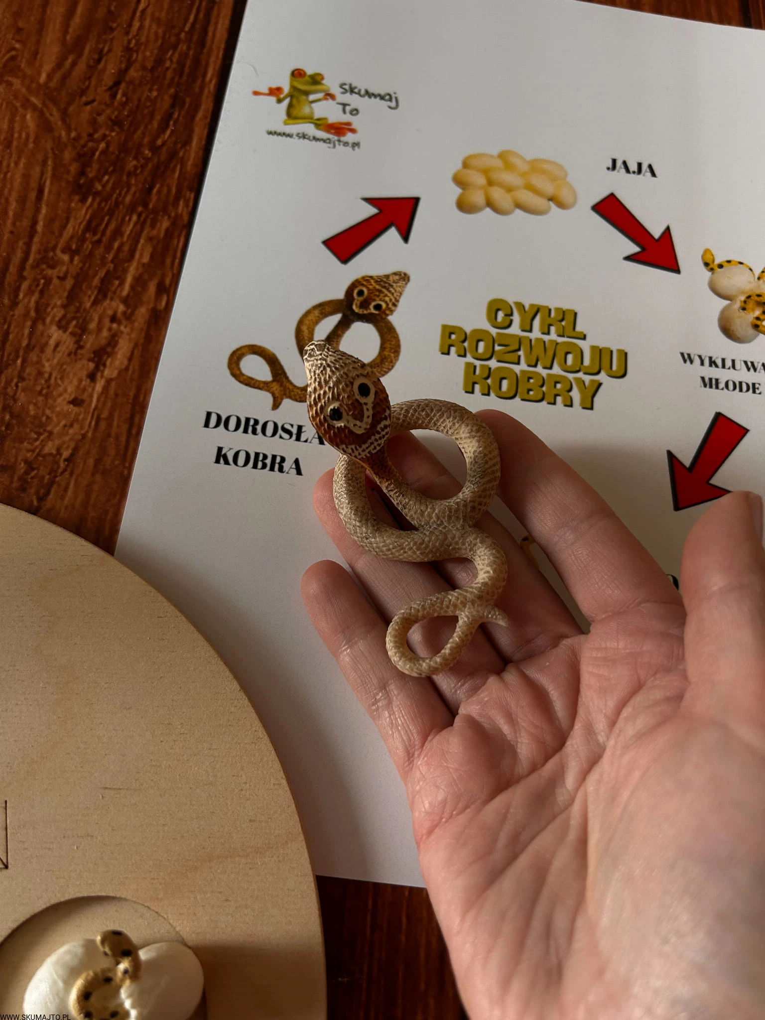 Cykl rozwoju Kobry, drewniana układanka, figurki, Montessori