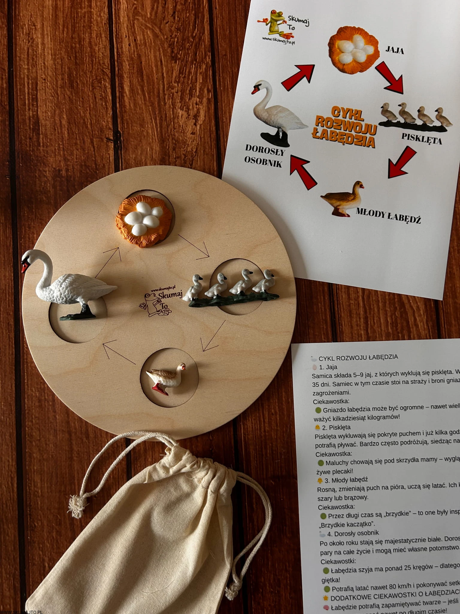 To sensoryczna pomoc edukacyjna przedstawiająca cztery etapy życia łabędzia – od jajka po dorosłego ptaka. Całość została stworzona z myślą o edukacji przez zabawę, wspierając ciekawość, koncentrację i rozwój dziecka.