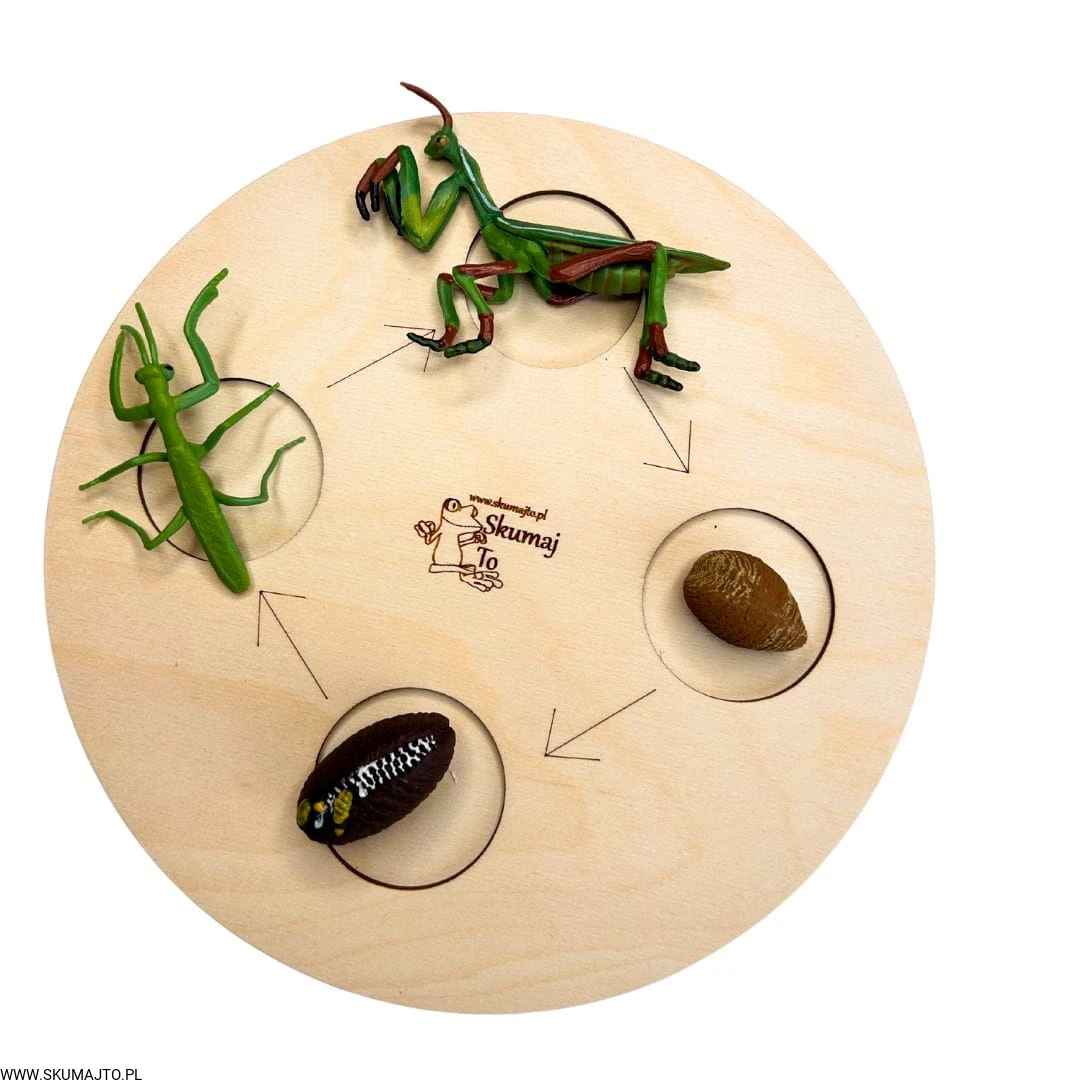 To drewniana pomoc edukacyjna, która krok po kroku przedstawia cztery etapy rozwoju modliszki – od jaja, przez nimfę i larwę, aż po dorosłego owada. Dzięki realistycznym figurkom dziecko może samodzielnie układać cykl życia, ucząc się przez obserwację i zabawę.