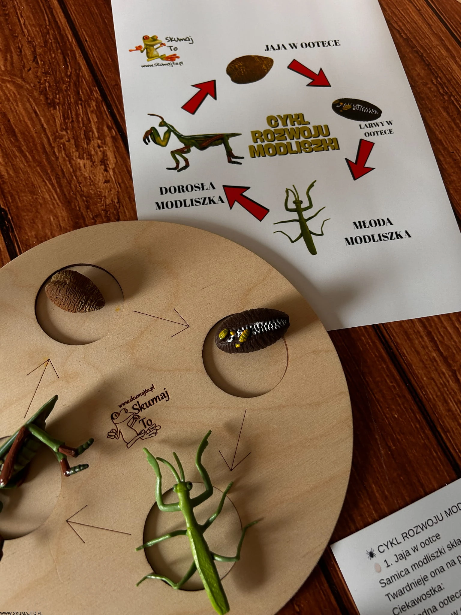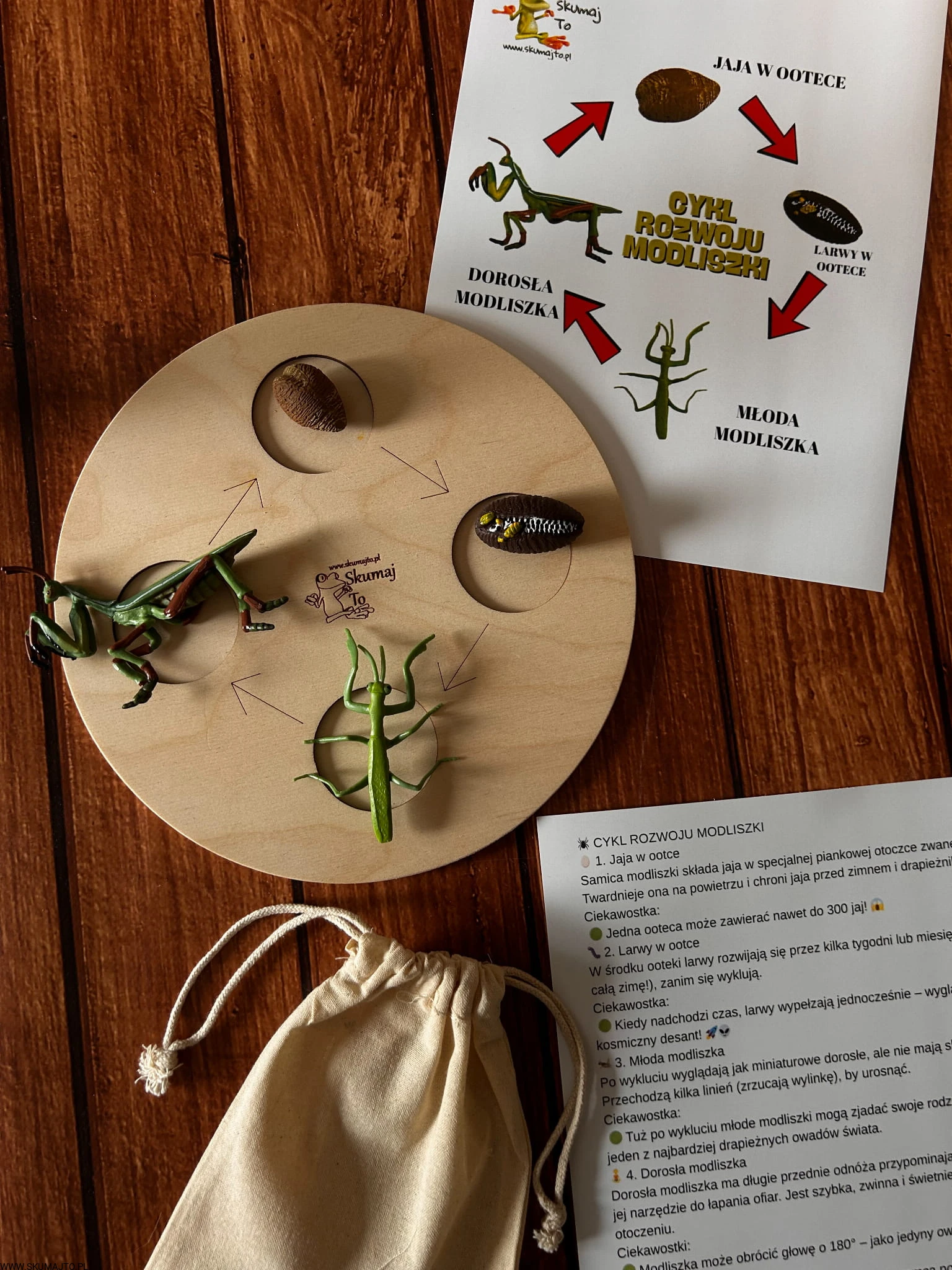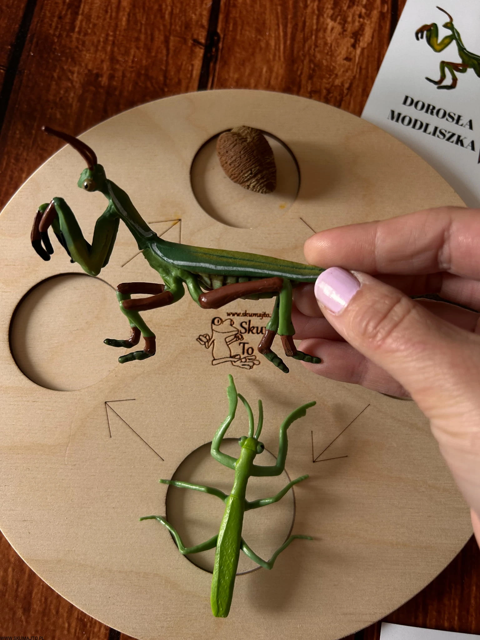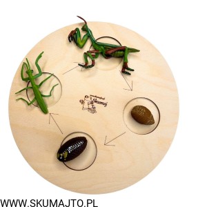 Cykl rozwoju Modliszki, drewniana układanka, figurki, Montessori