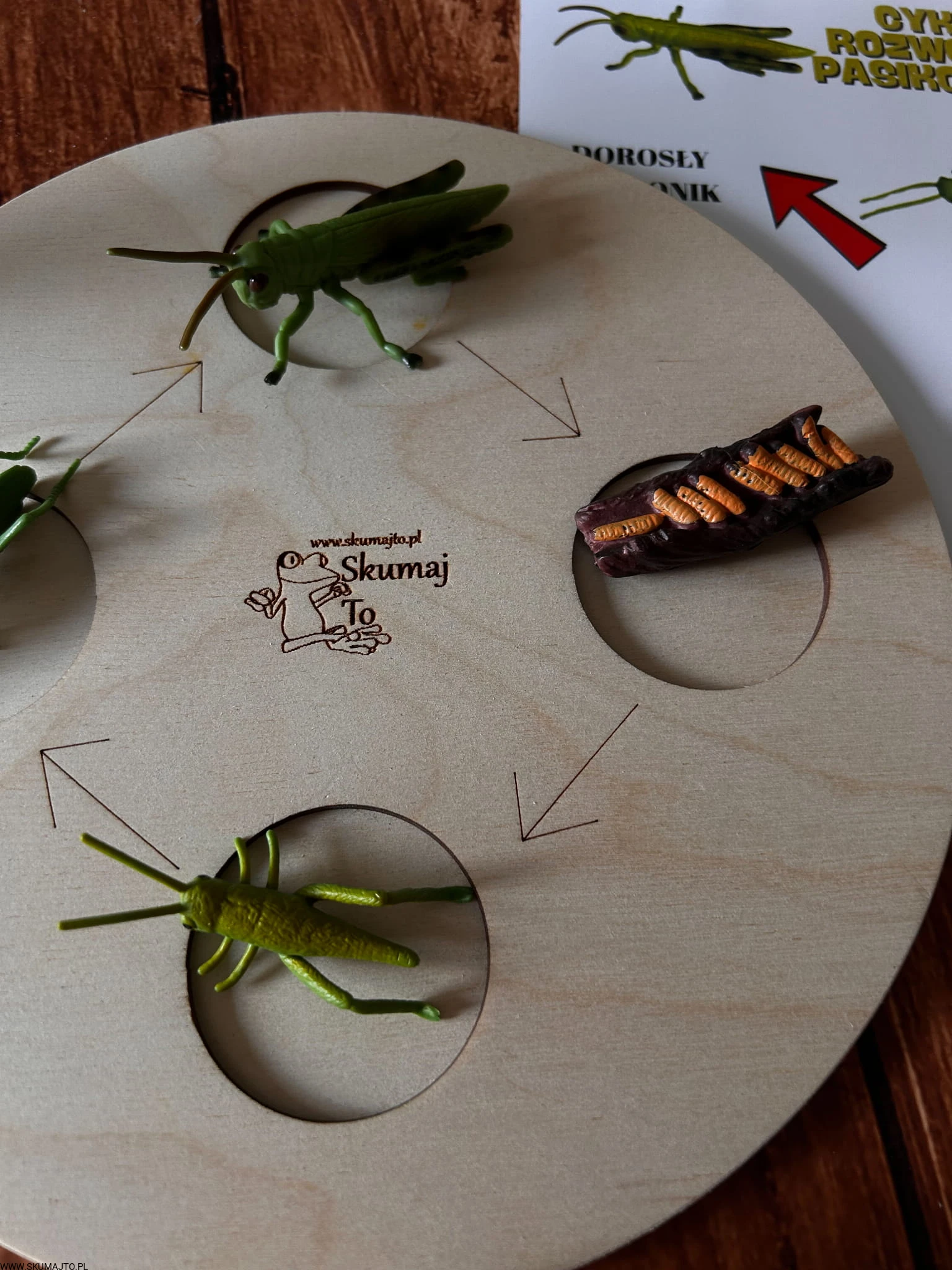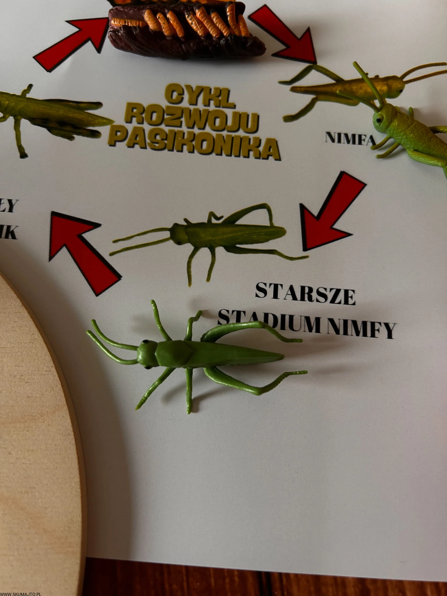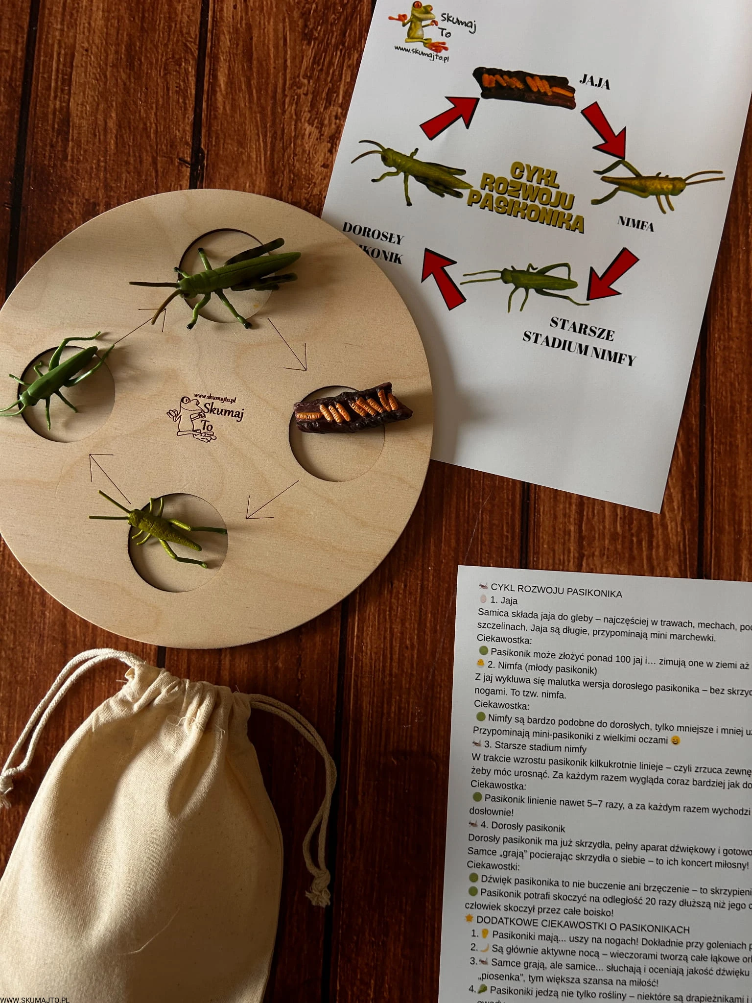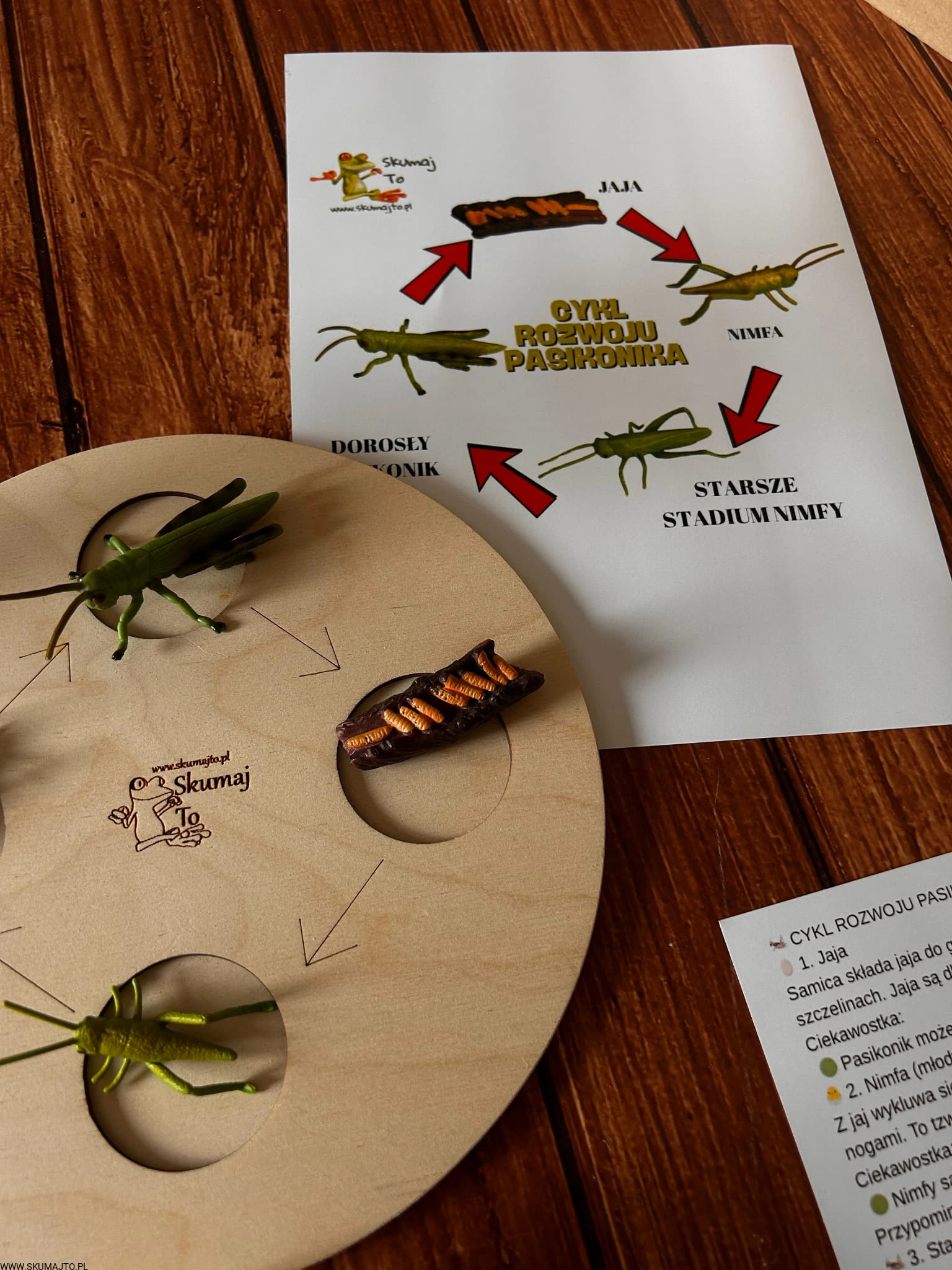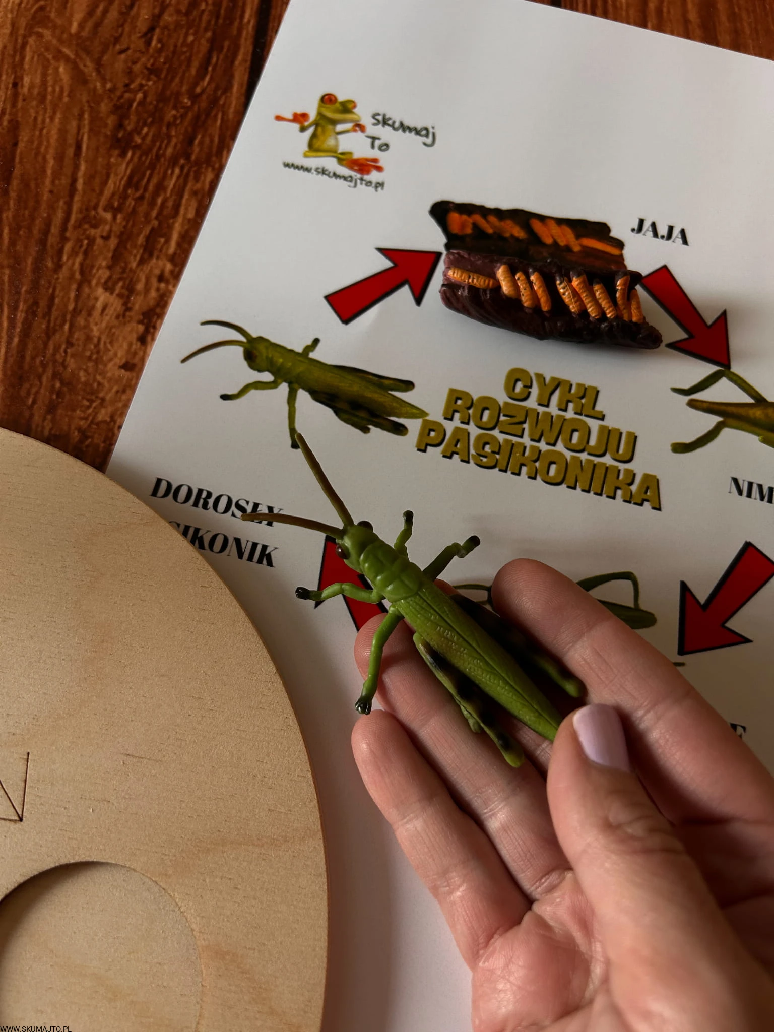 To sensoryczna pomoc edukacyjna, która w obrazowy i angażujący sposób przedstawia etapy rozwoju pasikonika: