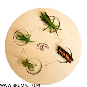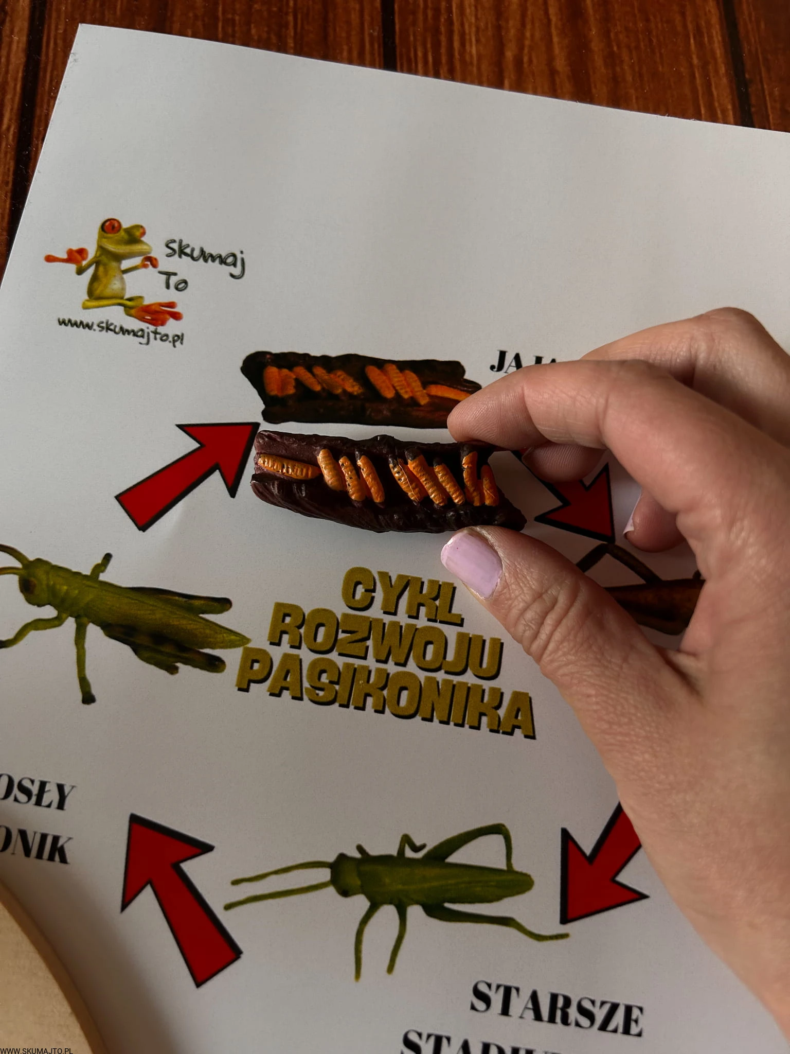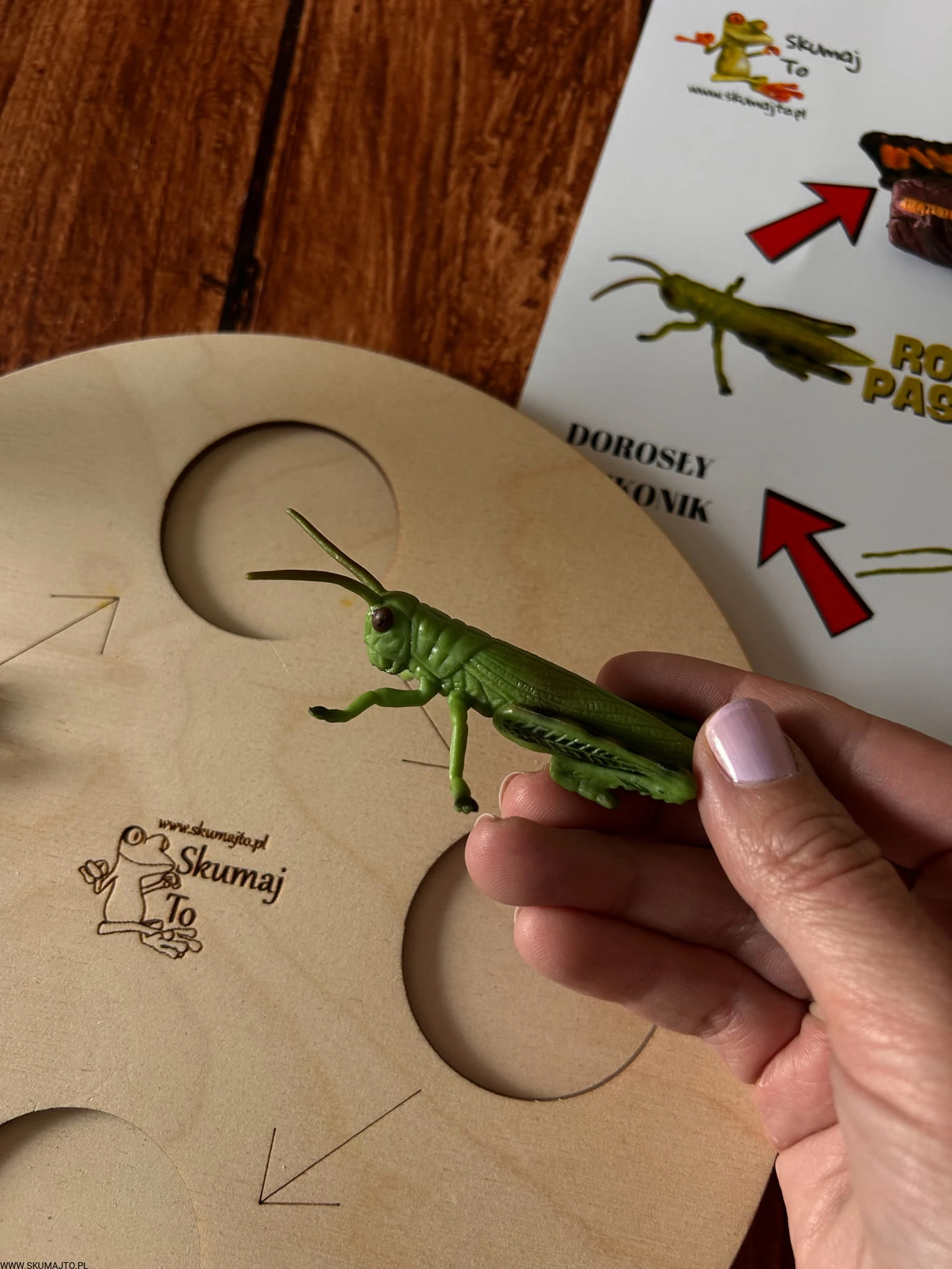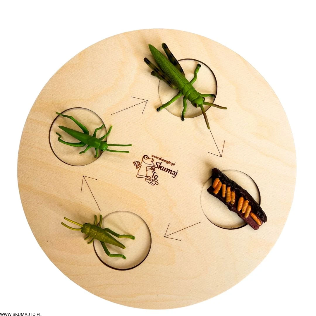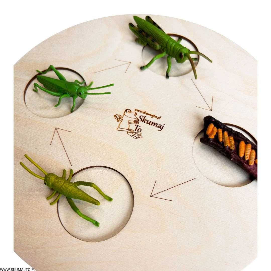 To sensoryczna pomoc edukacyjna, która w obrazowy i angażujący sposób przedstawia etapy rozwoju pasikonika: