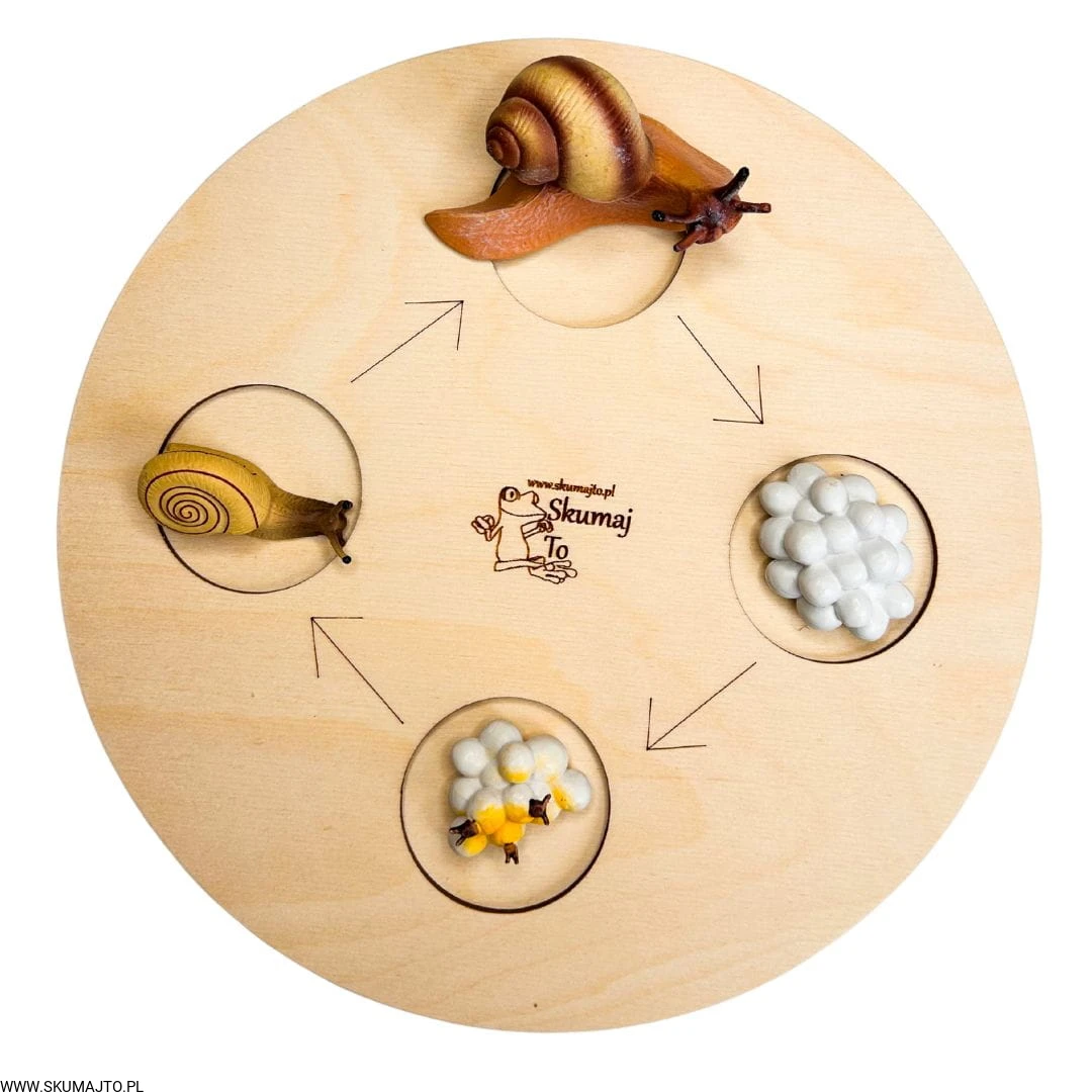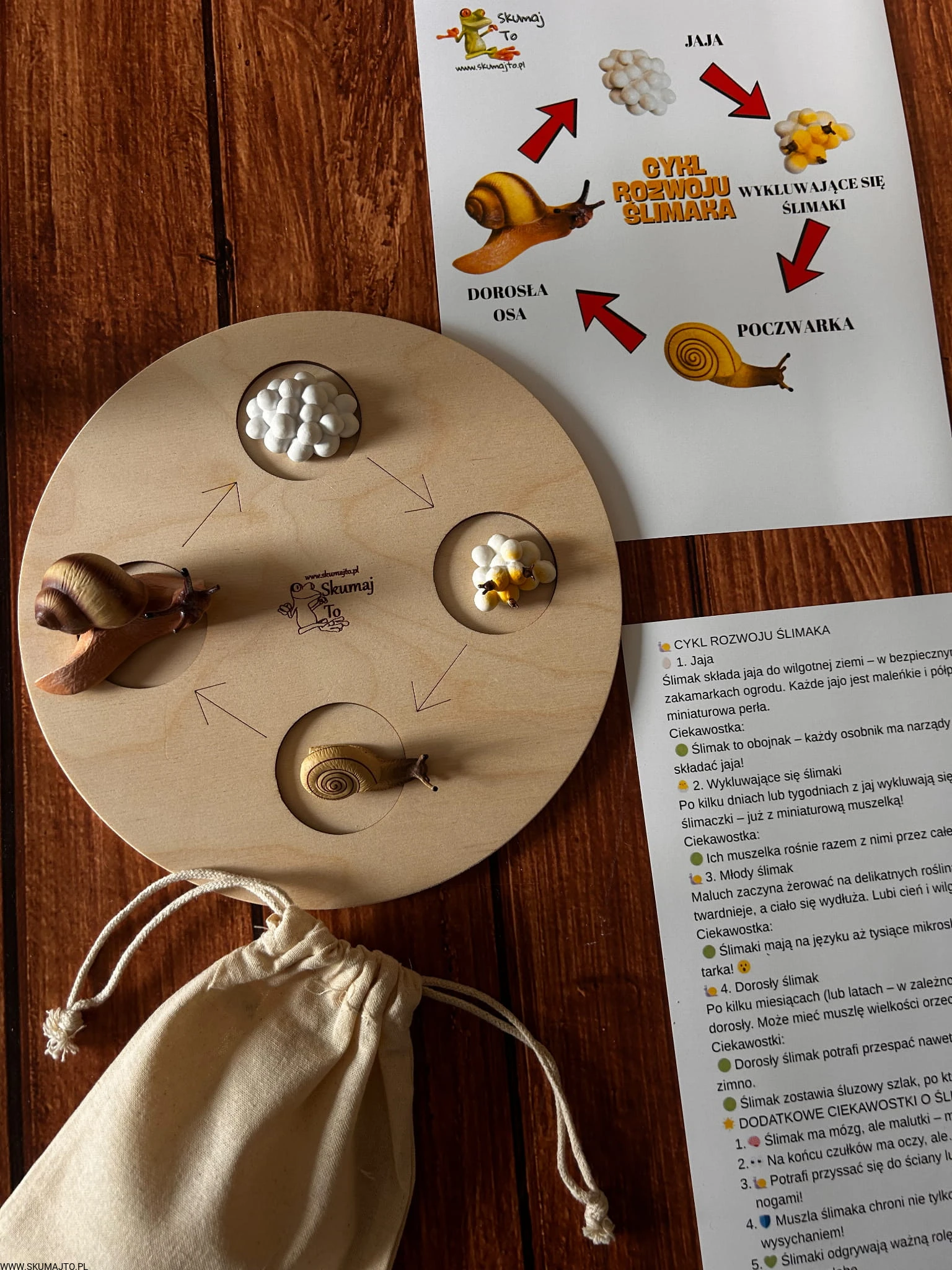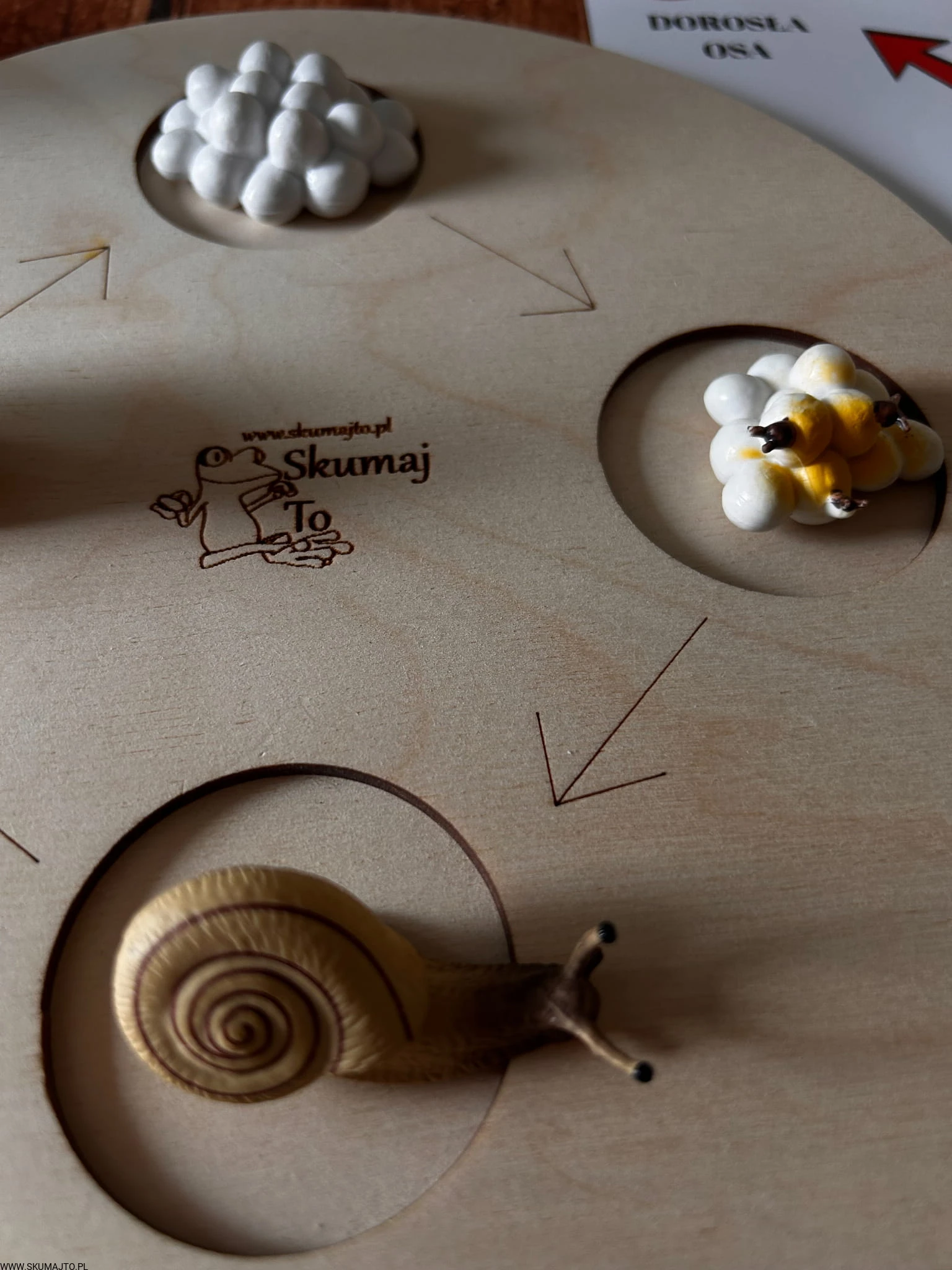Cykl rozwoju Ślimaka, drewniana układanka, figurki, Montessori
