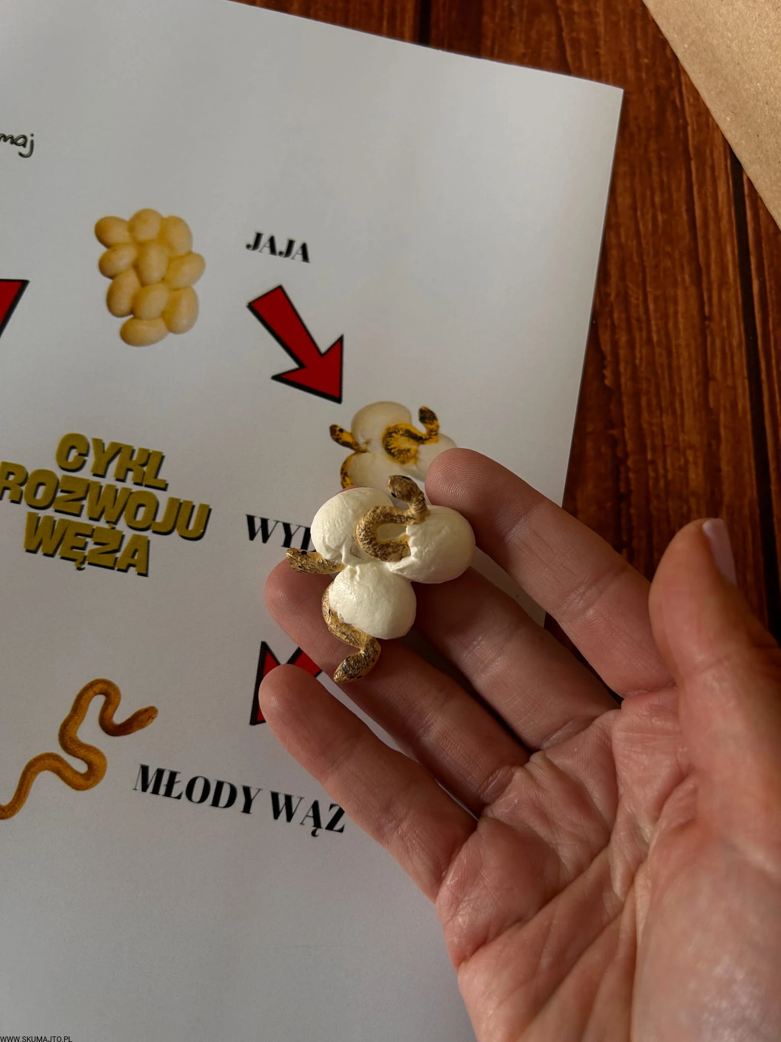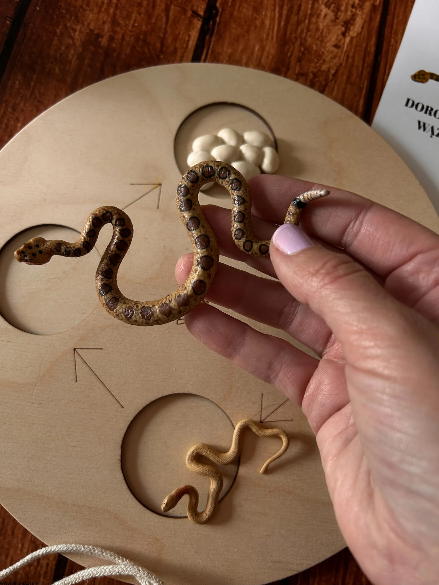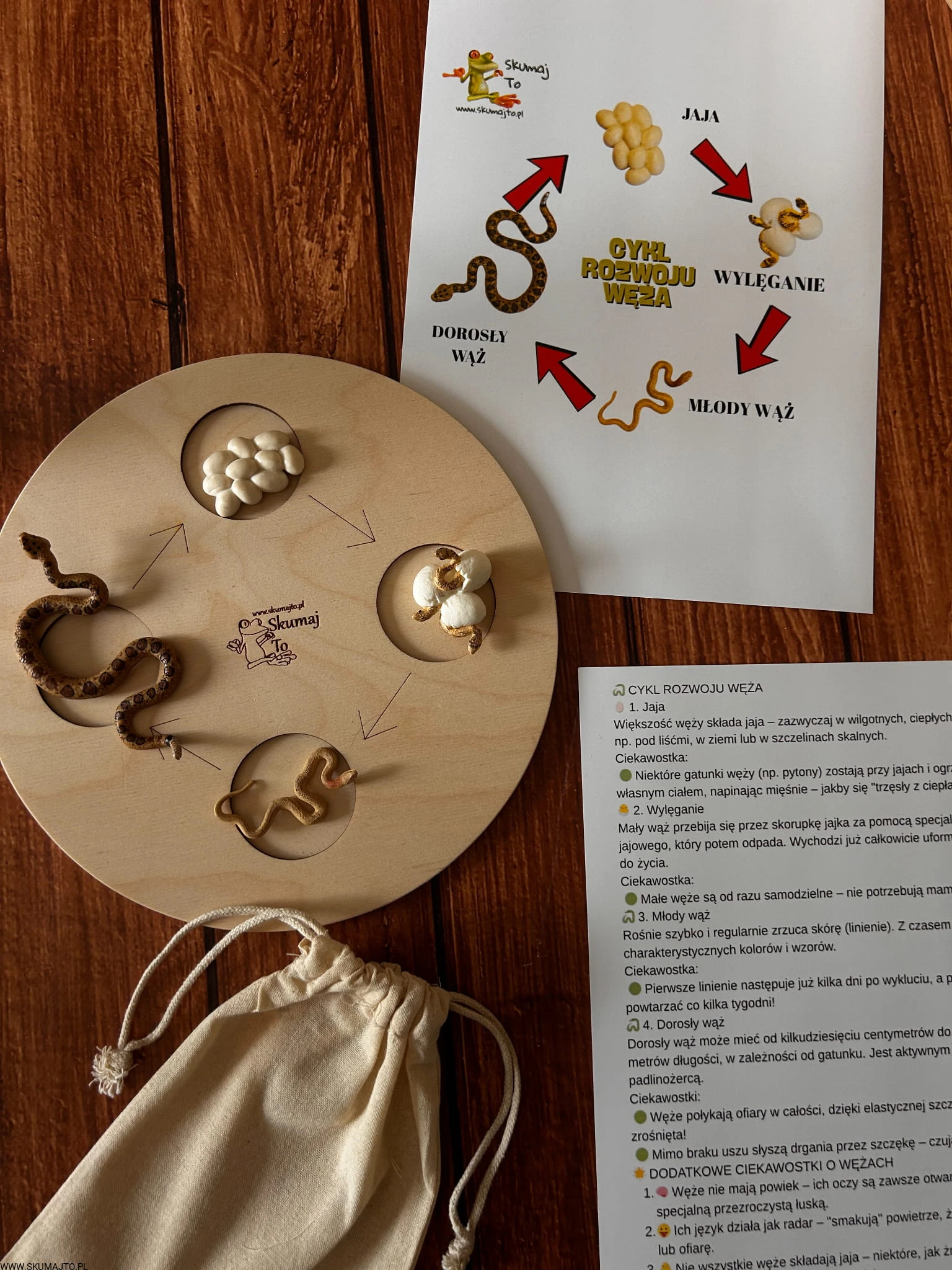 Ta układanka nie tylko odpowiada na pytania, ale pozwala dziecku samodzielnie odkrywać, dotykać i układać cały cykl życia węża – od jajka po dorosłego osobnika.