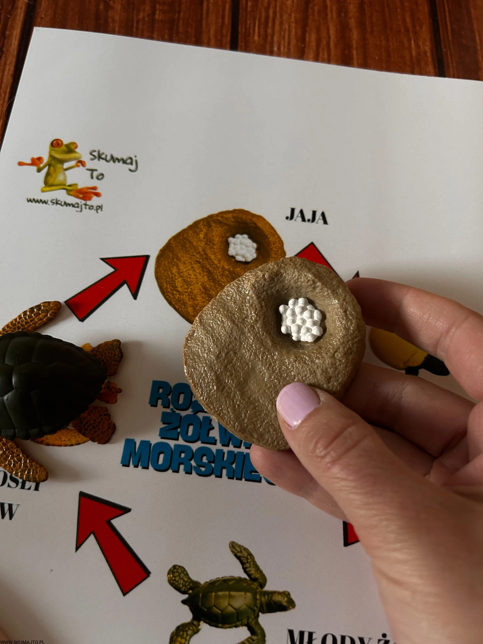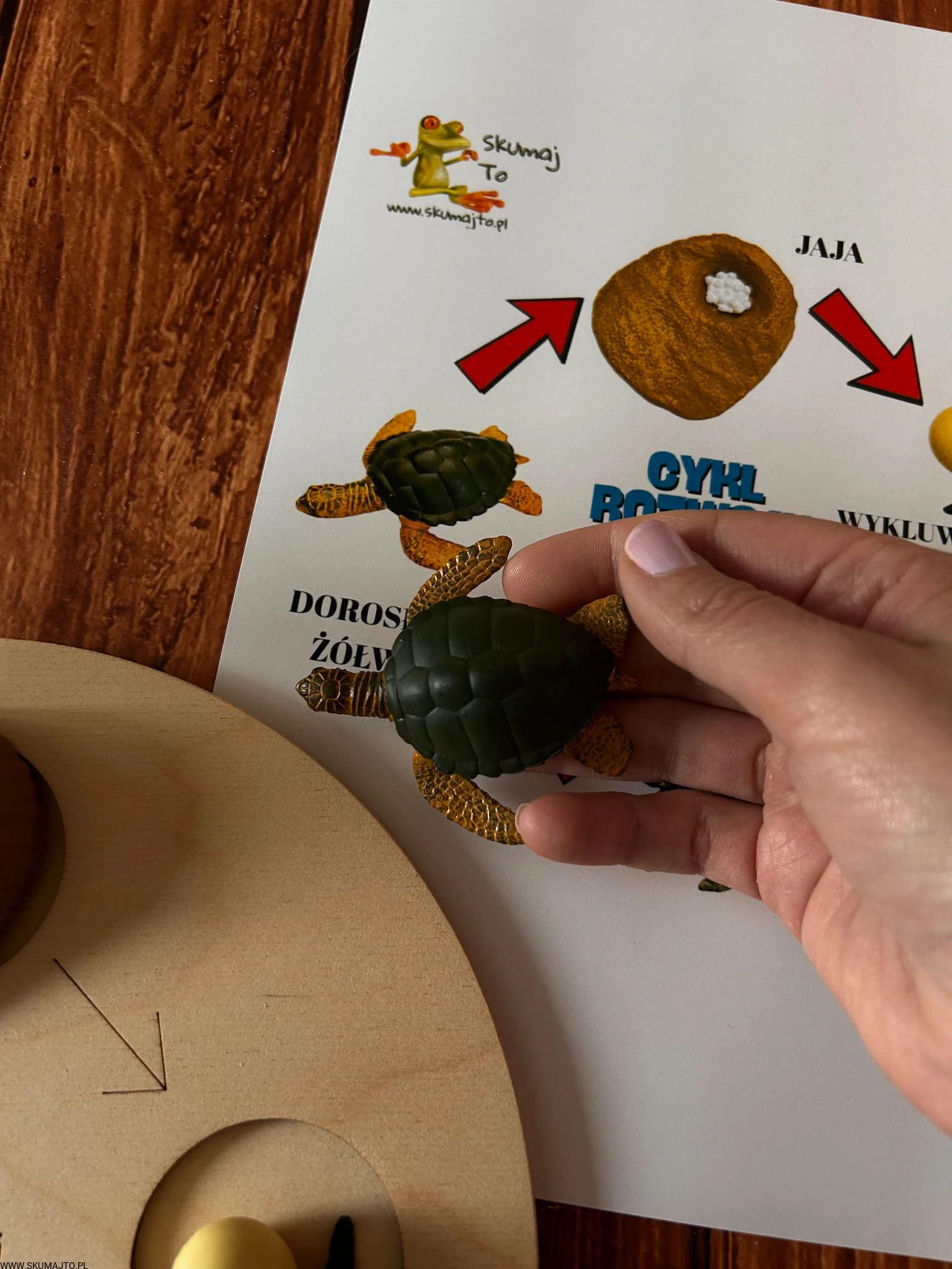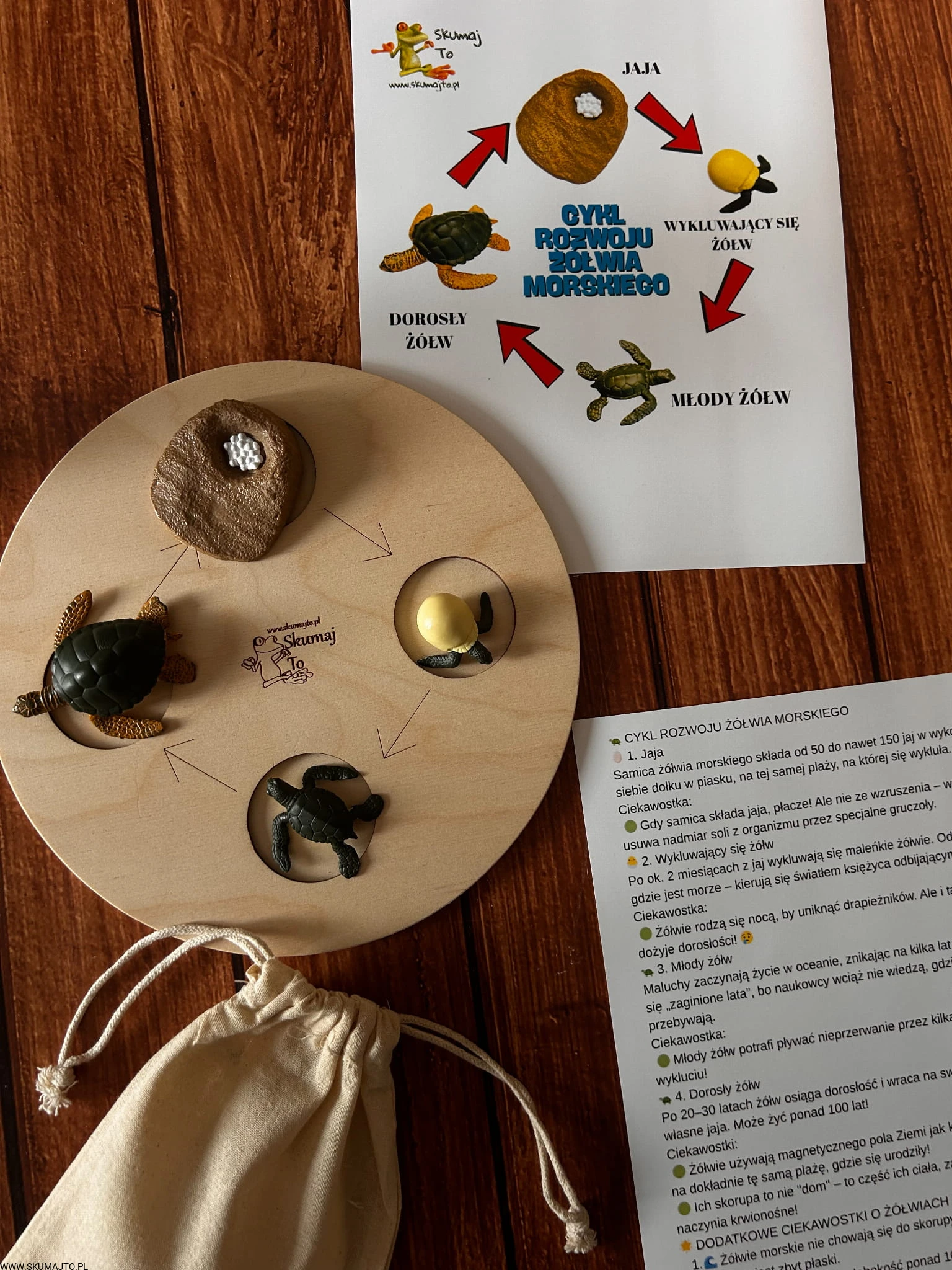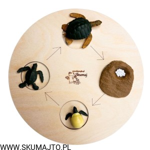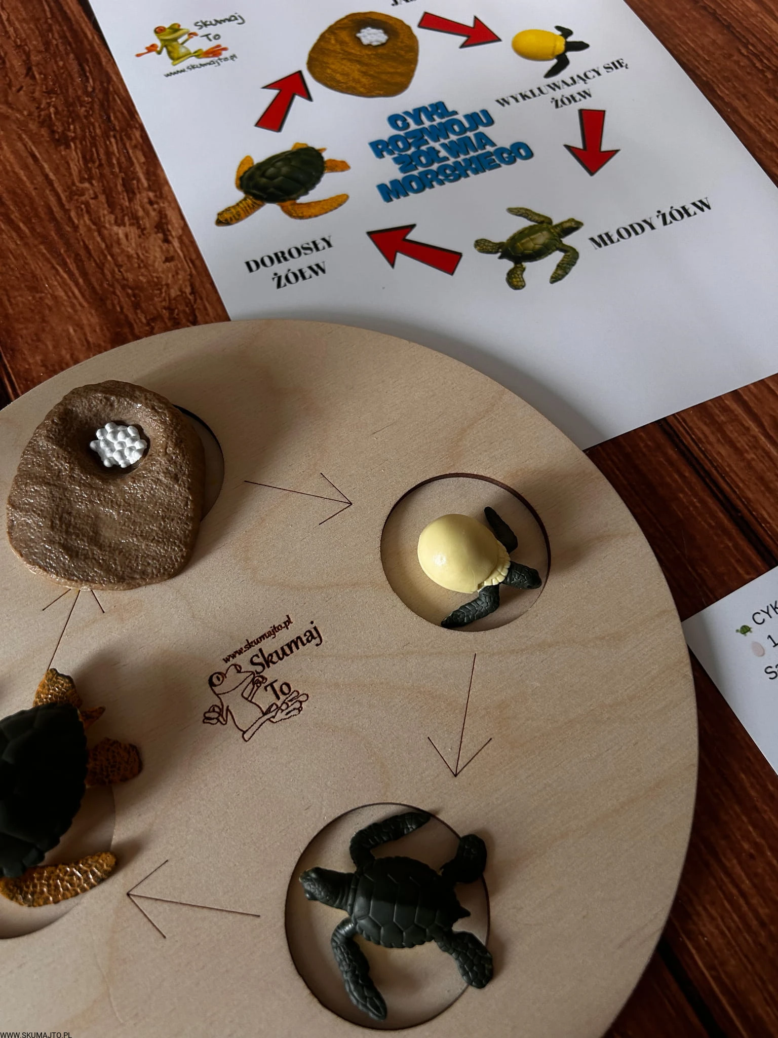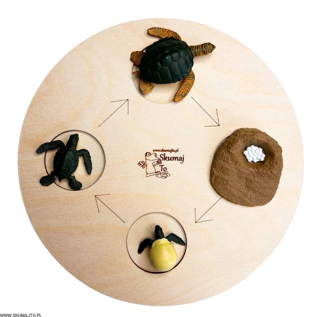 To drewniana pomoc edukacyjna przedstawiająca cztery główne etapy życia żółwia wodnego – od złożenia jaj w gnieździe, przez wykluwanie się młodych, ich marsz do wody, aż po dorosłego żółwia. Dziecko może ułożyć cały cykl samodzielnie, krok po kroku, dotykając, przesuwając i obserwując.