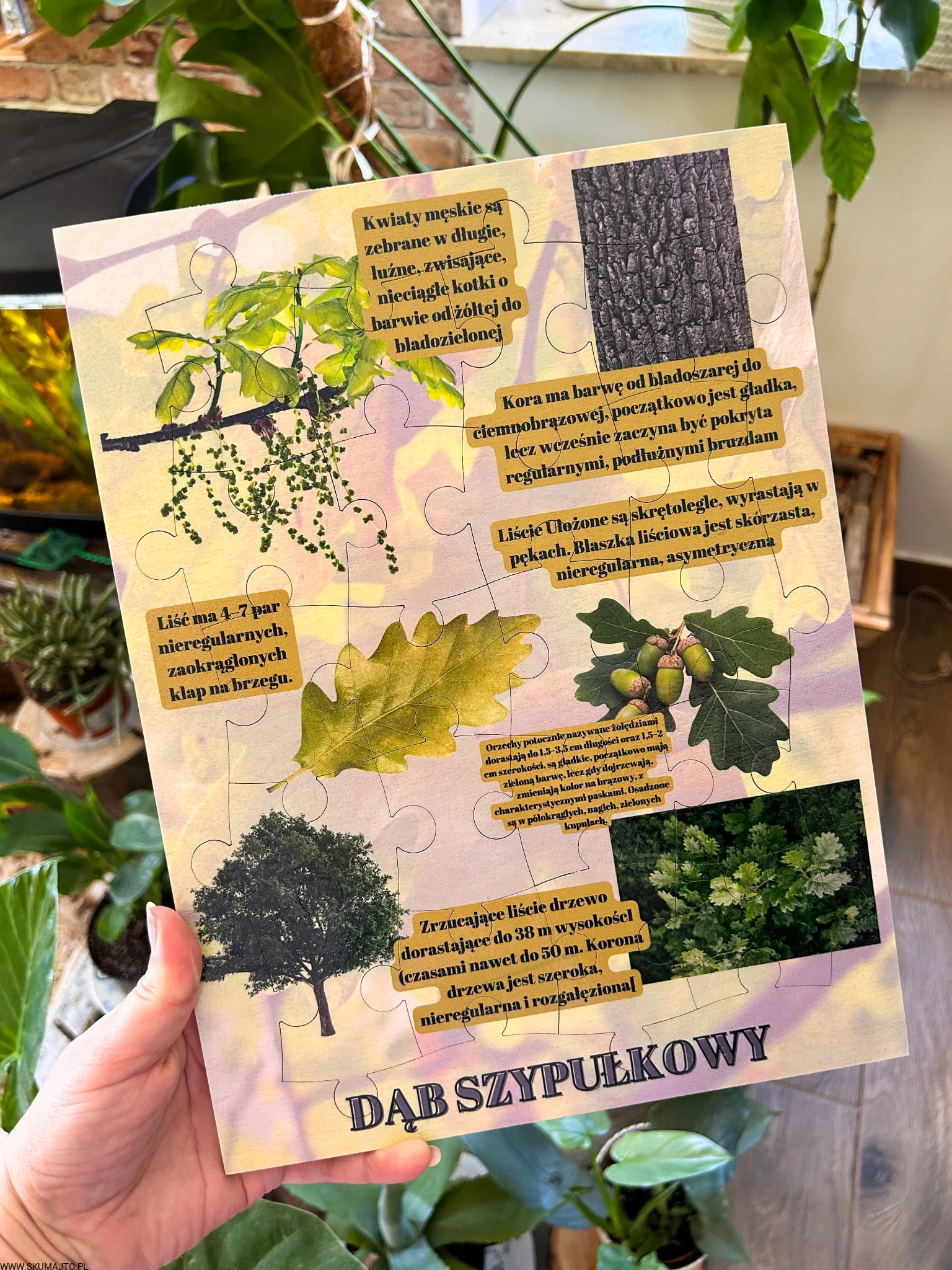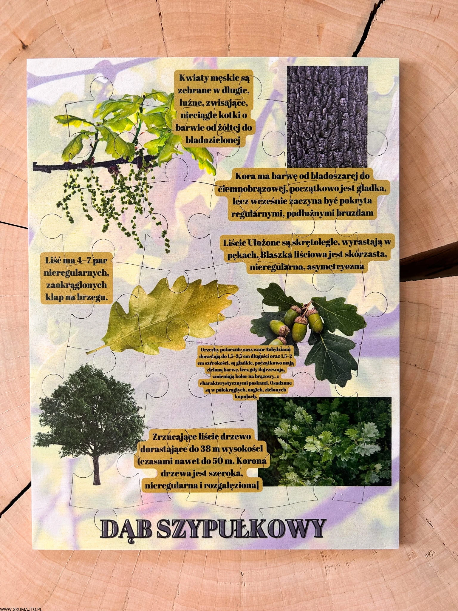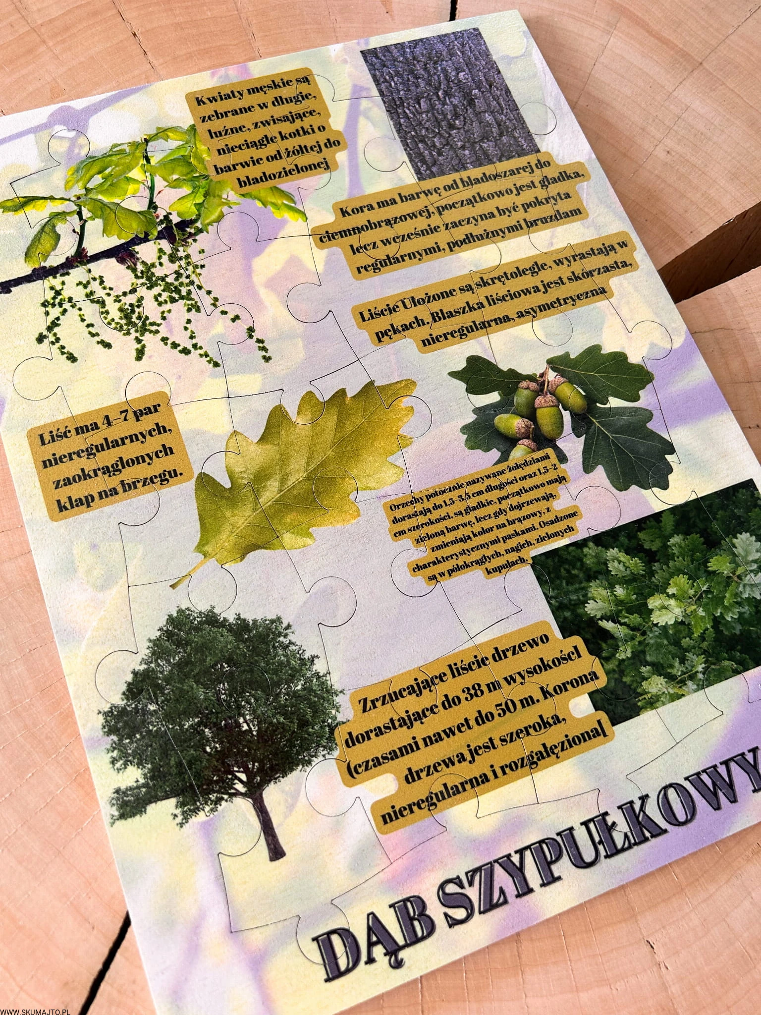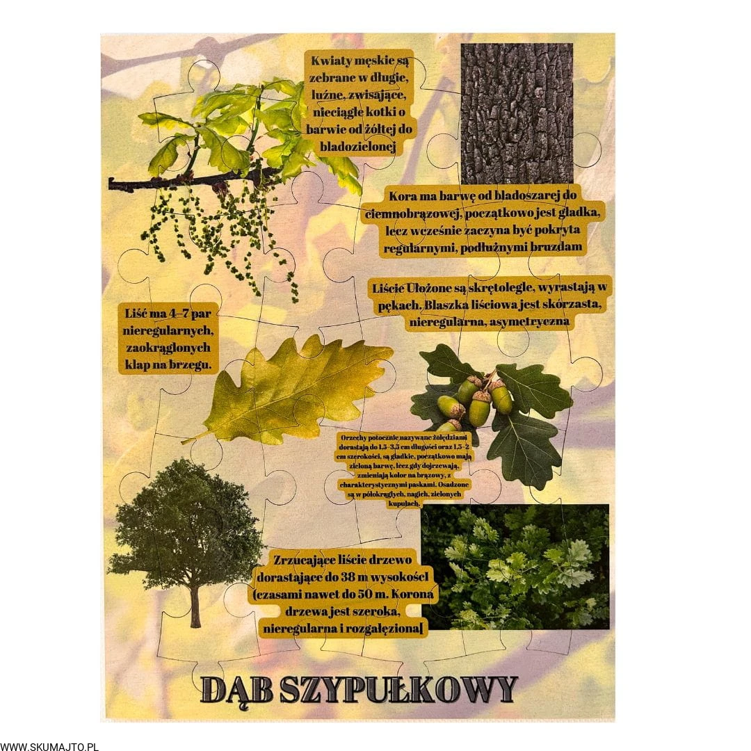 Zabawki edukacyjne, nauka przez zabawę: Nasza układanka to nie tylko zabawa, to także cenna lekcja o dębie szypułkowym. Dzieci poznają różnorodność tego drzewa i dowiadują się fascynujących faktów, rozwijając jednocześnie swoje umiejętności.