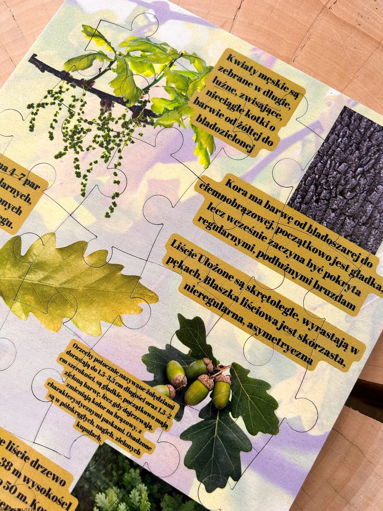 Leśne przygody w Twoim domu: Nasza układanka przenosi dzieci w magiczny świat dębu szypułkowego, gdzie mogą odkrywać tajemnice tego drzewa i jego znaczenie w przyrodzie. To prawdziwa lekcja edukacji przyrodniczej w zaciszu domowym.