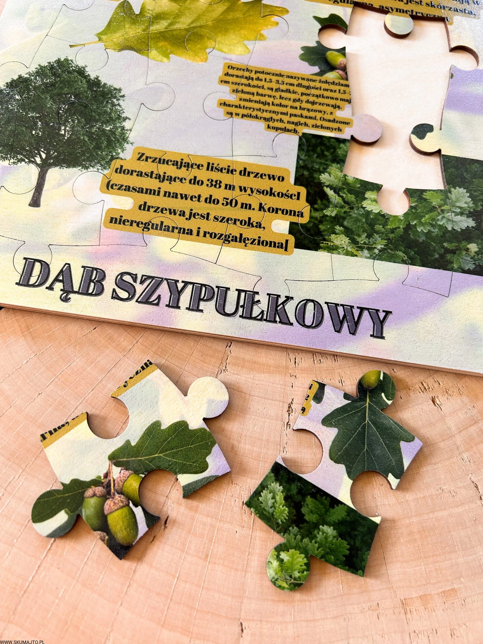 Dąb szypułkowy, układanka drewniana, edukacja leśna
