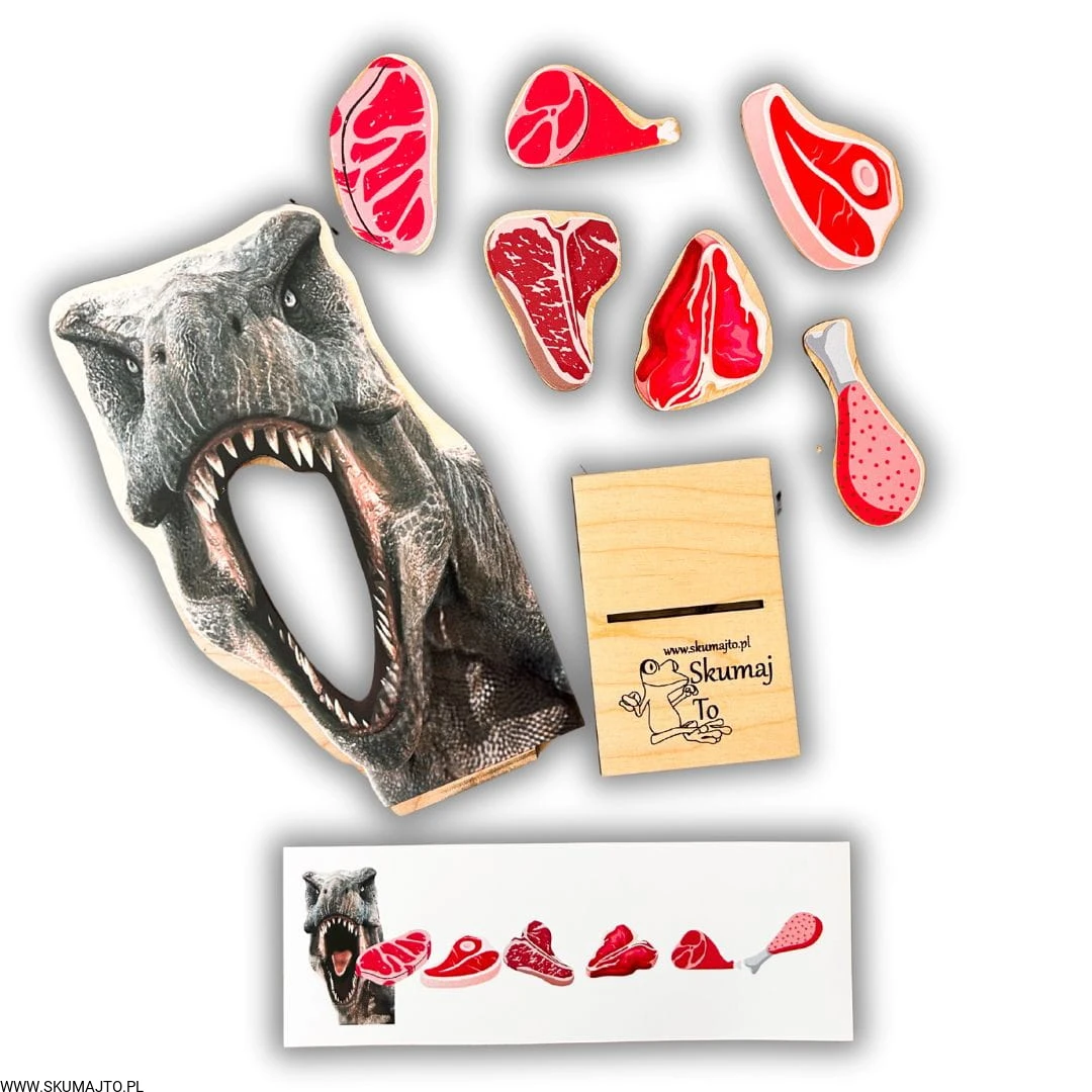 Dziecko musi dopasować kawałki mięsa do paszczy dinozaura zgodnie z kartami do odwzorowywania. To świetny trening dla małych rączek – rozwija precyzję ruchów, koordynację oko-ręka i cierpliwość.