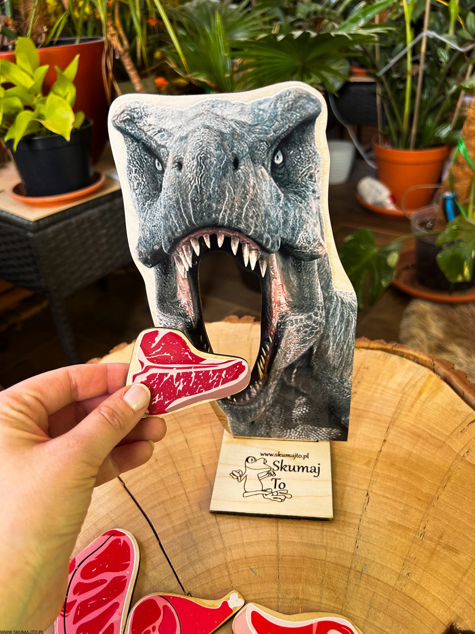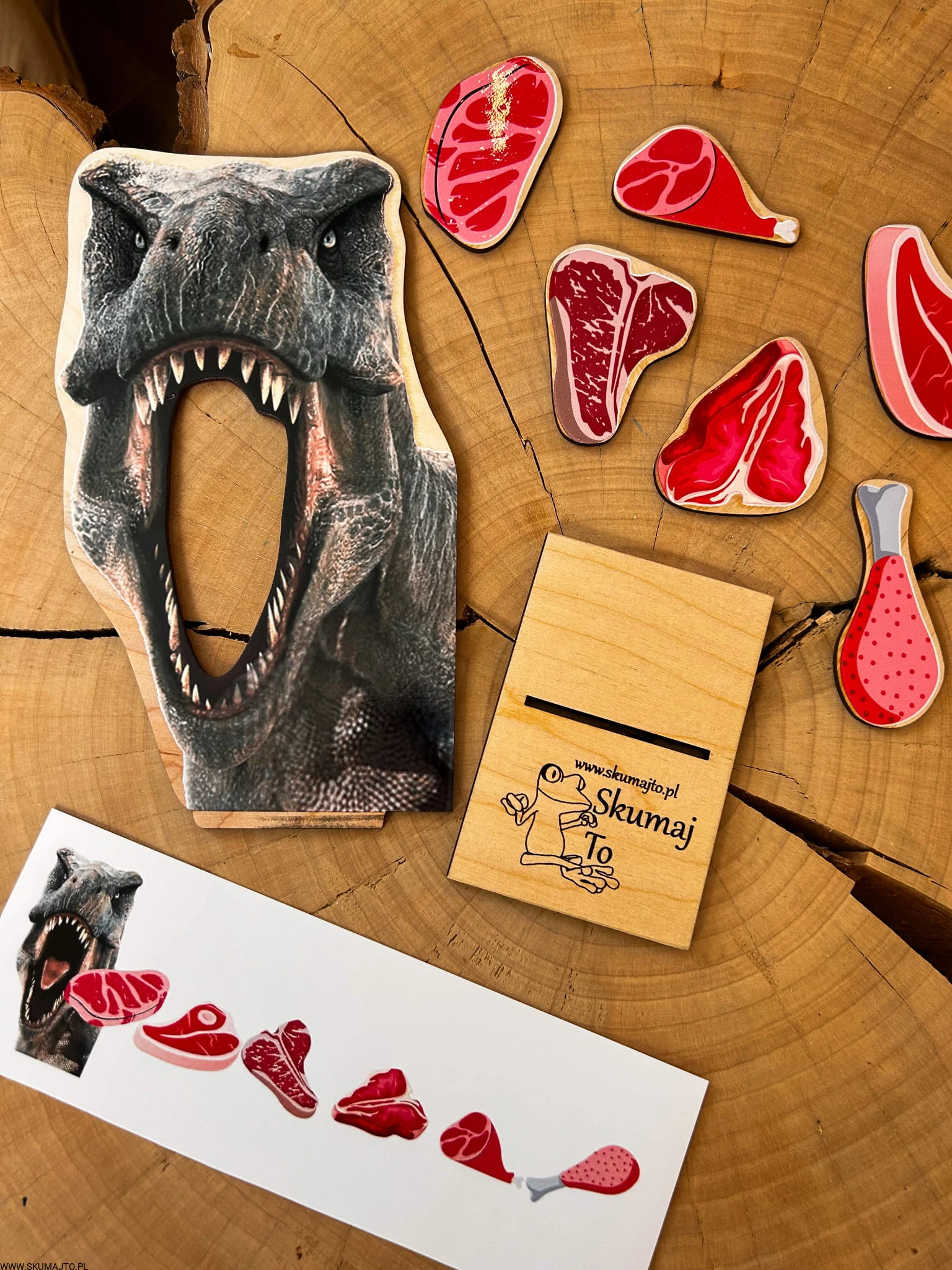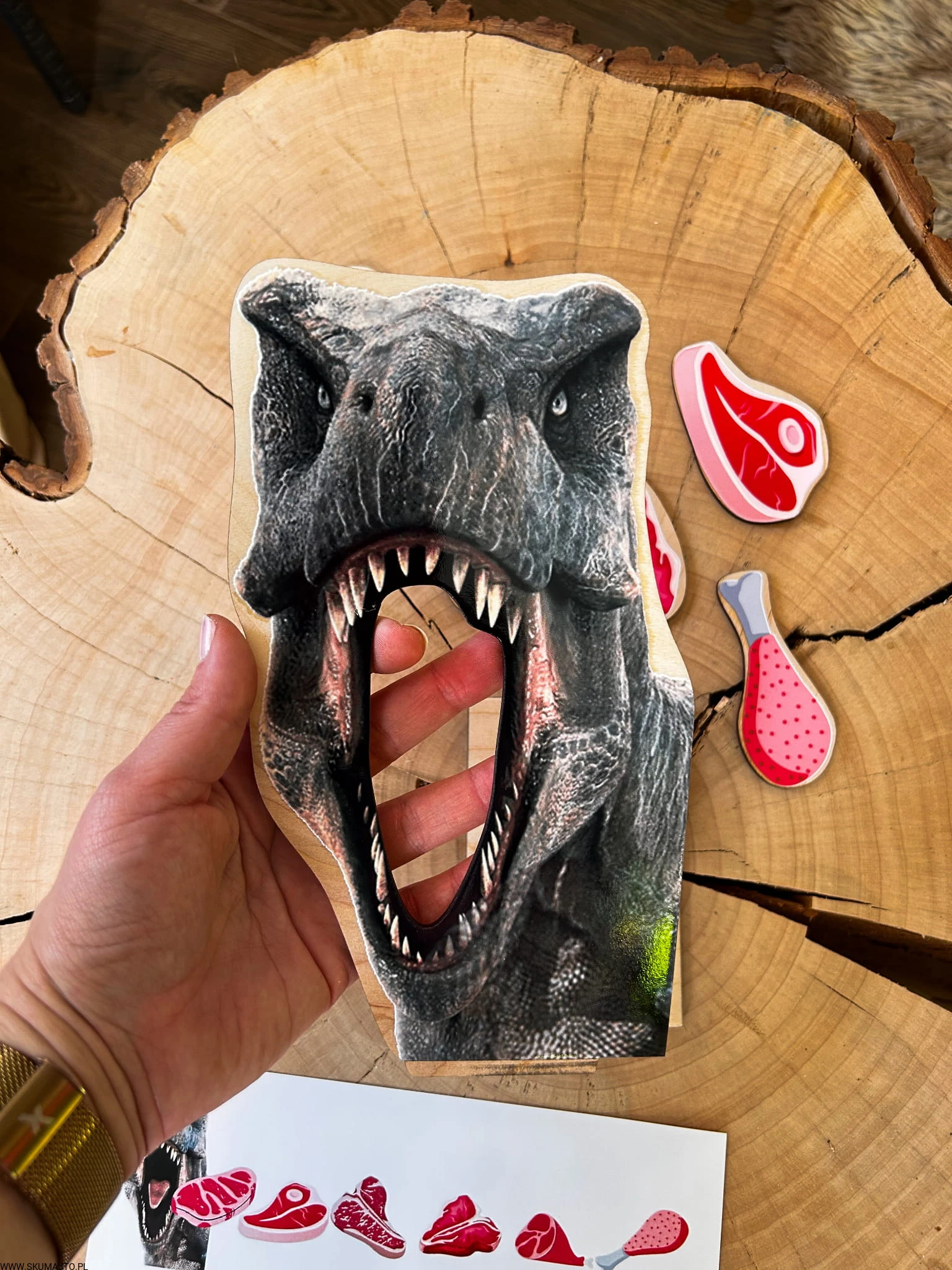 ✔️ Drewniana podstawka – stabilna baza, na której układamy dinozaura.