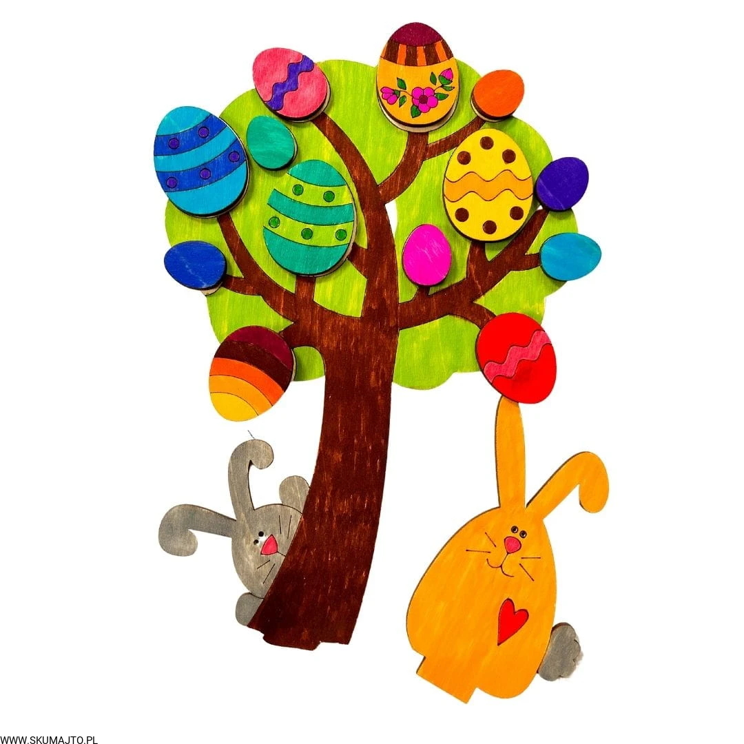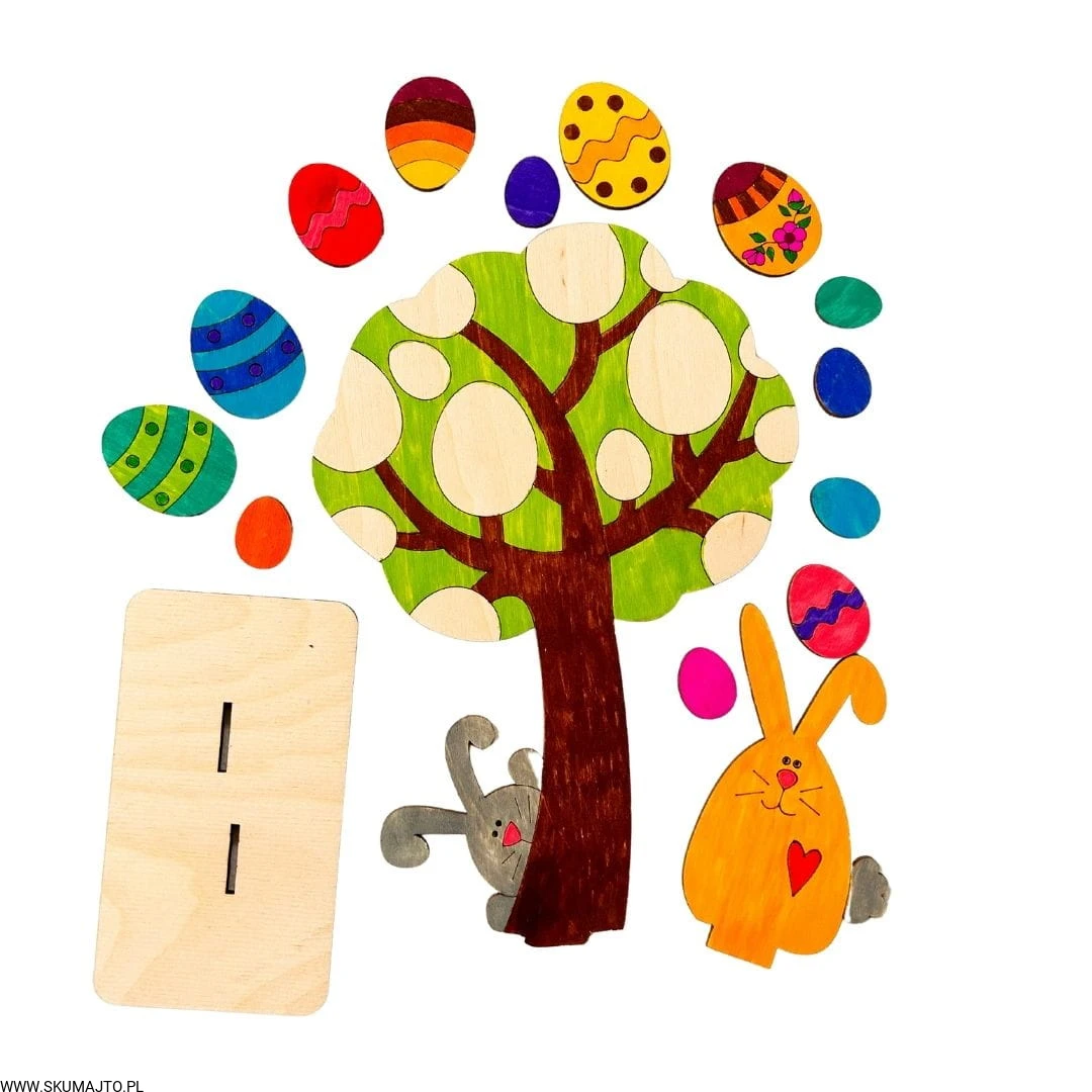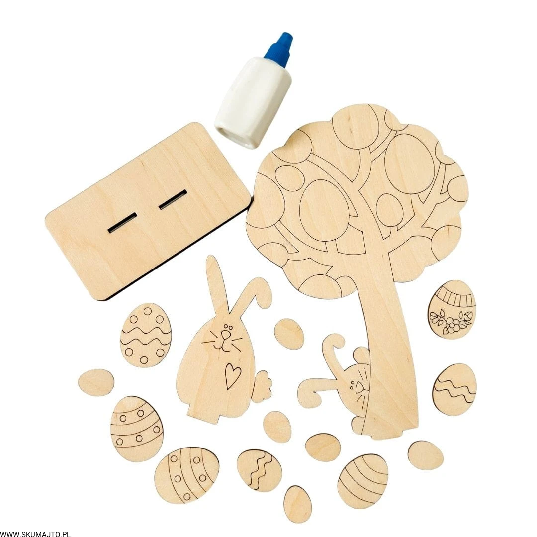 - Sklejanie: Za pomocą dołączonego kleju do drewna, przyklej pisanki do drzewka, tworząc piękną ozdobę wielkanocną.